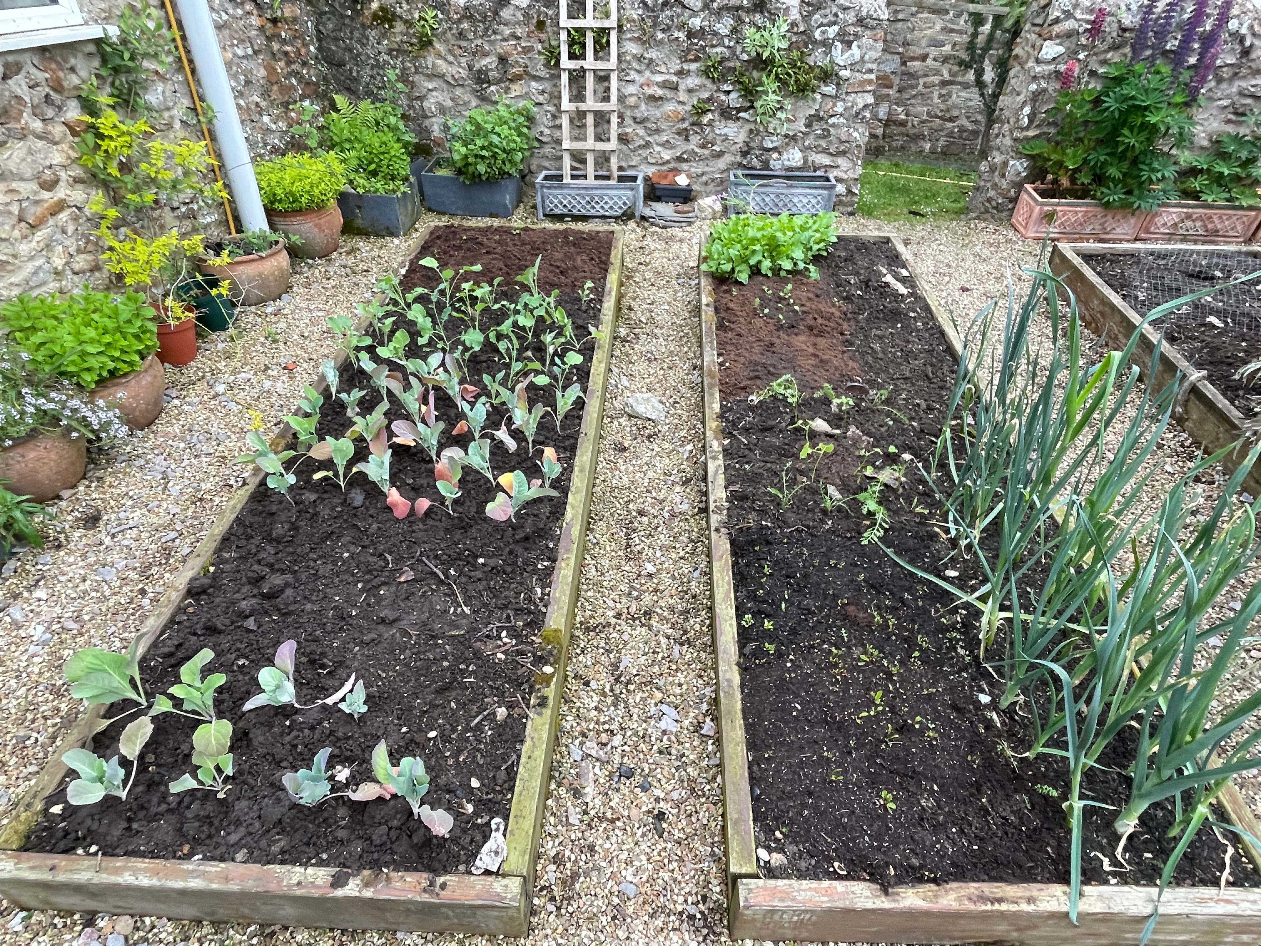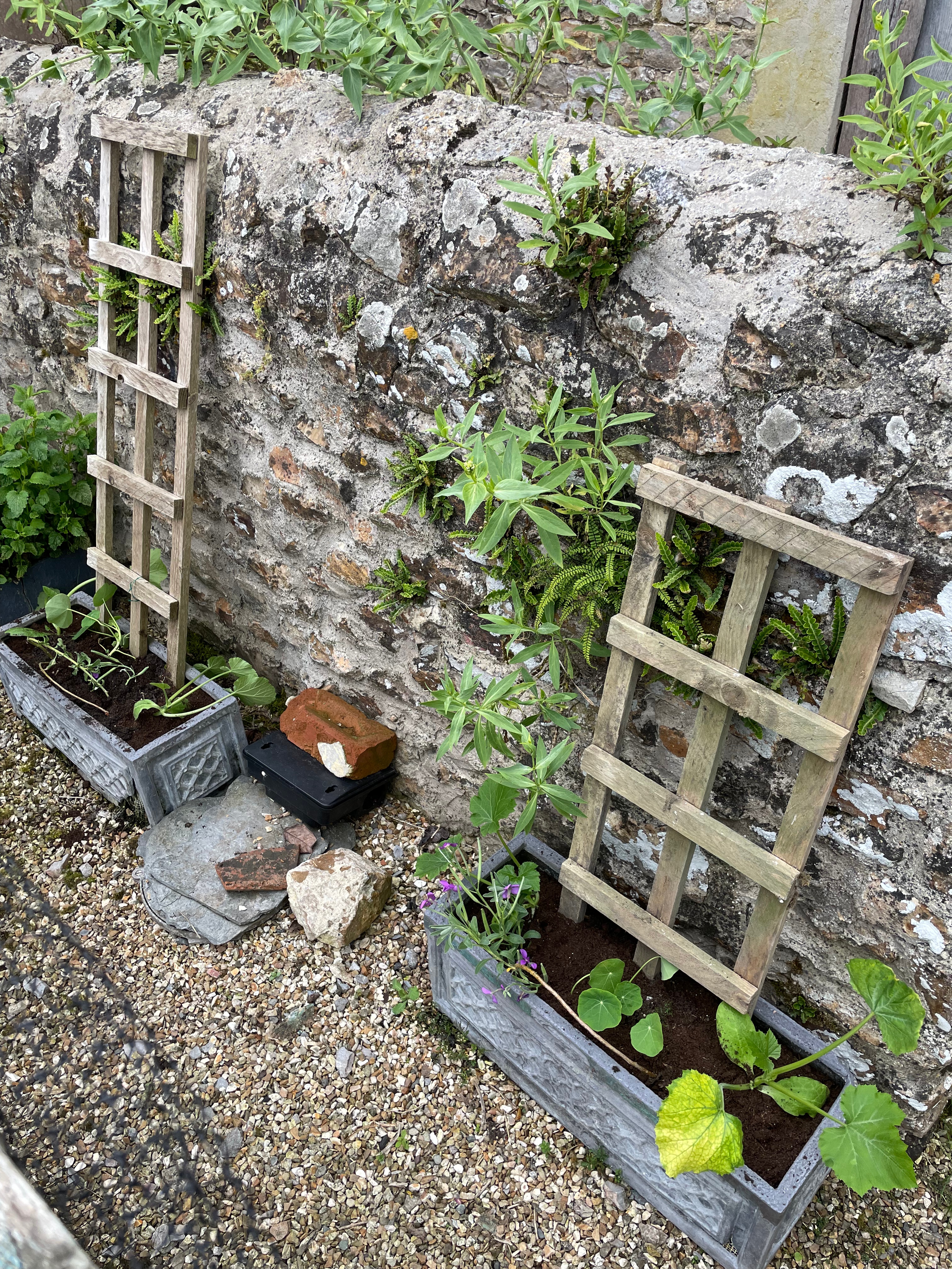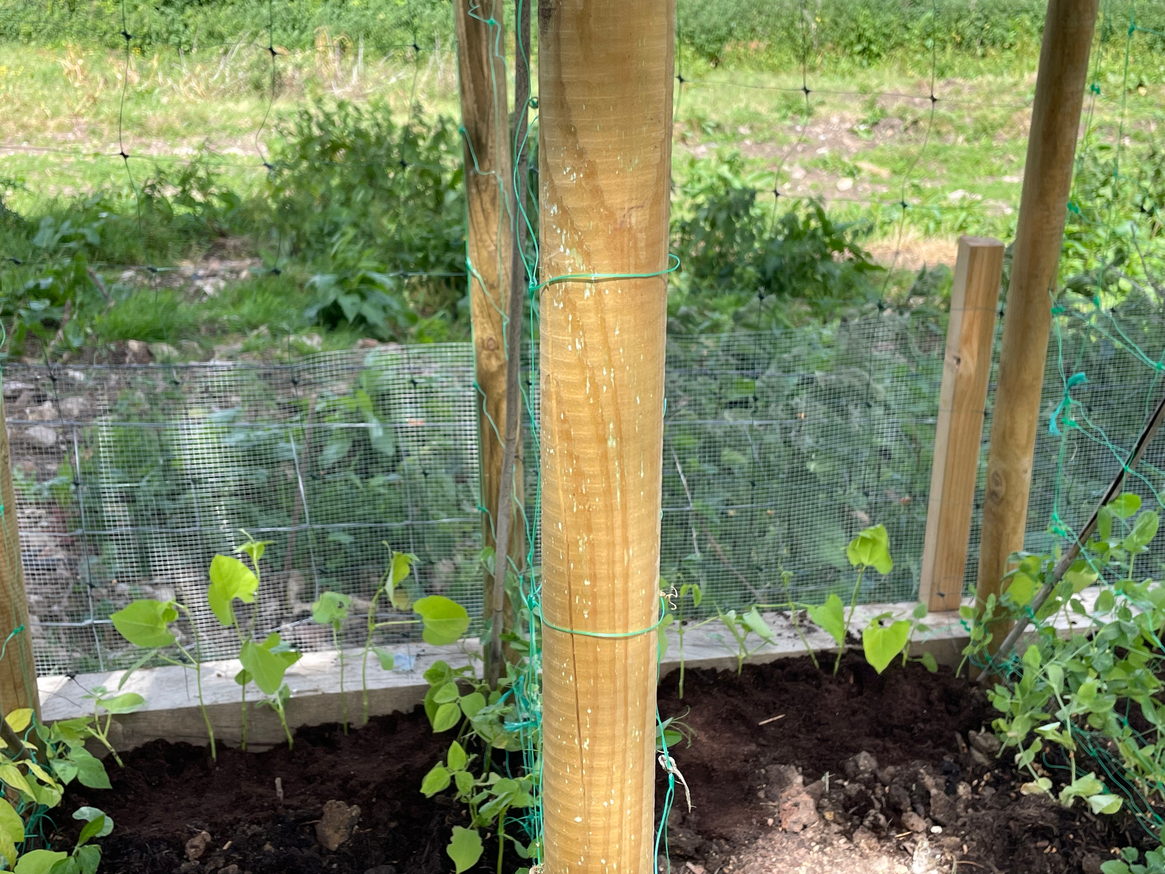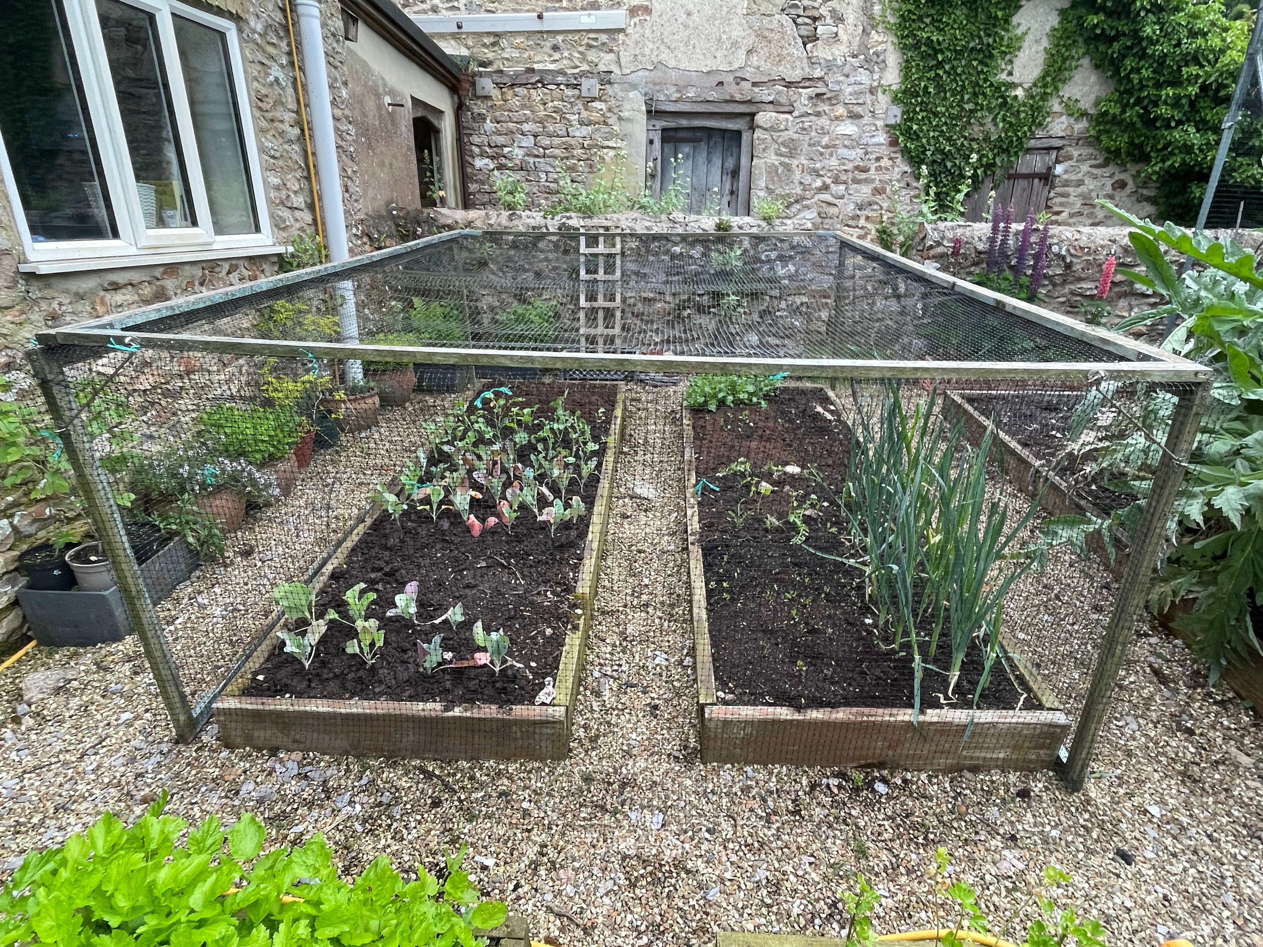 John repaired both our sweet pea corner frame and the blackberry arch in the orchard, which had been damaged by one of the winter storms. We’re also experimenting with a new sweet pea wall – since we took the ivy off the kitchen garden wall and had it beautifully repaired by our neighbour’s dad, we’ve now draped a net over it and planted sweet peas in pots at the bottom. Hopefully they’ll take and we’ll have a wall of sweet peas by the walk to the games room that attracts pollinators to both the kitchen garden and the orchard vegetable beds.