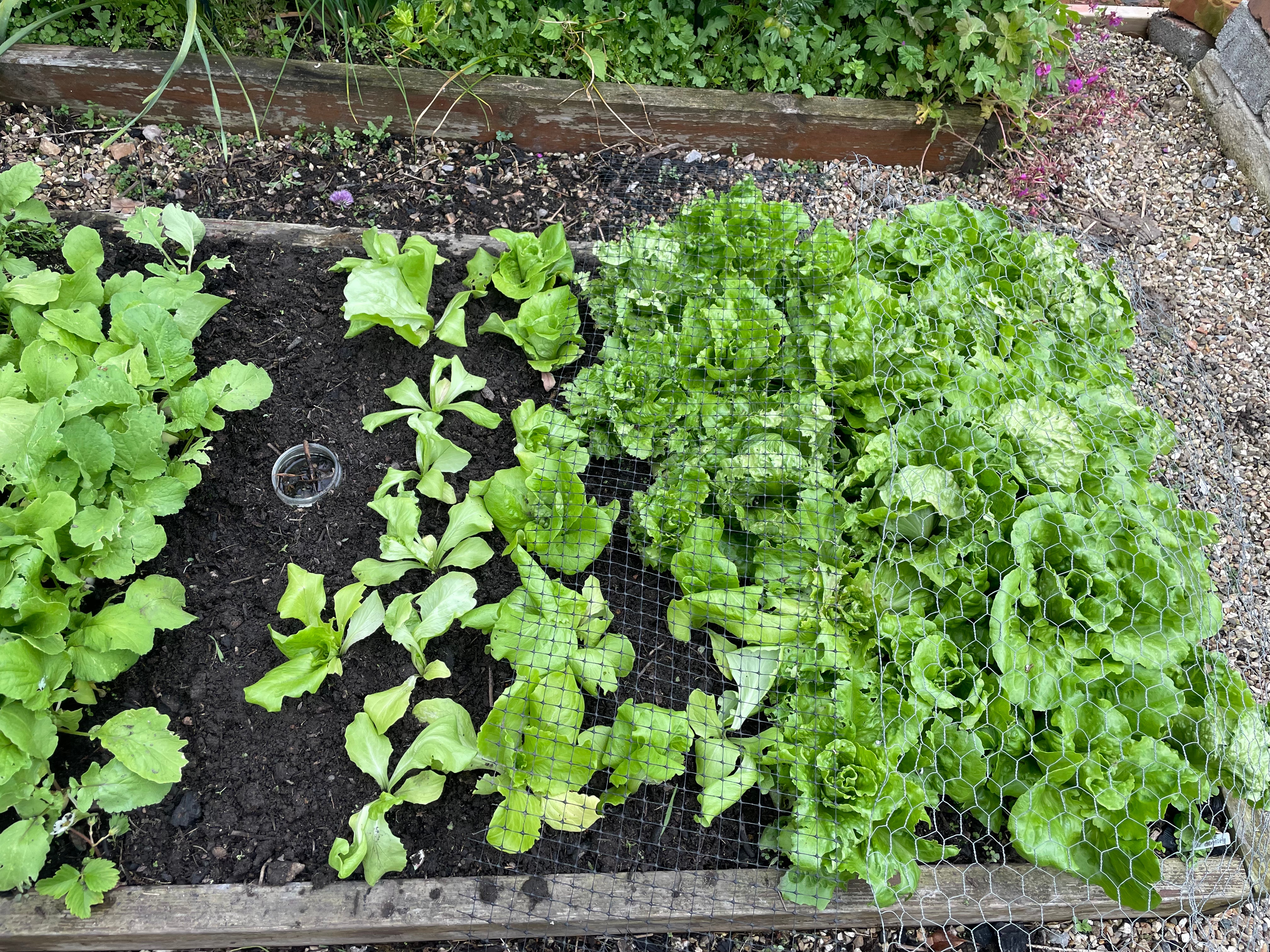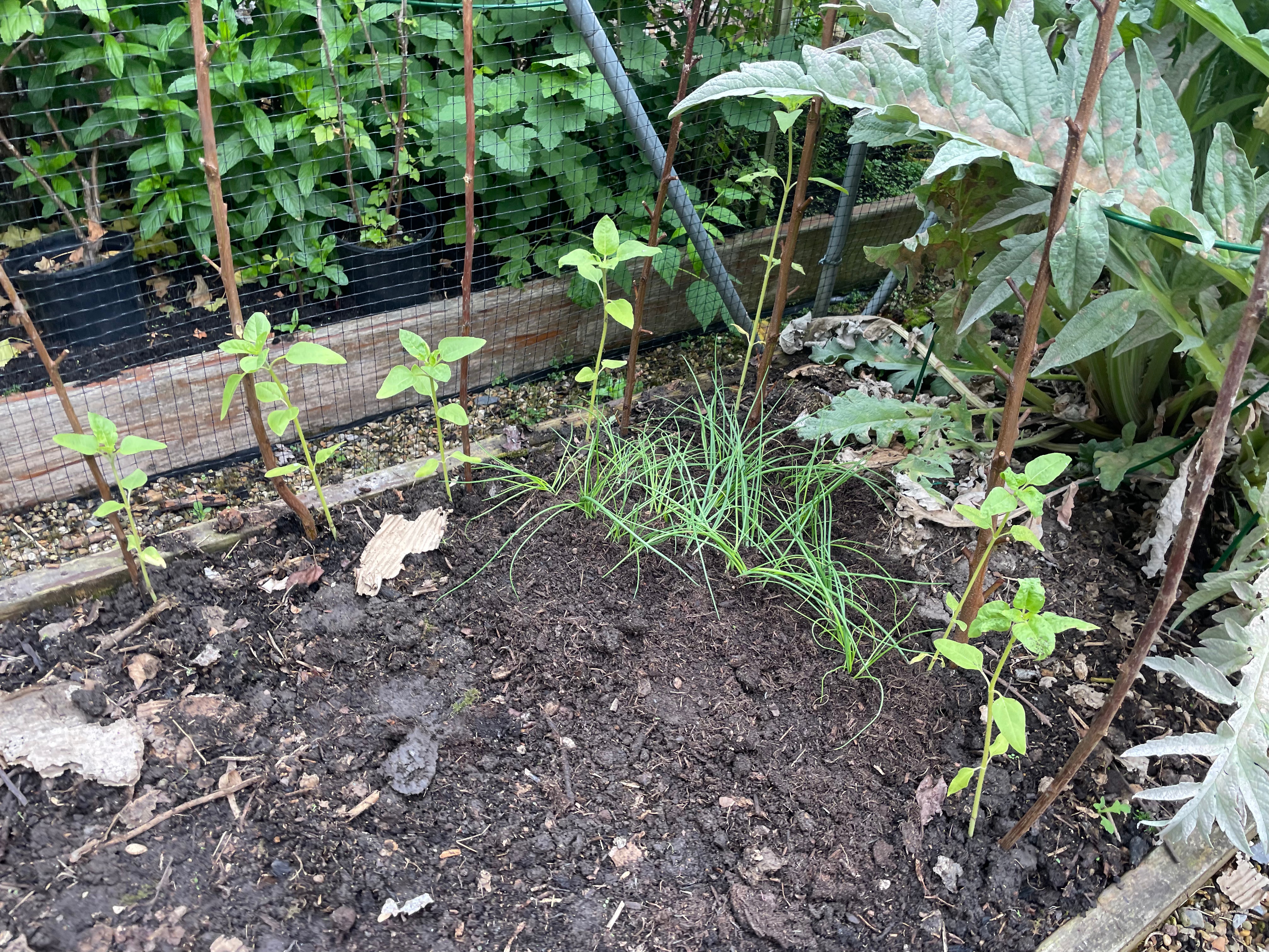 We also planted out spring onions, sunflowers and lettuce in the beds, and courgette, nasturtium, tomatoes, marigolds and stocks in planters in the kitchen garden. We’re trying to mix vegetables with pollinator flowers – the nasturtium and stocks are an added bonus as they’re edible flowers. We potted up our first set of tomatoes out with marigolds and carnations and moved them down to our house where we have a bit more space. And we planted out the climbing beans in the pea and bean frame – we had to add extra netting between the poles at the back to make space for all the plants, but fortunately we had a piece that fit perfectly. It’ll be exciting to see how the peas and beans turn out in our new bed!