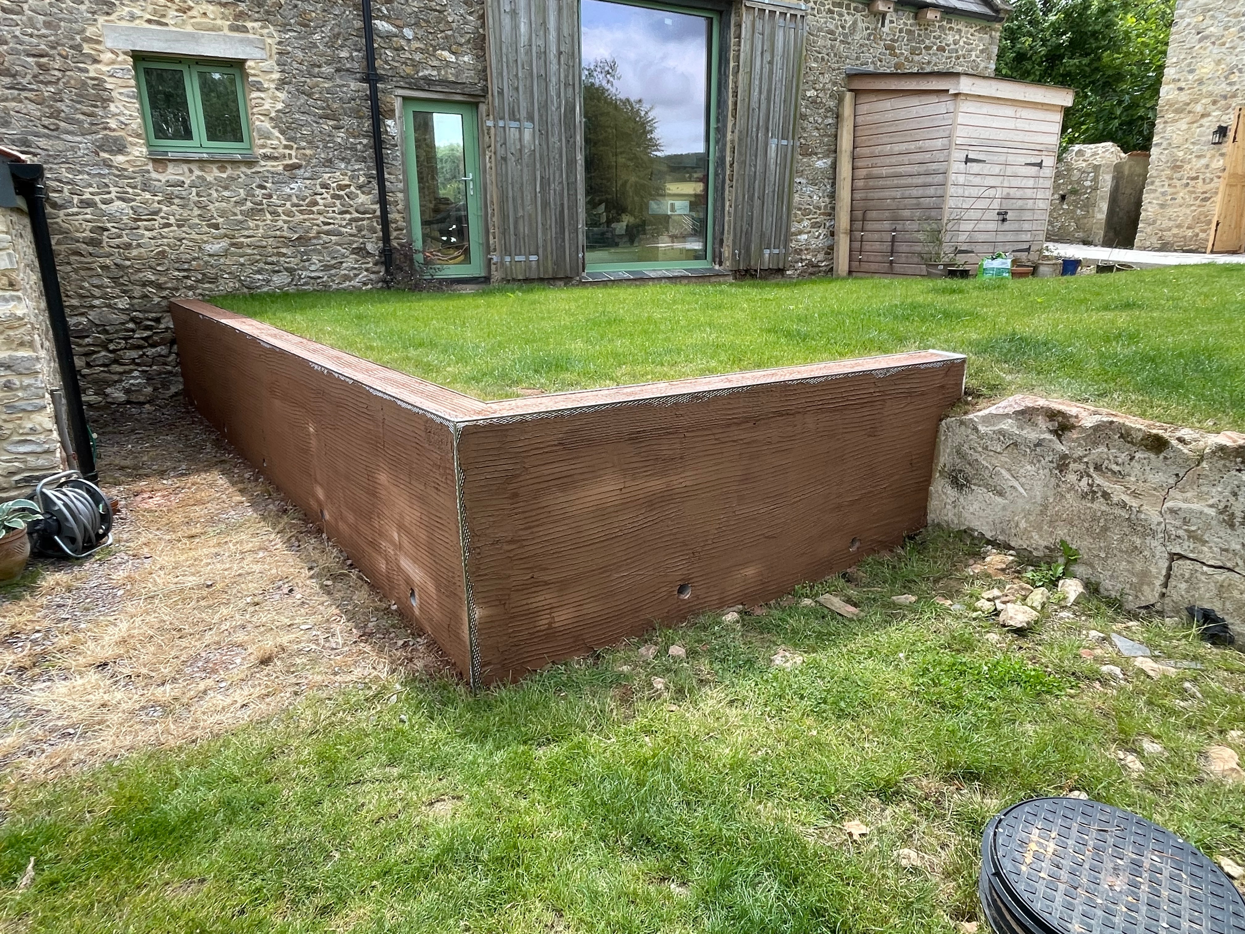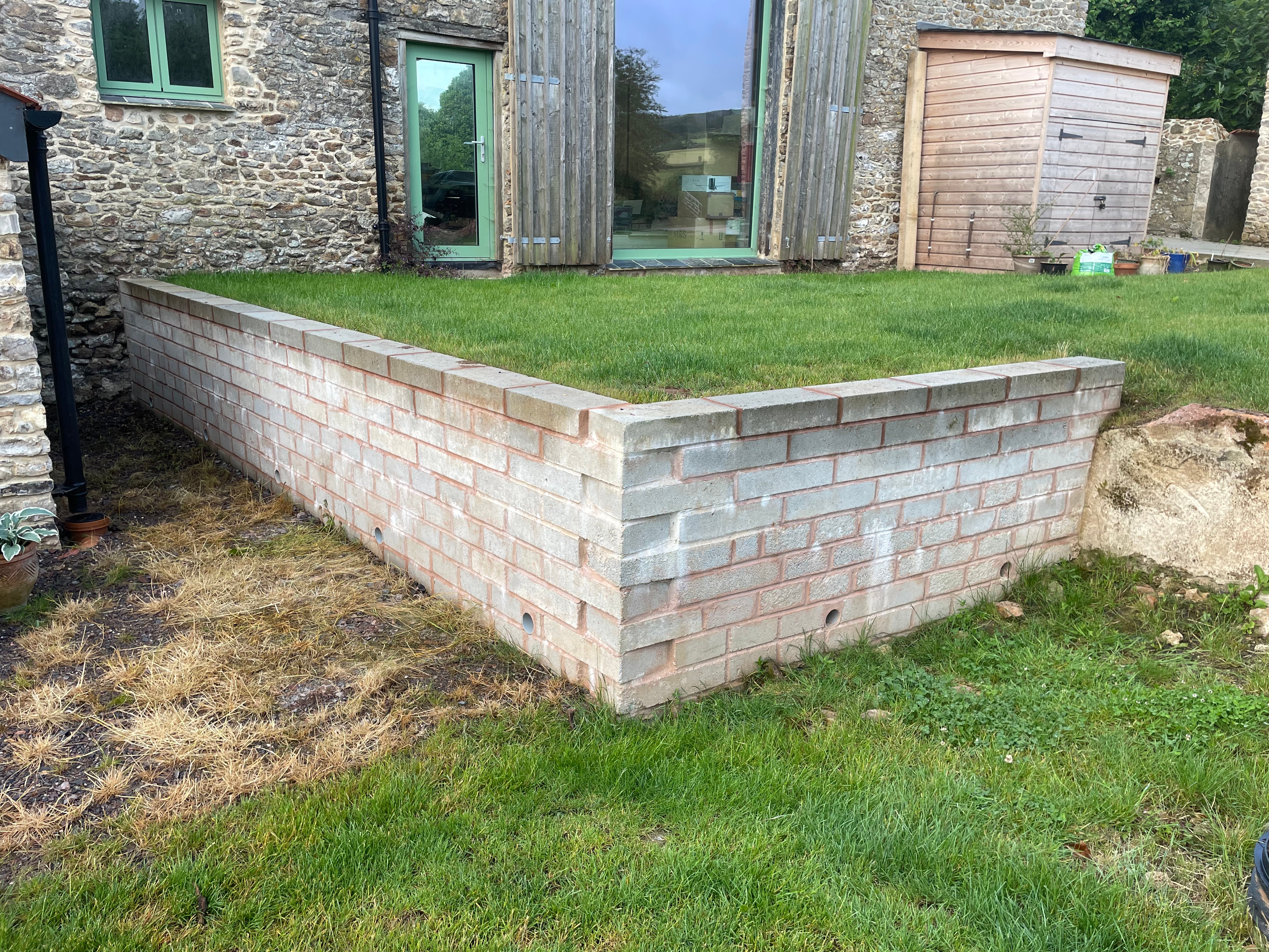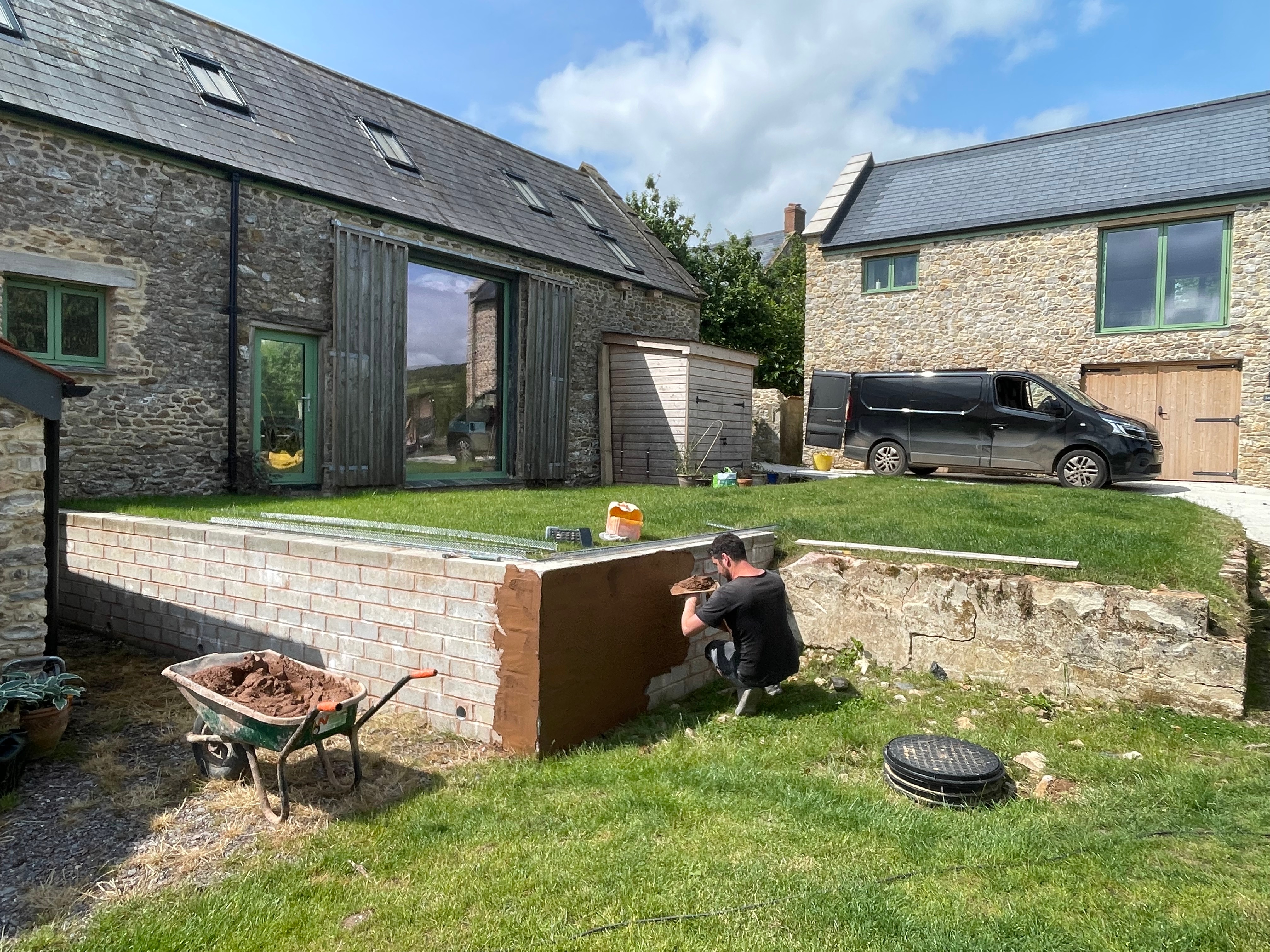 And we’ve finally made a start with our own garden – at least, we’re paying someone else to!! We’ve got a lot to do to make it a usable space including laying a patio and creating a stone-faced raised flower bed as a retaining support for the cracked old garden walls for the three-bed barn next door (which sits about a metre higher than our garden). The other breeze block walls were built specially by our builders as retaining walls so don’t need supporting in any way. We’ve started by rendering these breeze block walls – one of which will form part of the flower bed and one that will be left open. As the open wall runs parallel to our extension alongside a fairly small space that doesn’t get sunlight, our long-term plan is to add a roof and turn this into our wood store but that’s a couple of years away. Because of this it’s not worth facing this with stone – and this would also take up extra space that we don’t want to lose – so we decided to render it instead and paint it the same colour as the front of the shippon.