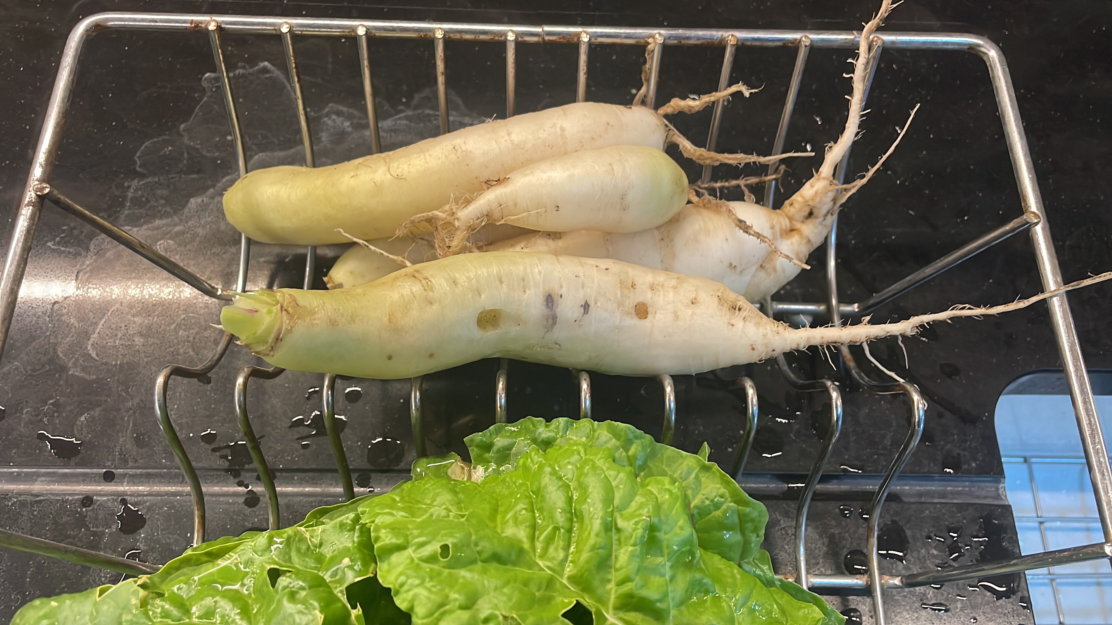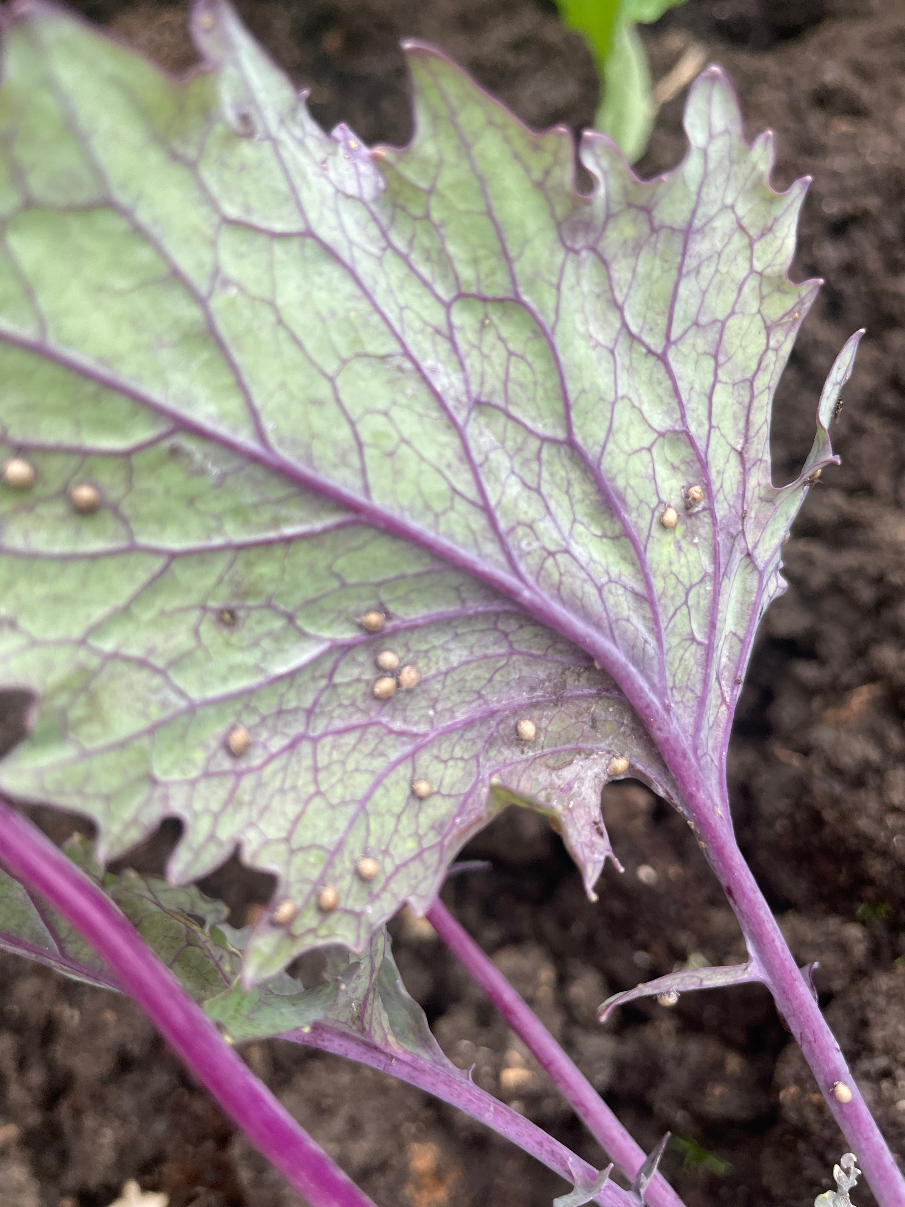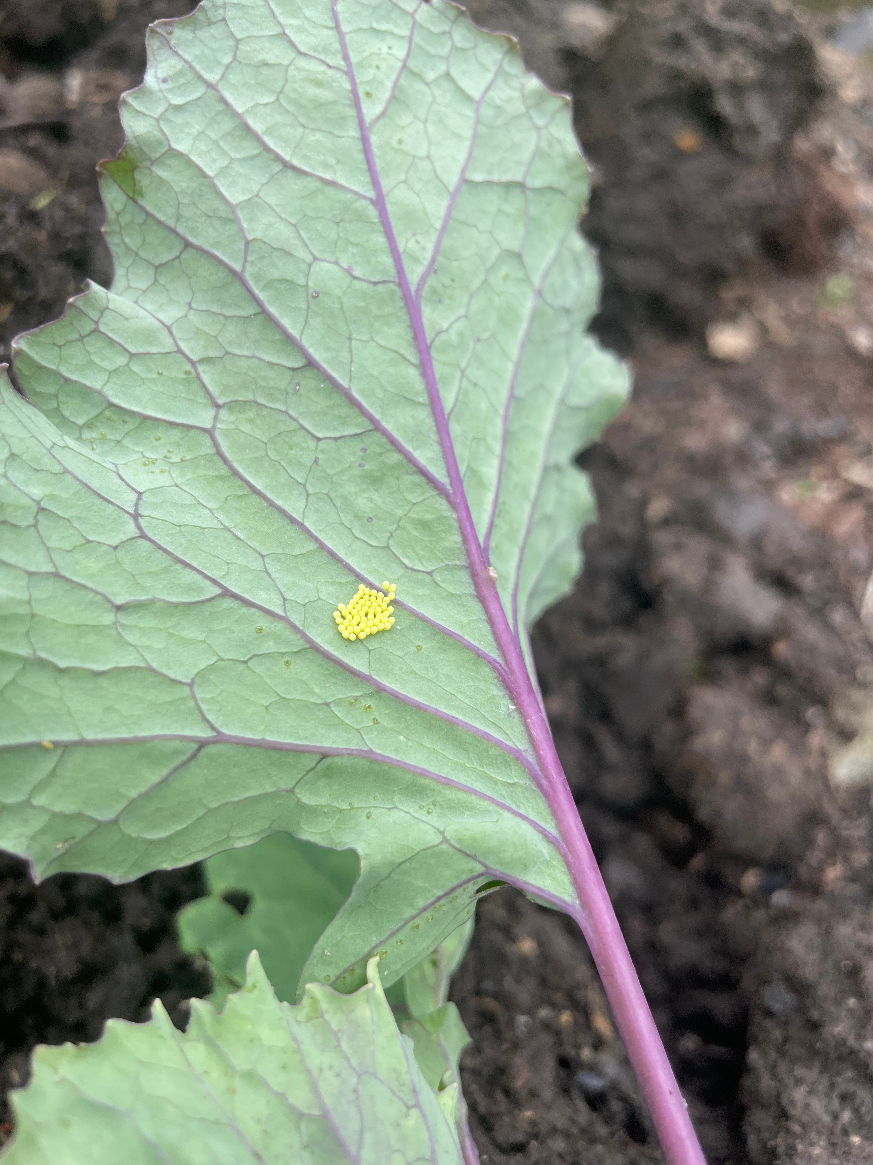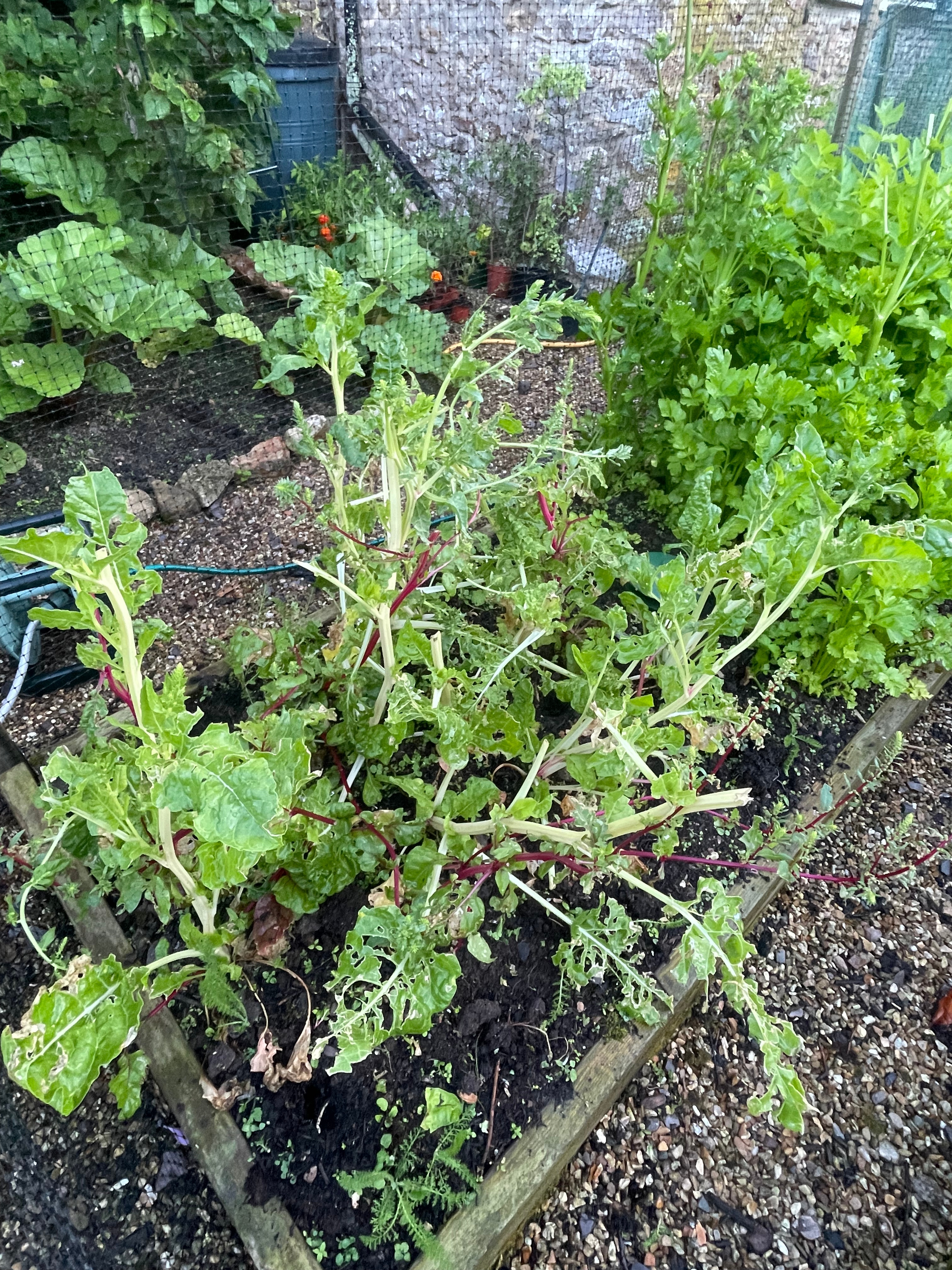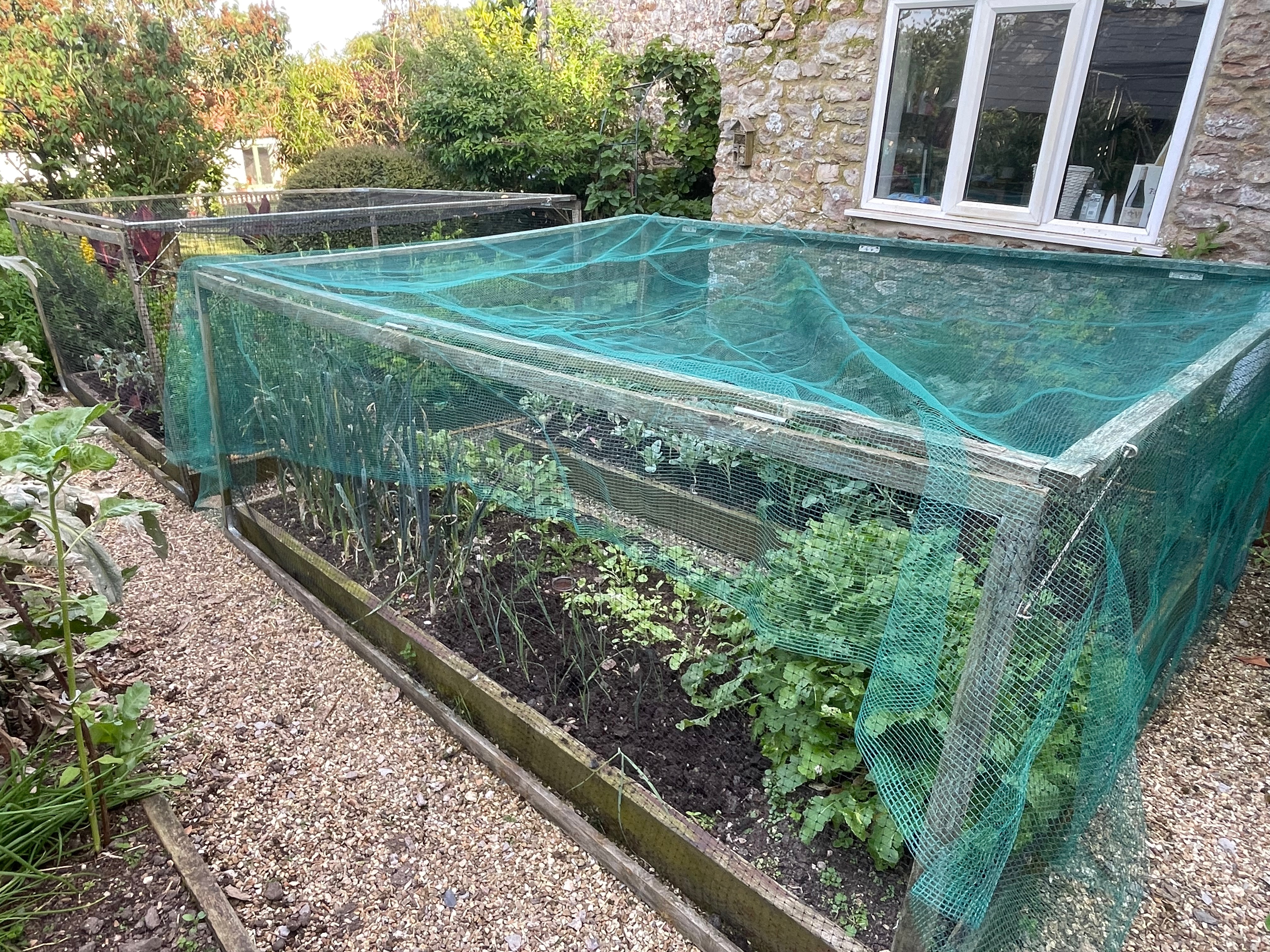I had hoped to pull the bolted chard and lettuce up and replace them, however the discovery of butterfly eggs on the kohlrabi and kale (and then on the broccoli that was supposedly already covered) meant it took twice as long to check them all and remove any leaves with eggs on. Hopefully I got them all – and maybe some of the eggs will still survive on the leaves in the compost. We moved the second vegetable bed cover up to the kitchen garden and covered the last two beds; and I put a finer mesh insect net over the first cover with the broccoli, cauliflower and cabbage in. Somehow birds are still getting into the cover so this may put a stop to that too!