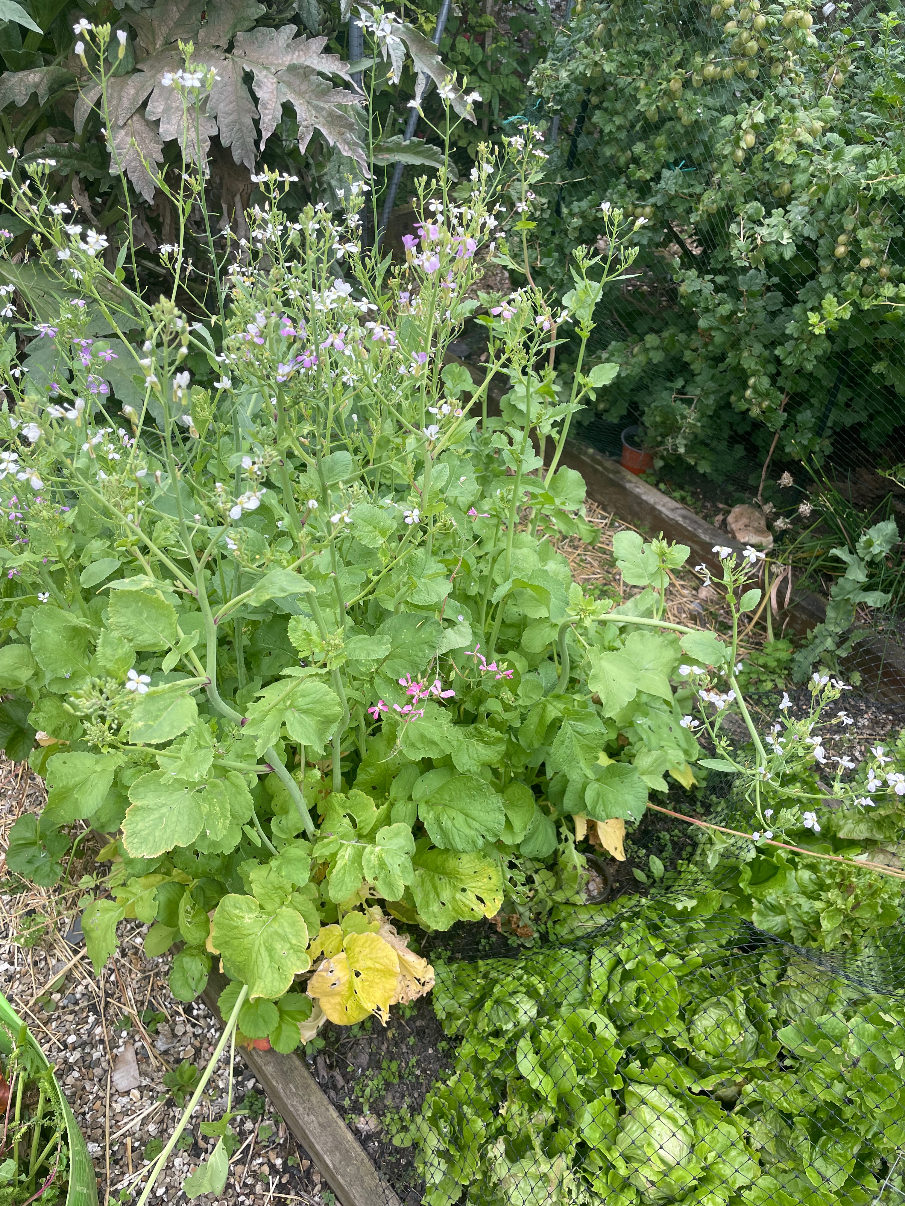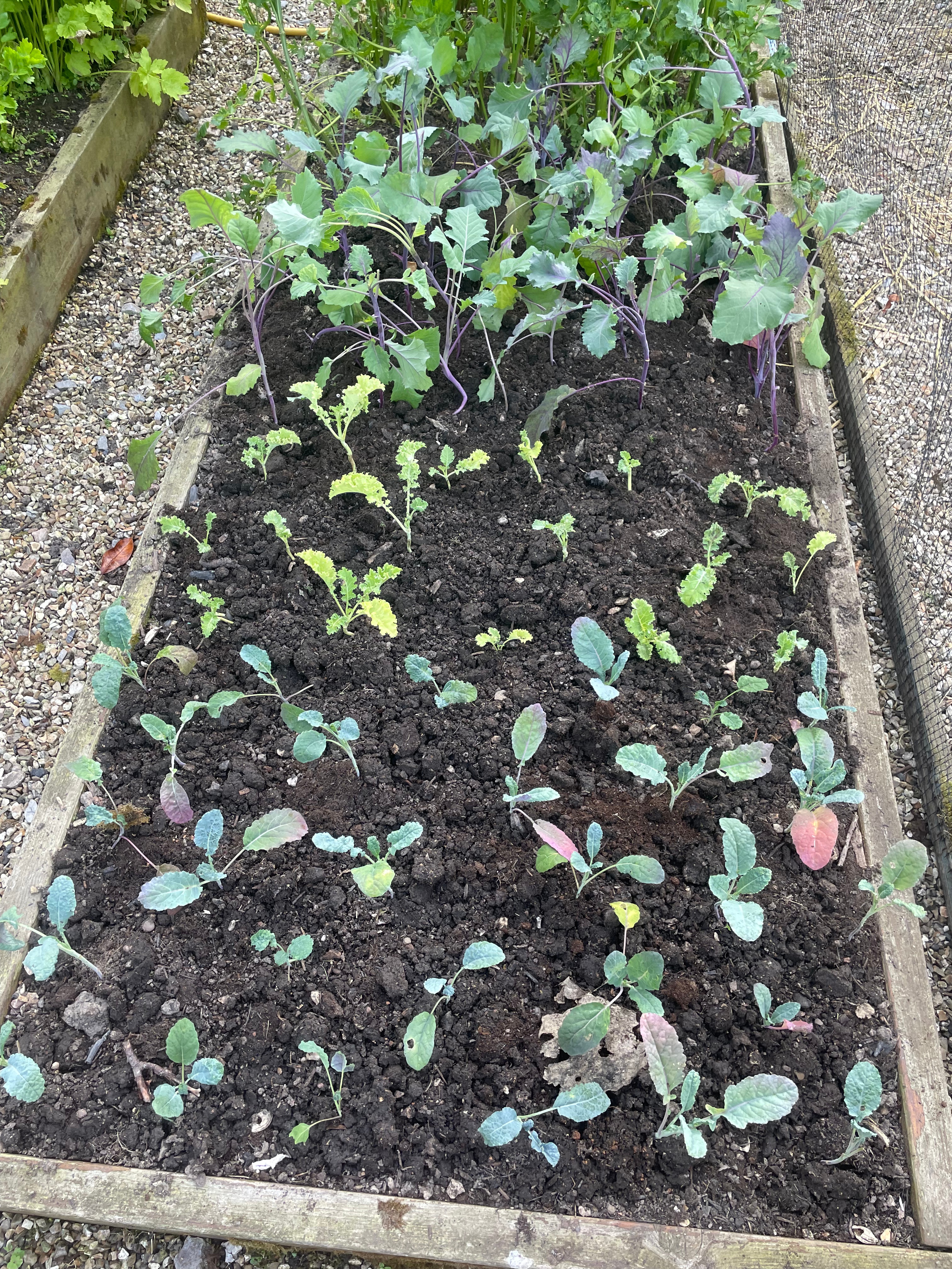 The kitchen garden is starting to get there now, with the final beds planted out with kohlrabi, kale, cabbages and most of the leek. Expecting a poor germination rate (they were old seeds) and in anticipation that various garden visitors will help themselves to our seedlings, we planted extra and so have spares ready to switch in. I’m determined that this year we’ll actually get some vegetables! We’ve already had a lot of plants bolt – mostly the leftover spare plants we kept from last year and planted out in the spring – although the lettuce and radish from this year have also bolted and are really only good for pesto and stir fries now.
