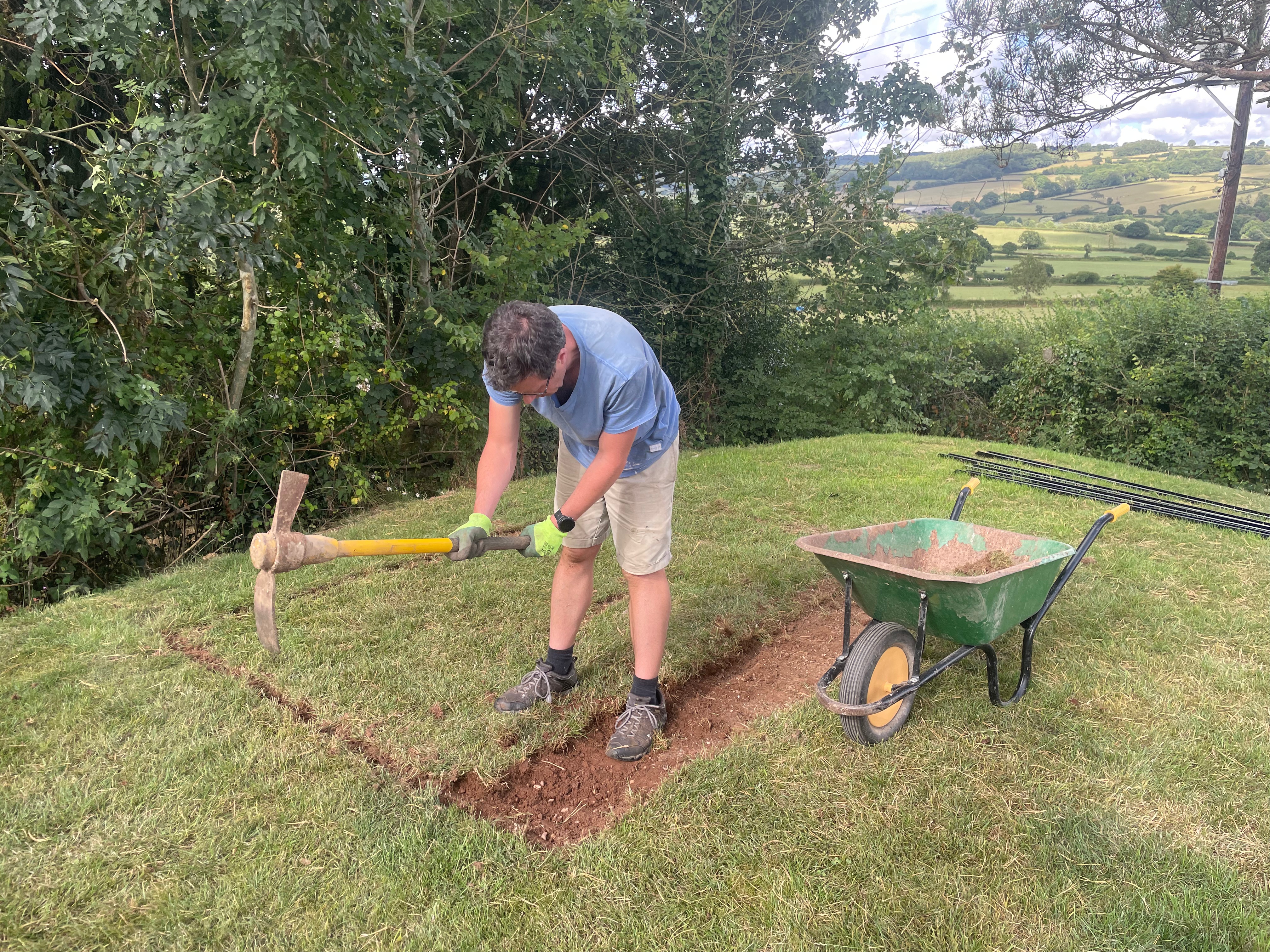 We’ve finally started another job in our own back garden – which has taken a back seat as we focus on the business and keeping the Farmhouse and New Barn (Games Room) looking nice and well-maintained. We started digging out the base for a new greenhouse which we bought over the winter, and digging out the base for the retaining flower bed that will support the garden of the three-bed Old Barn. Weather permitting, we have plans over the next few days to fully dig these out and concrete them both… once our helper arrives as well!