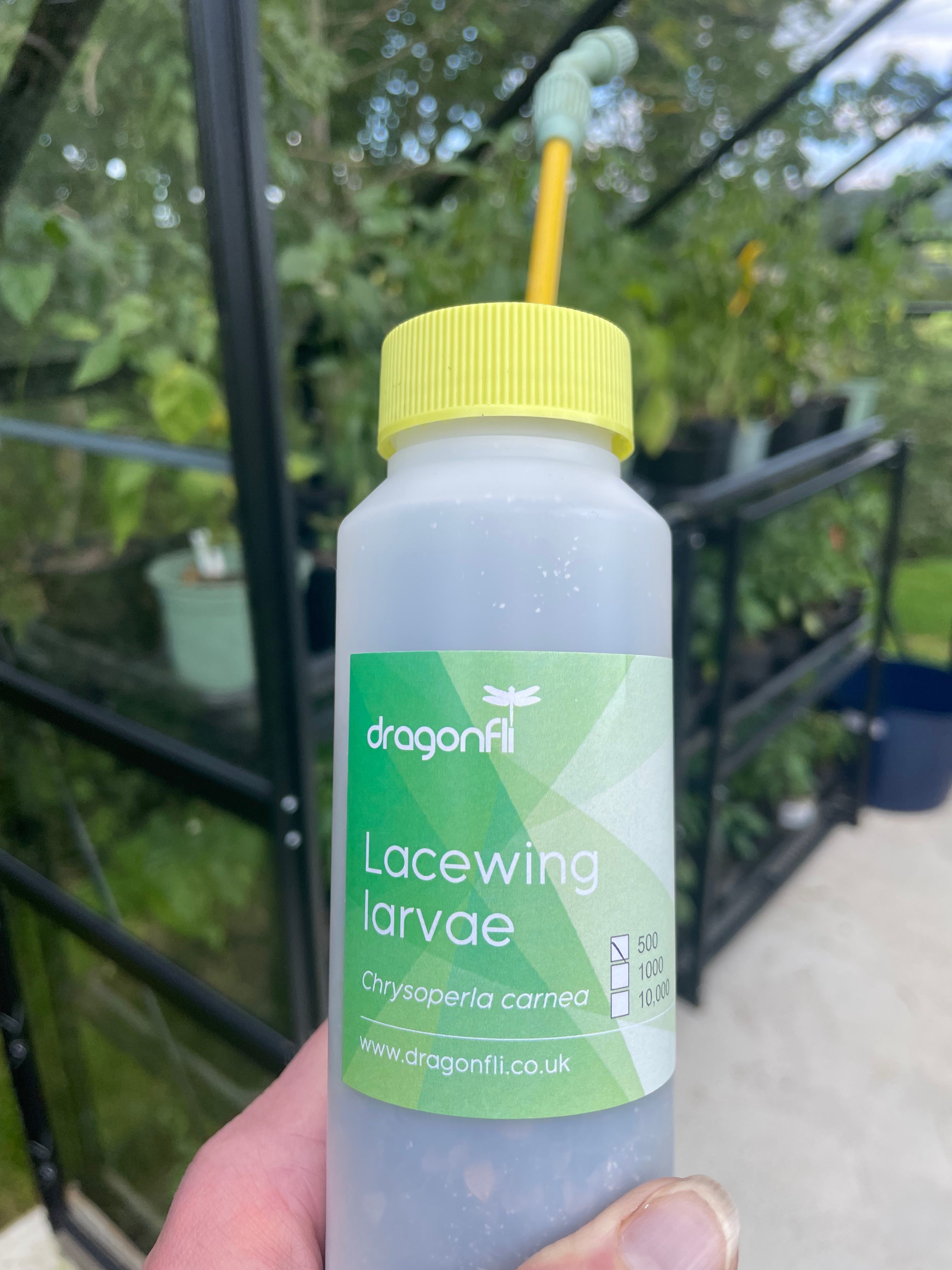 Keeping with the biological pest control theme – this week our lacewing larvae arrived. Our new chilli greenhouse has been beset with aphids and blackfly – and being too late in the season to order ladybirds – the next best thing I could find online was lacewing larvae. I’ve tried buying ladybird larvae before which was a complete failure – and I’m starting to think the lacewing is the same. The container arrived on Thursday and quickly sprinkled it across the chilli plants. Four days later there is no difference in the number of aphids – despite lacewing larvae apparently eating 200 per day! The suppliers say to give it a week – but after a tip from a friend I’m going to try putting the plants out for the birds to see if they’ll clear the aphids for me. Anything is worth a try!
