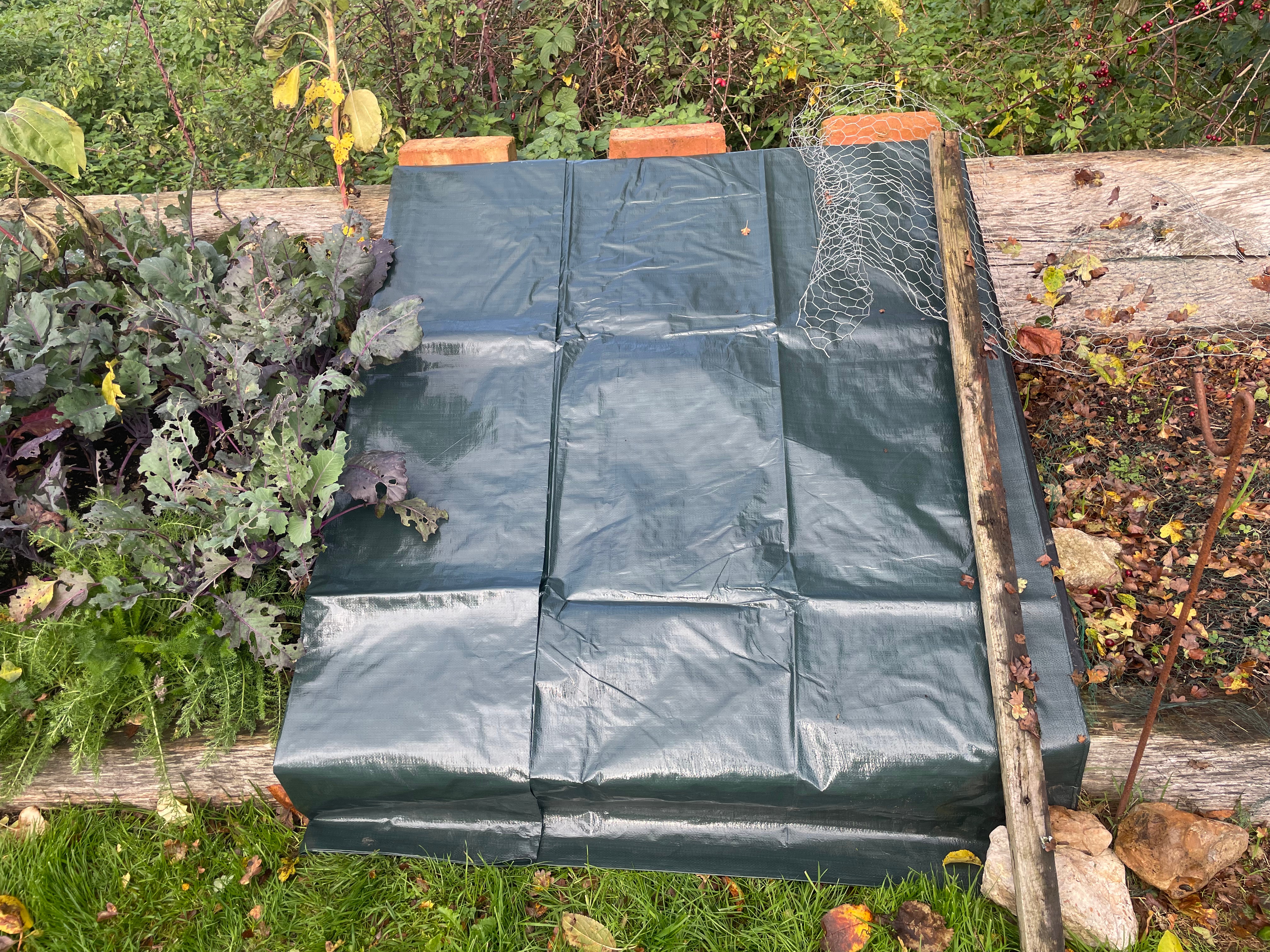 And we emptied the cold frame of the remaining plants and weeded it. The painted window frames don’t like the winter weather very much so this year we’ve bought a tarpaulin to try and protect it. Now it just needs to not blow away!