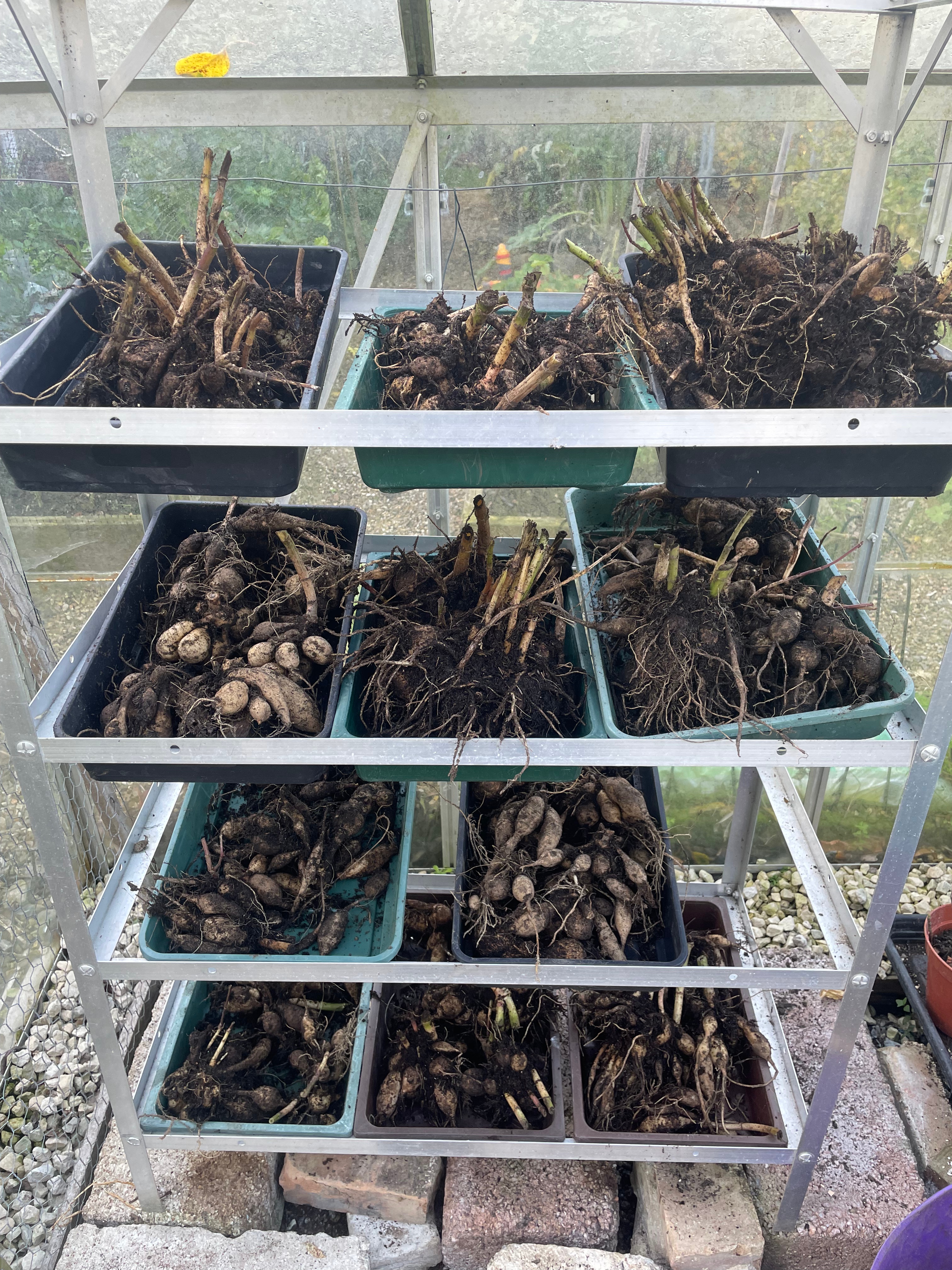 As most of our dahlias have stopped flowering we’ve started to dig them up and dry out the tubers ready to be put away. The greenhouse is now full of tubers – lucky we moved the chilli plants yesterday to make space! Eventually they’ll go into the garage until spring.