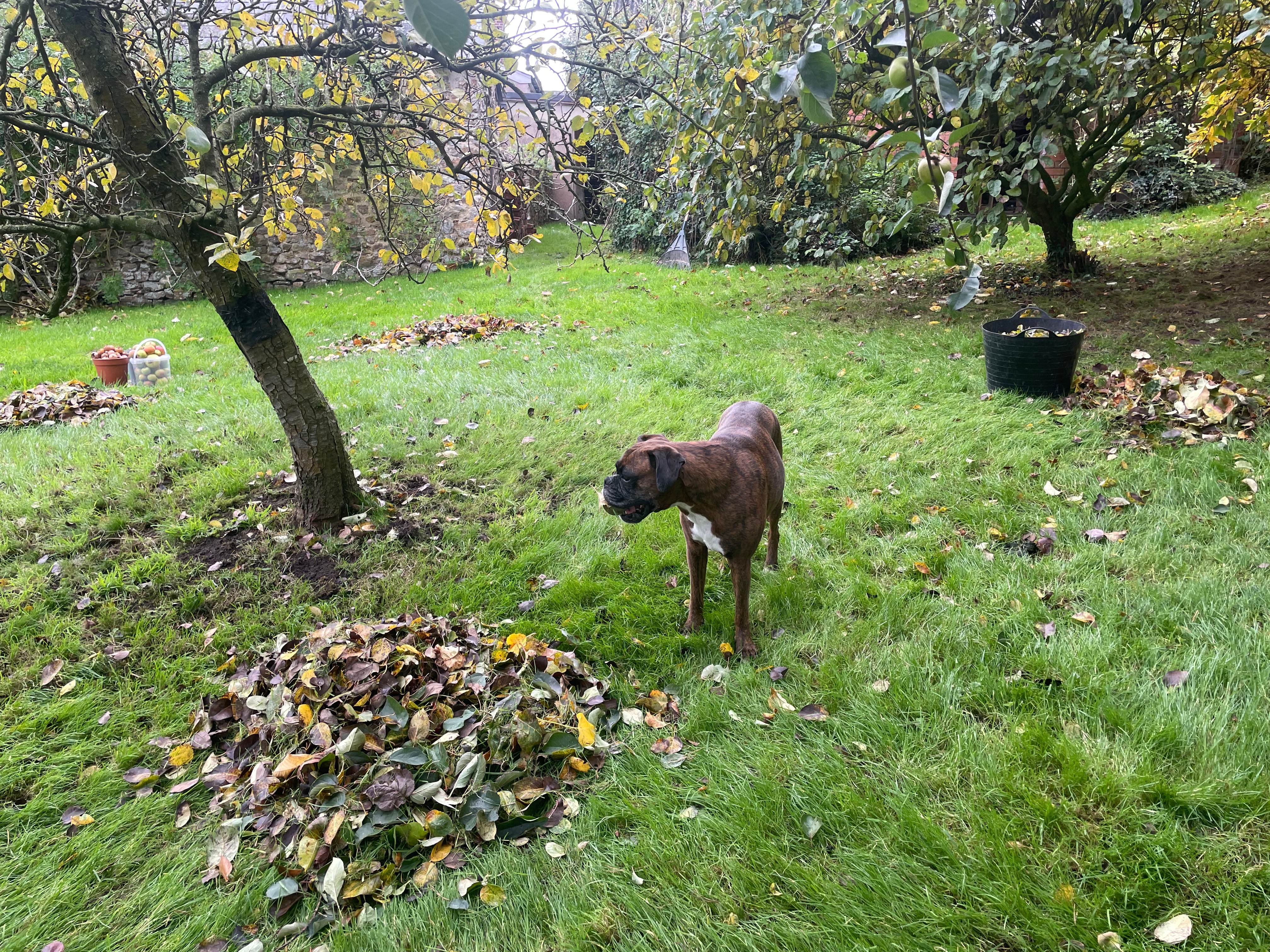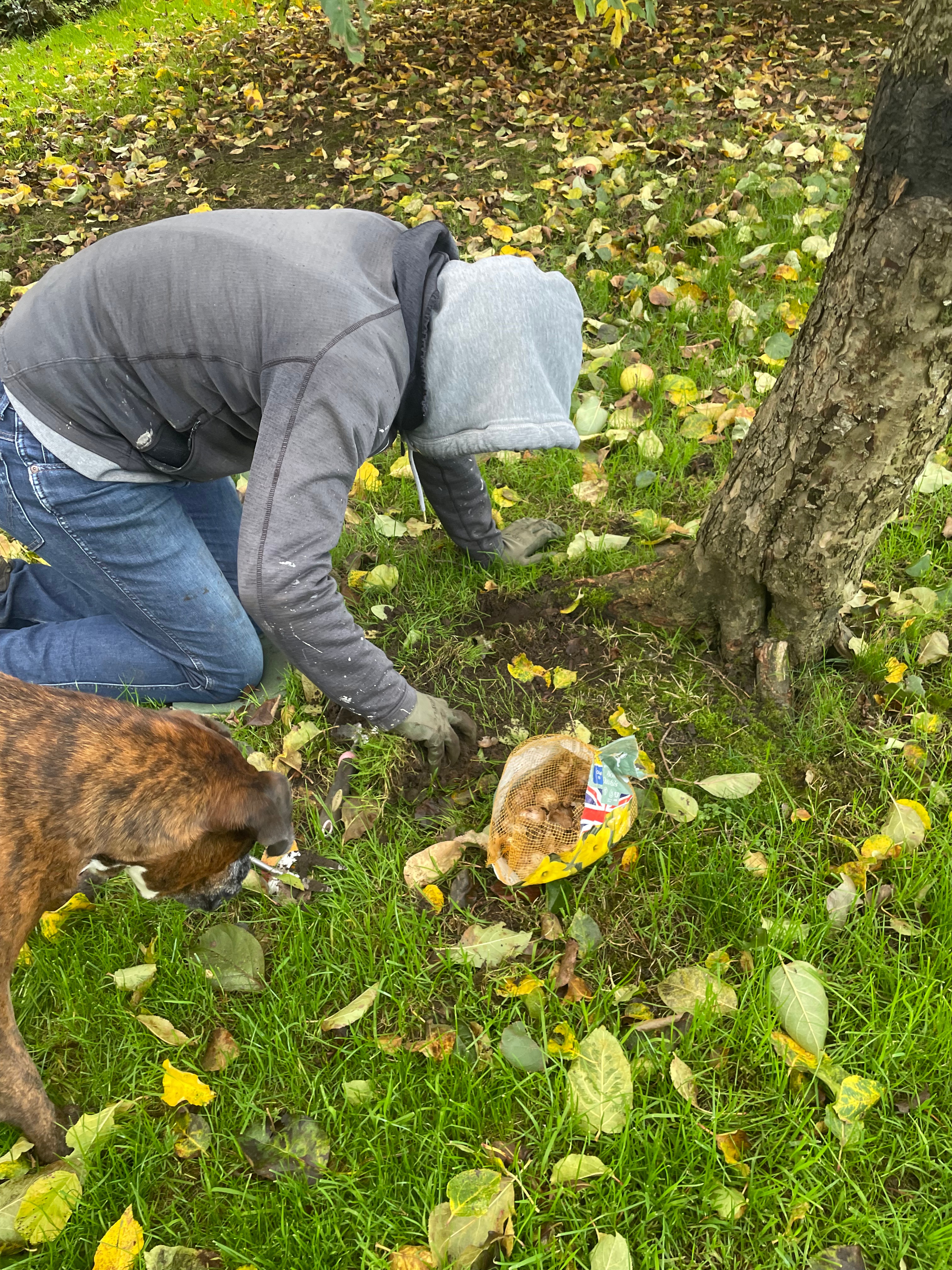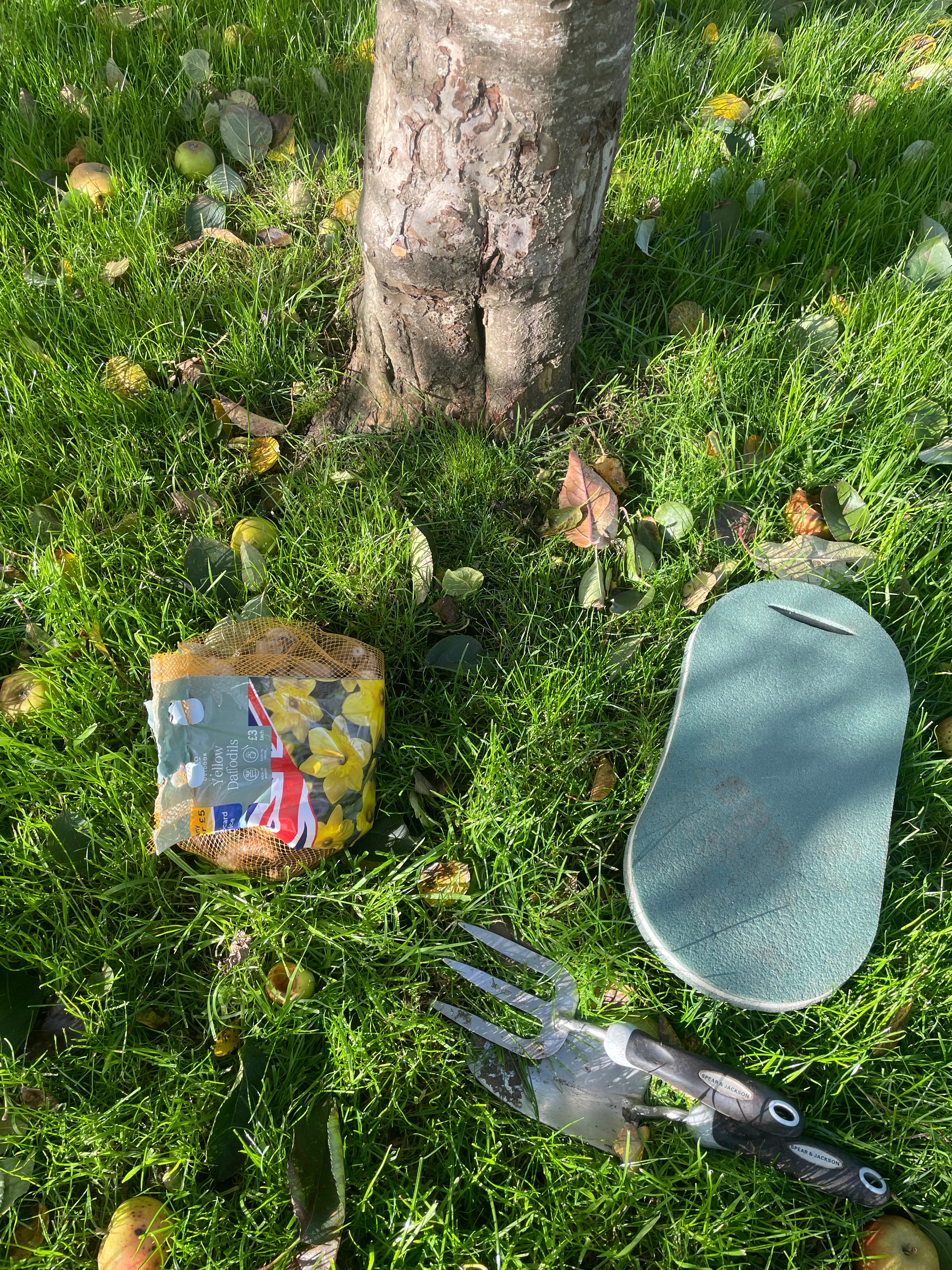 The mild temperatures and intermittent sun and rain have caused the grass to keep growing at a fairly fast rate. Great news around the farmhouse where John scarified and top dressed the lawns a few weeks as they’re now looking thick and green, and he hasn’t had to spend time watering the seed in. Mowing all the lawns takes about a day in total but it’s time well spent – it looks much neater and it’s far easier to rake the leaves when the grass is short. I managed to harvest some more windfall this week in the orchard before John mowed there, raking up leaves and adding more to the hedgehog house there before bagging up a bag for leaf mulch. We planted daffodils around more of the fruit trees – we’ve been gradually planting a few each year in an attempt to attract pollinators in the early spring when the trees are in blossom.