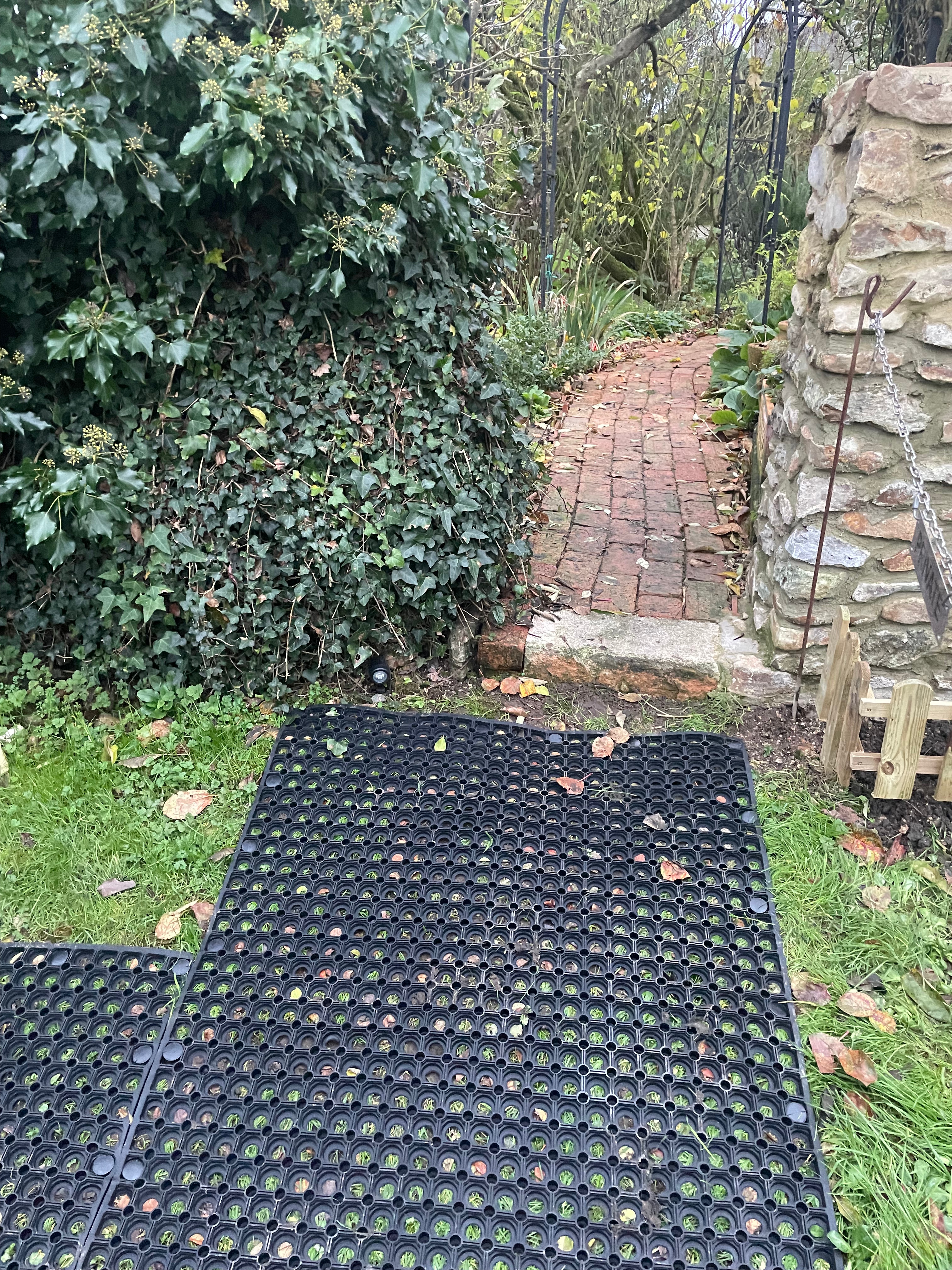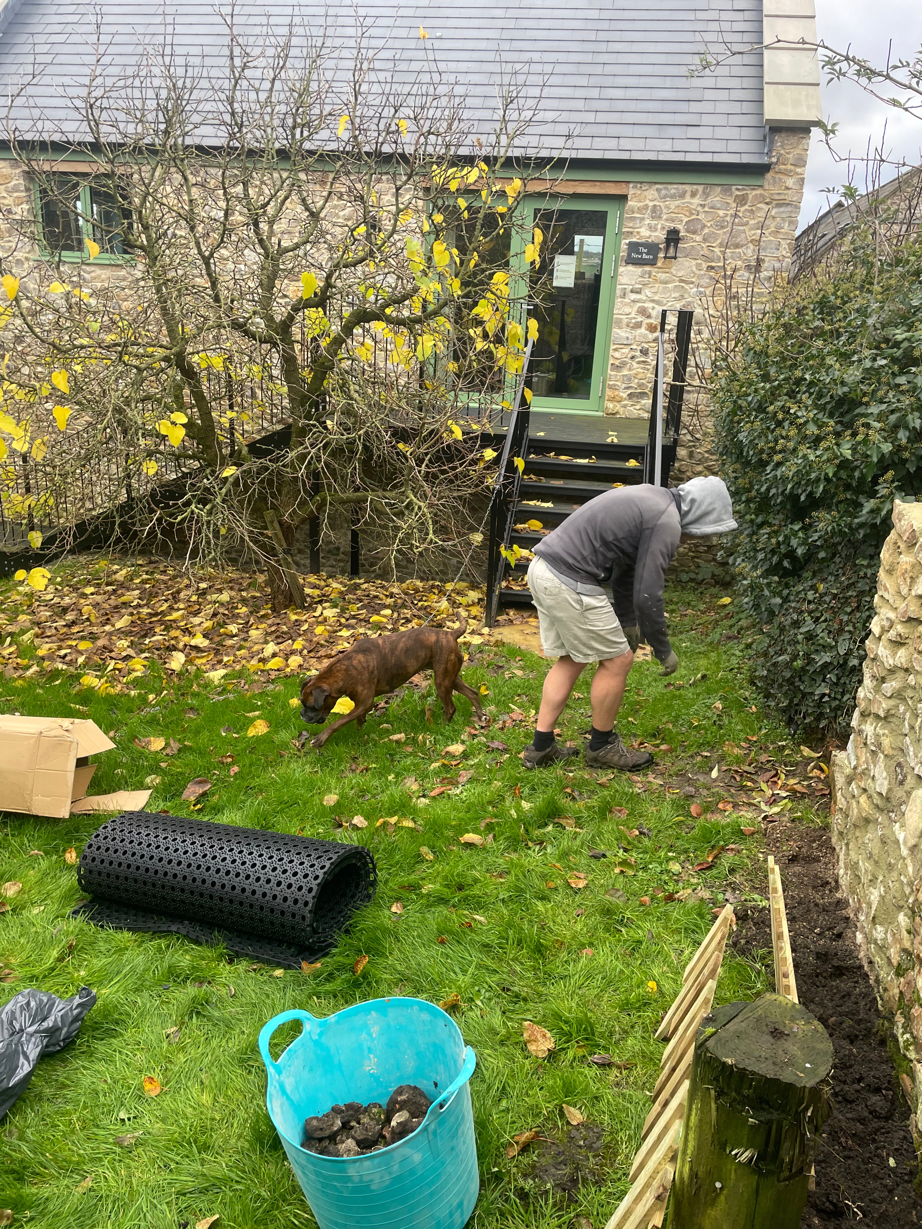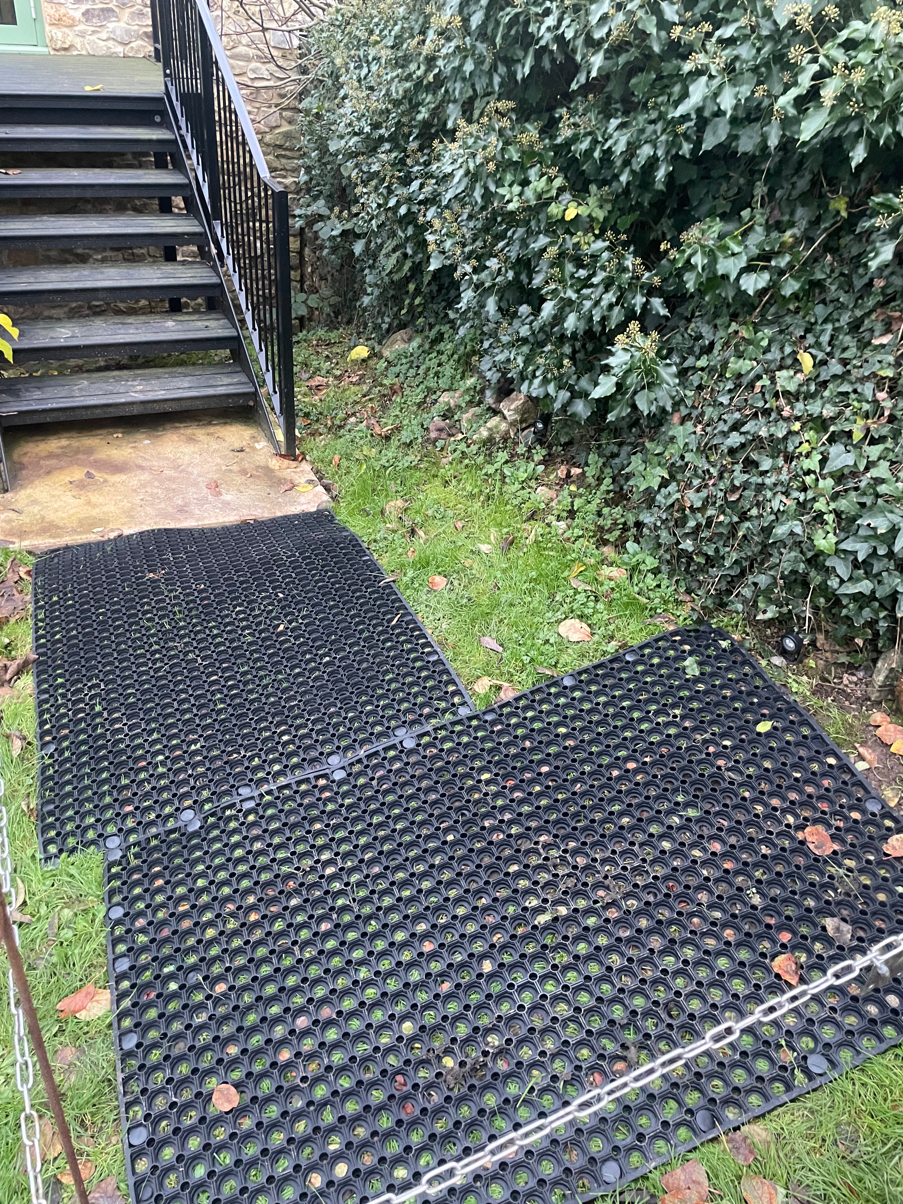 We had friends over this weekend so didn’t have time to start one of our more significant jobs. We did however get a few smaller things done – starting with putting non-slip outdoor matting down in the orchard on the path between the Farmhouse and the Games Room in the New Barn. Before, the path just went down onto grass to the bottom of the steps, but with all the recent rain it’s getting quite muddy and slippery and we don’t want anyone to fall over. Longer-term we want to extend the brick path that runs from the Farmhouse but until then the matting should make the area safer. It looks a little unsightly so hopefully the grass will grow through soon!