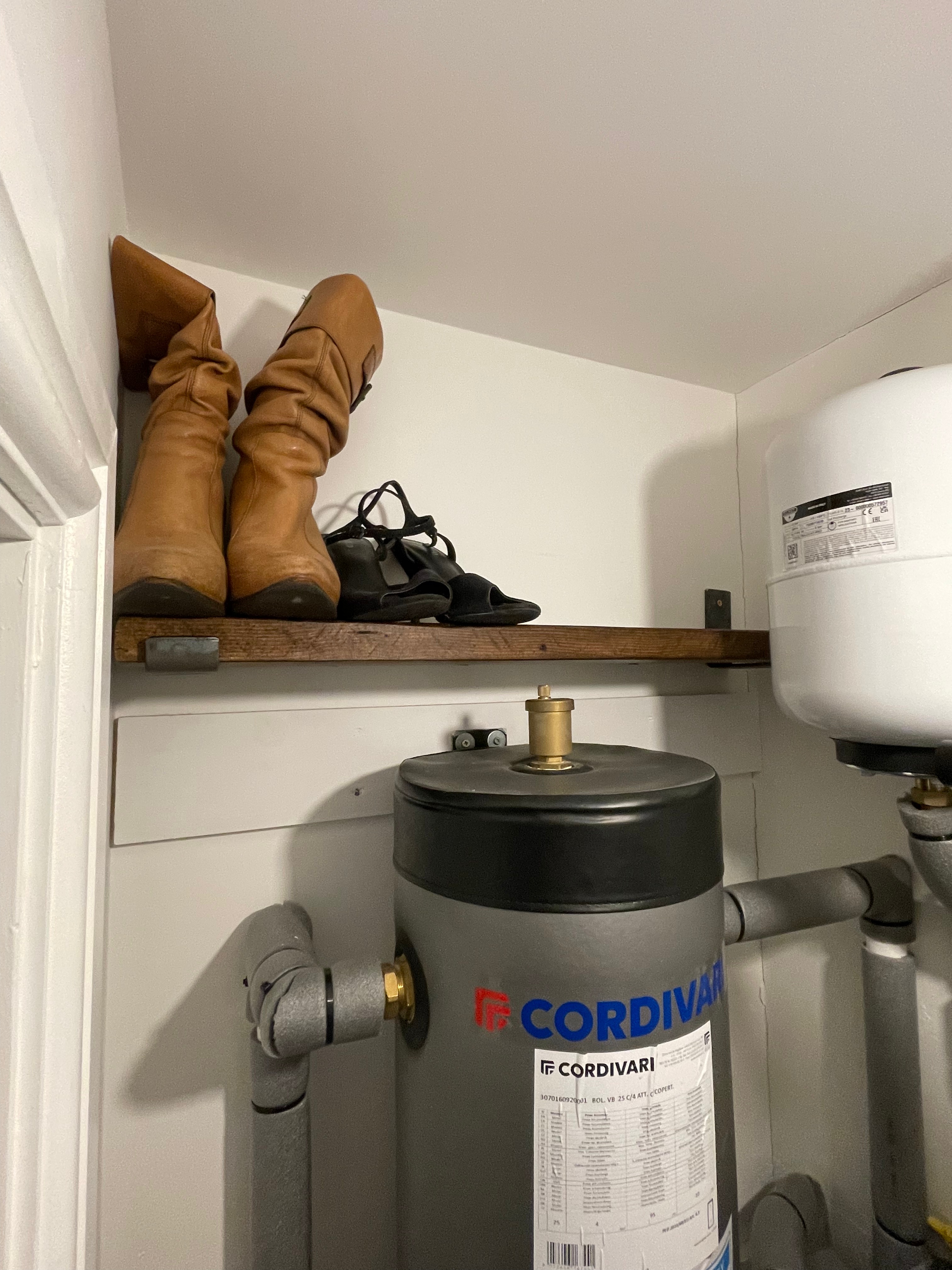 After a lovely lunch at The York Inn in Churchinford, we went home to do a few jobs that have been hanging around for almost a year. The first was to put in another shelf in our service/airing cupboard – mainly for my shoes that are currently stuck in the garage (this is part of a bigger plan to get the garage under control!). It wasn’t easy to drill holes restricted by various bits of heating equipment but somehow we managed it – and the shelf is now in and ready to be filled.