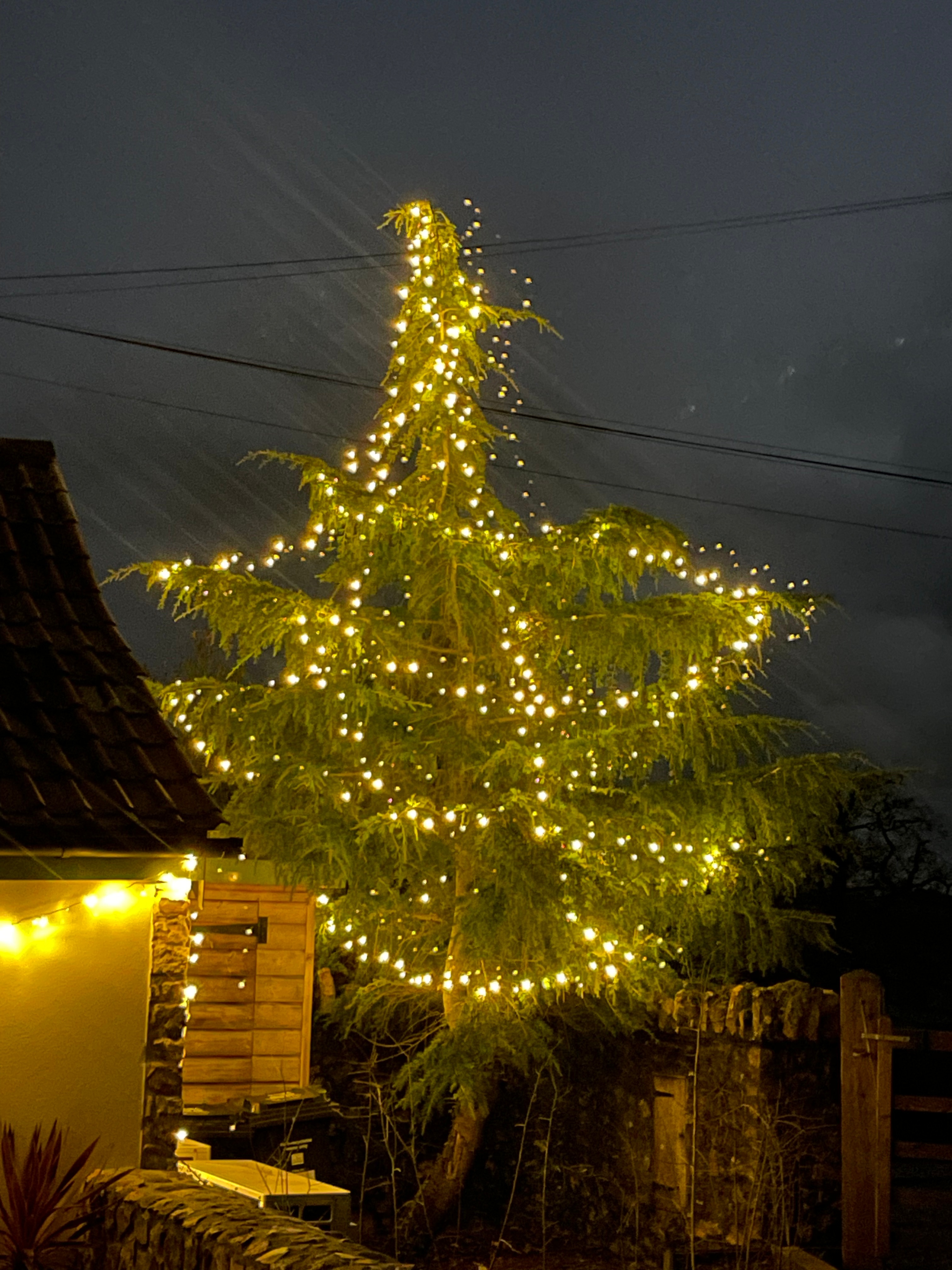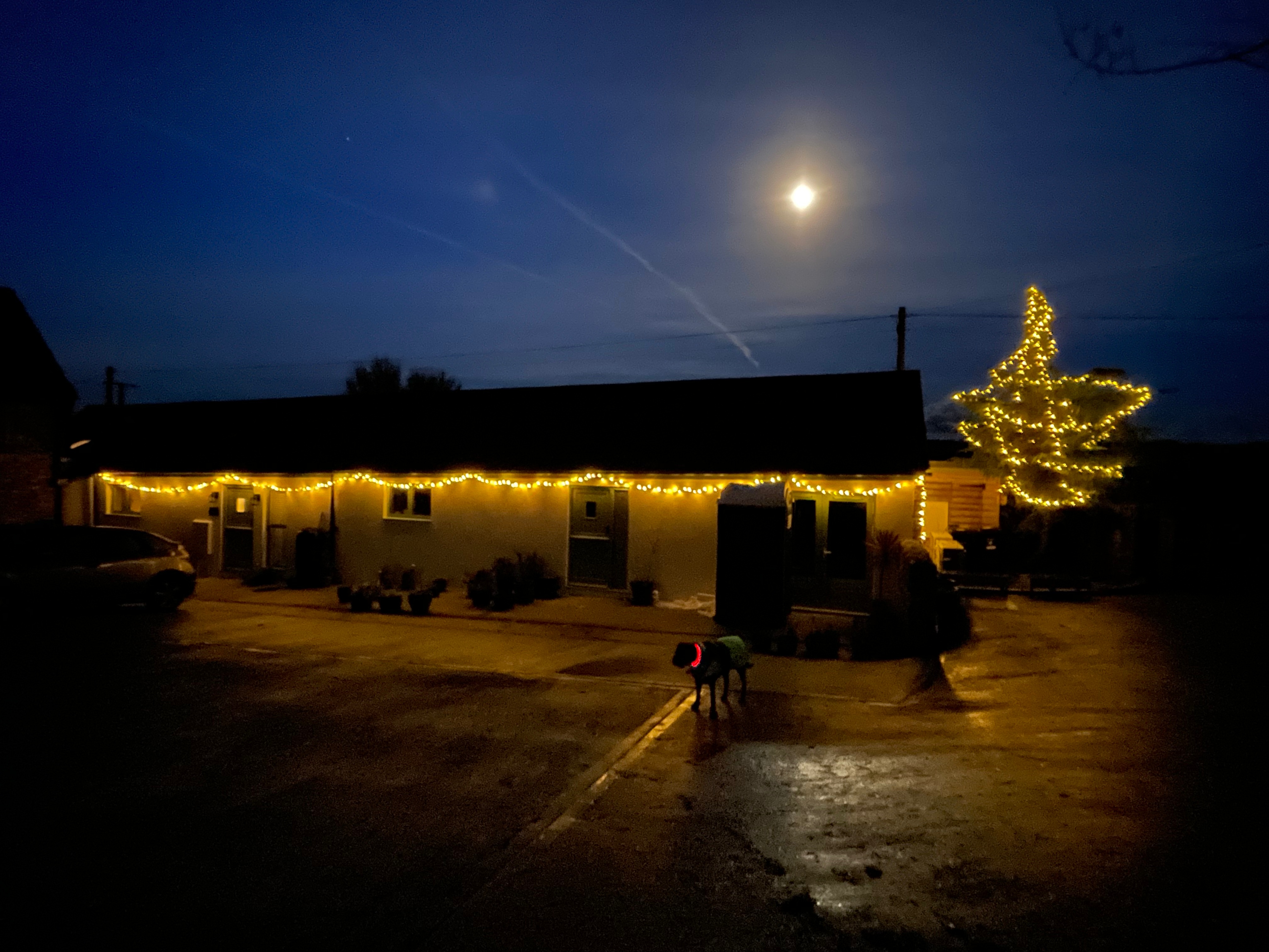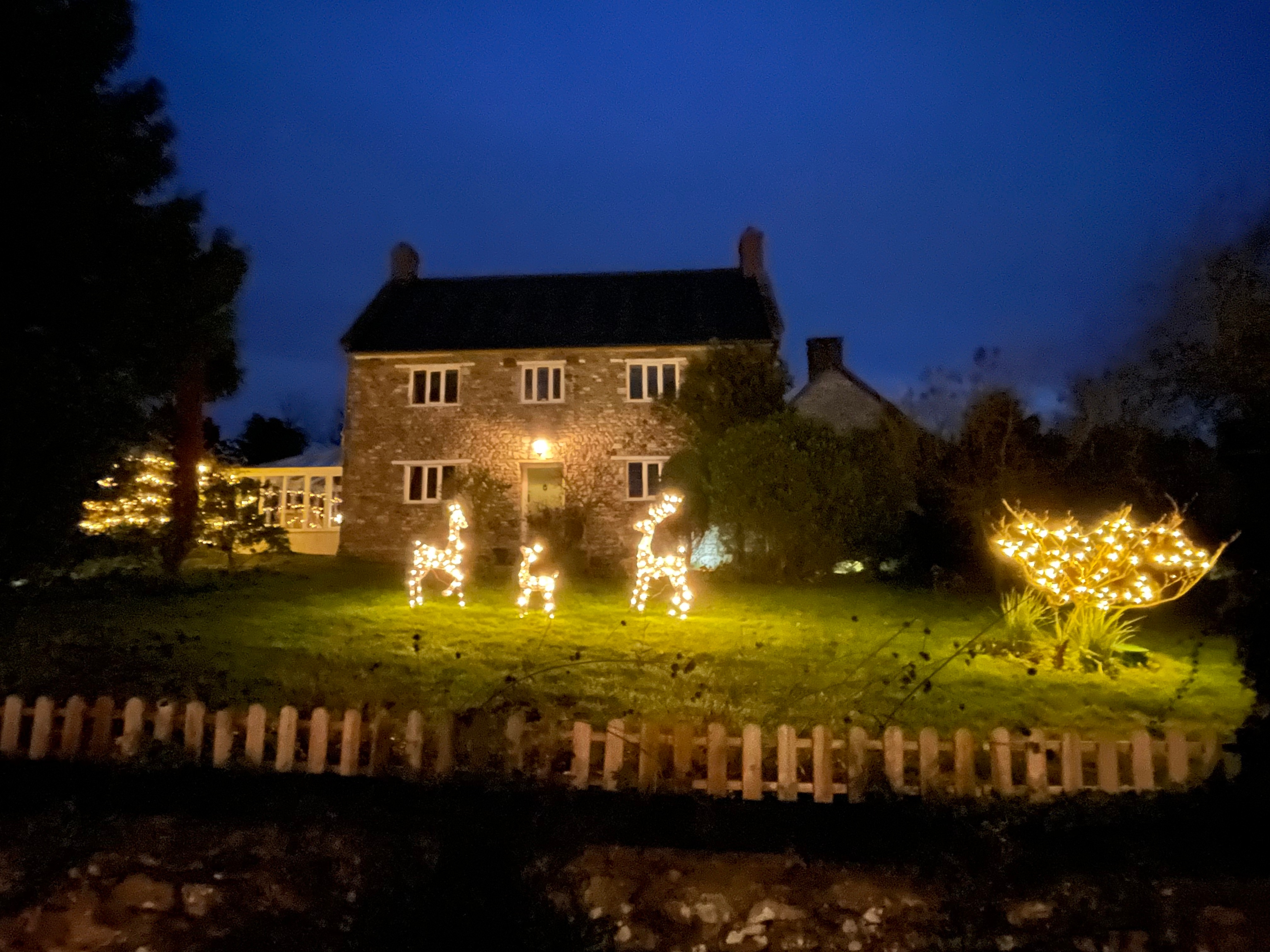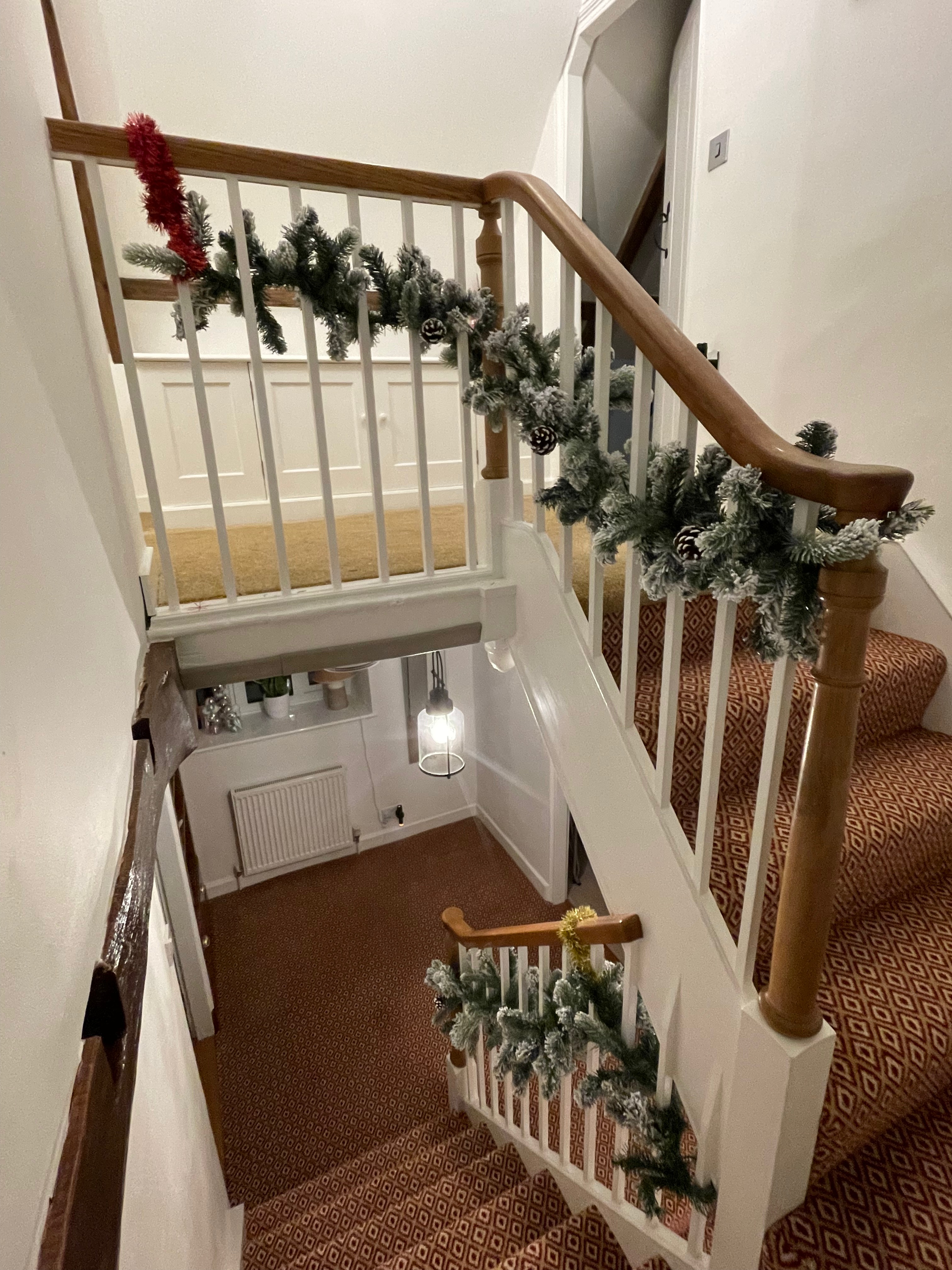 Christmas has arrived at Ley Farm Cottages!! Our guests this weekend are celebrating an early Christmas so we wanted to make sure all the decorations were up. John spent the daytime putting up the outside lights along both sides of the shippon and around the pine tree by the gate, and once the changeover was done we spent the evenings putting up the inside decorations. When the house is full of people and dogs there’s not much space in the living room for a big tree so we put the larger tree in the dining room and a smaller tabletop one in the living room. We wove garlands through the bannisters to continue the Christmas spirit up through the house. And this year we’ve added jars of baubles in various places – inspiration from a friend of mine. We love getting new ideas and adding them to the Farmhouse!