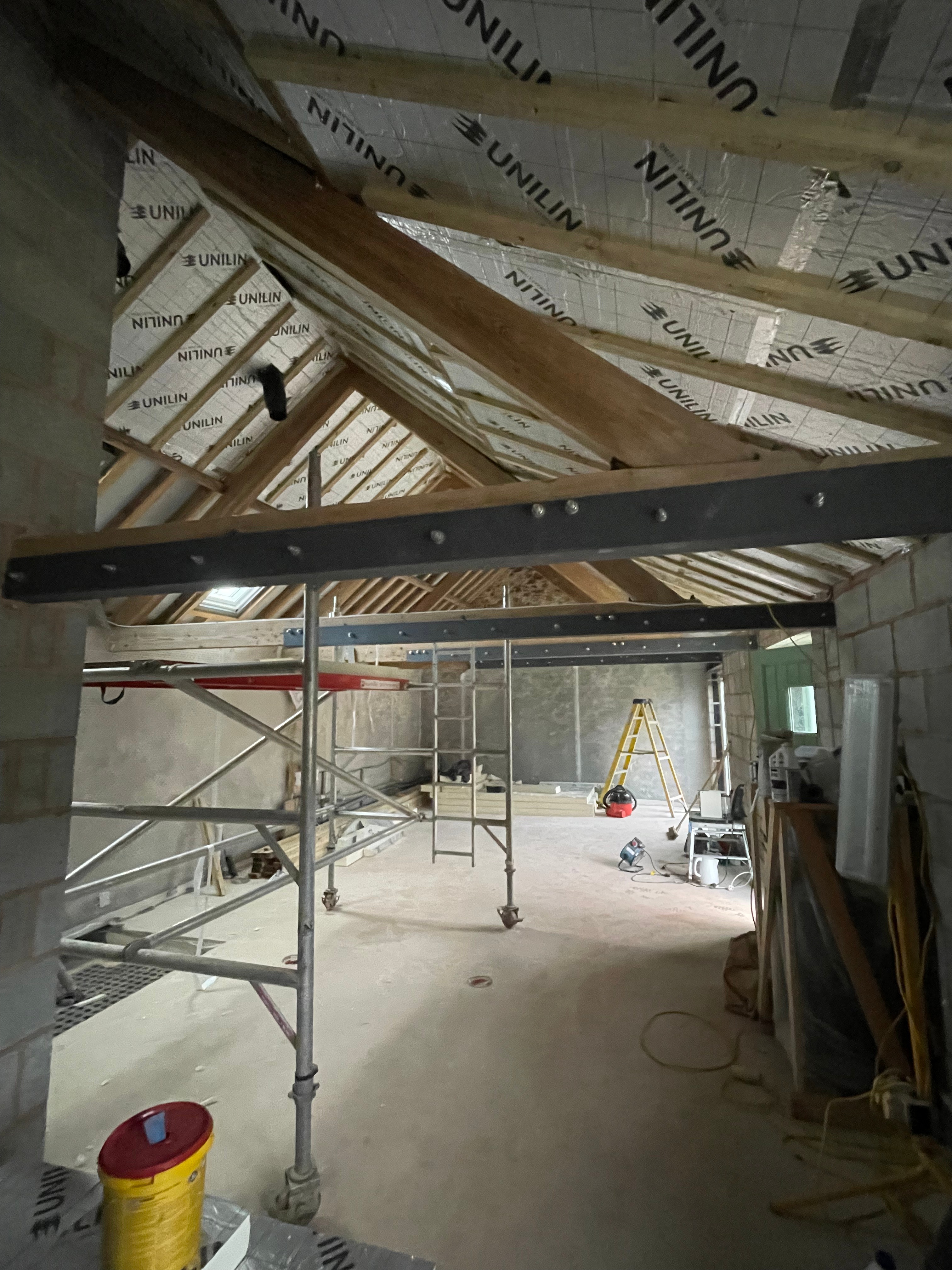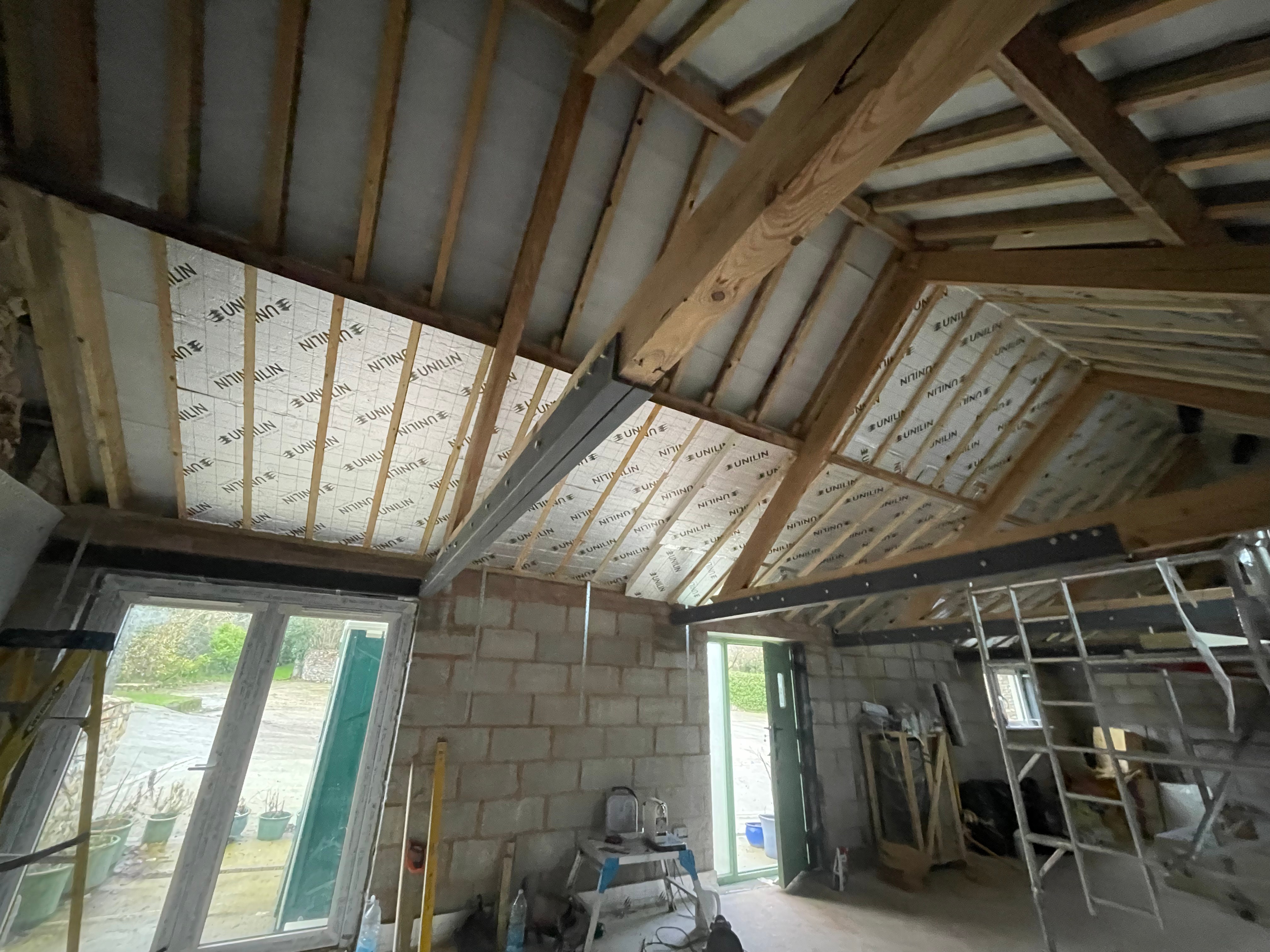 Our builder arrived on site this week to start work on our one-bed cottage. We split the old dairy (the ‘shippon’) and cow shed into two – we extended one half and turned that into our house – and we’re turning the other half into a one-bed with a bedroom and ensuite and an open plan kitchen, dining and living area. We’ve already done the exterior work to avoid any disruption to guests staying at the Farmhouse so now all the work required is internal – something Dean our builder is quite grateful for given the cold and wet winter! He’s made a start with the insulation on the roof, cutting each bit into shape and then pushing it up between the rafters. It’s been almost 18 months since having builders here and we’ve missed it a bit!