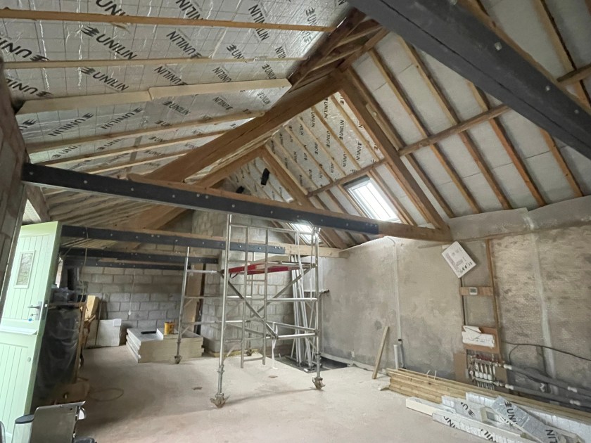 Our builder arrived on site this week to start work on our one-bed cottage. We split the old dairy (the ‘shippon’) and cow shed into two – we extended one half and turned that into our house – and we’re turning the other half into a one-bed with a bedroom and ensuite and an open plan kitchen, dining and living area. We’ve already done the exterior work to avoid any disruption to guests staying at the Farmhouse so now all the work required is internal – something Dean our builder is quite grateful for given the cold and wet winter! He’s made a start with the insulation on the roof, cutting each bit into shape and then pushing it up between the rafters. It’s been almost 18 months since having builders here and we’ve missed it a bit!