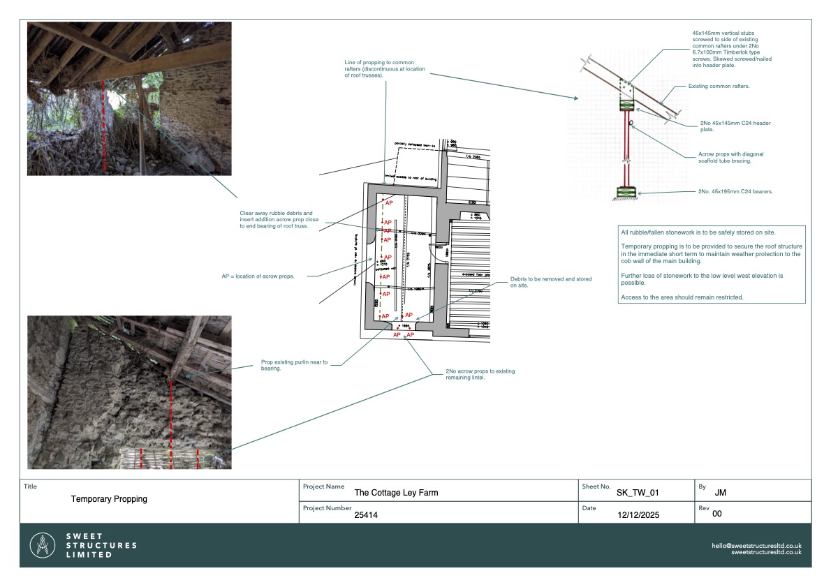 We also received the proposal from the structural engineer to prop the lean-to in the Elizabethan cottage to make it safe and secure for the rest of the winter. The semi-permanent solution (in the warmer summer months) is to rebuild the walls – unfortunately we can’t do that yet as lime mortar needs significant protection from frost, wind and rain. We also need to get planning approval to do the work which we should be able to fast-track as it involves stabilisation work for a listed building. So in the meantime he’s suggested we get 11 new acro props in addition to the two we already have, to prop the roof to take the weight off the crumbling stone walls and stop them collapsing any further. We’re now just waiting to find out when our builders can fit the work in – ideally before the next strong storm comes through and does any more damage…