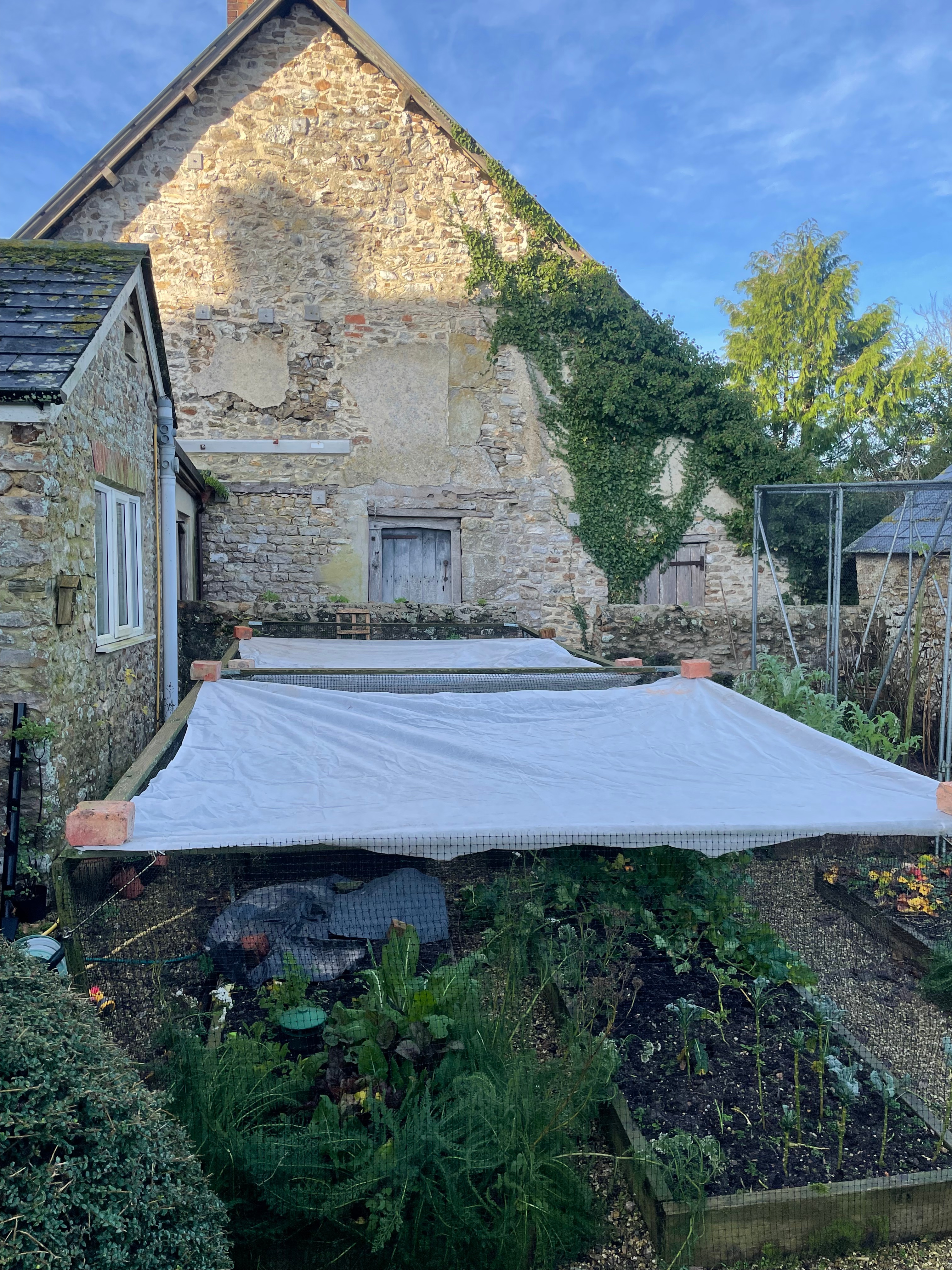 Of course – it’s not all play and no work here. We spent the morning bubble wrapping the greenhouses (as much as we could until we ran out of bubble wrap) and covered our new echium donated by a lovely family friend to protect it from the cold. We also covered our vegetables with fleece and plastic to keep the rain out – but the fleece isn’t really big enough and so it’s already blown off. Must try harder…