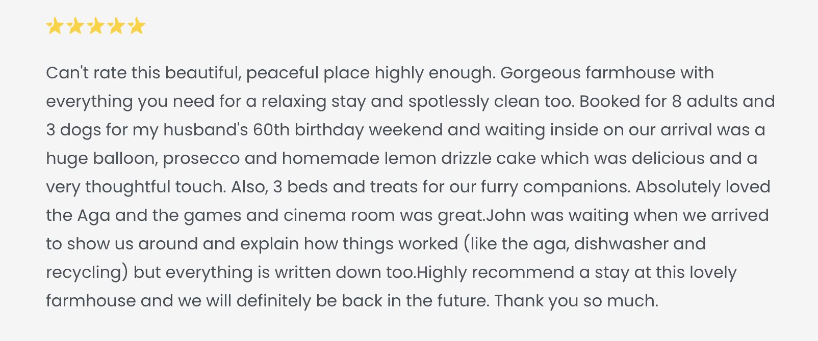 Once the numbers were done, we moved to the pub to chat through our own end of year reflections. John’s biggest reflection from the year is the satisfaction he gets when he reads through the reviews left by our guests on the various booking platforms. We’re lucky that most of our guests leave a review – it both helps future bookings and also is very motivational to read about how much our guests have enjoyed their stays and the memories they’ve made here – whether they’ve stayed for a weekend away or a longer holiday. It’s particularly lovely when guests have chosen to stay here to celebrate a special birthday and brought family and friends together. We worked out that we’ve had almost 300 people stay this year alone which is pretty incredible.