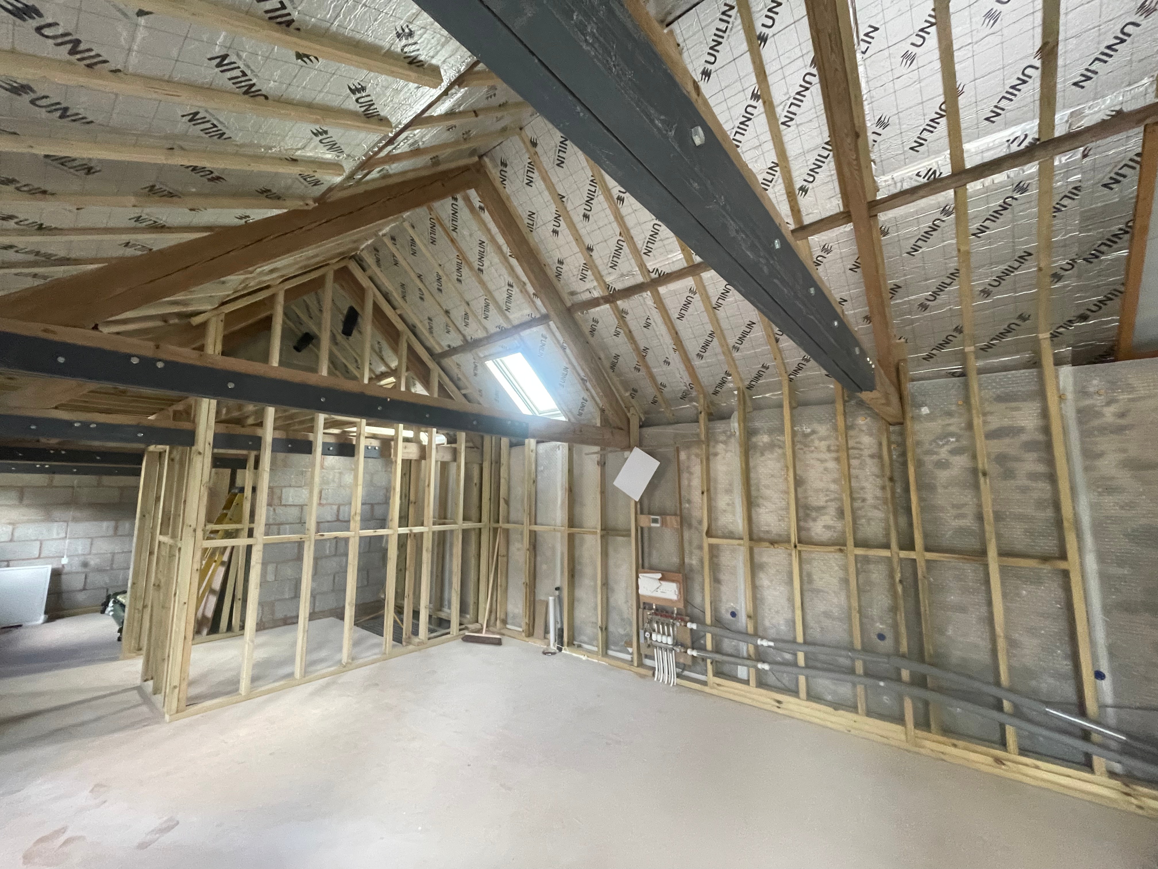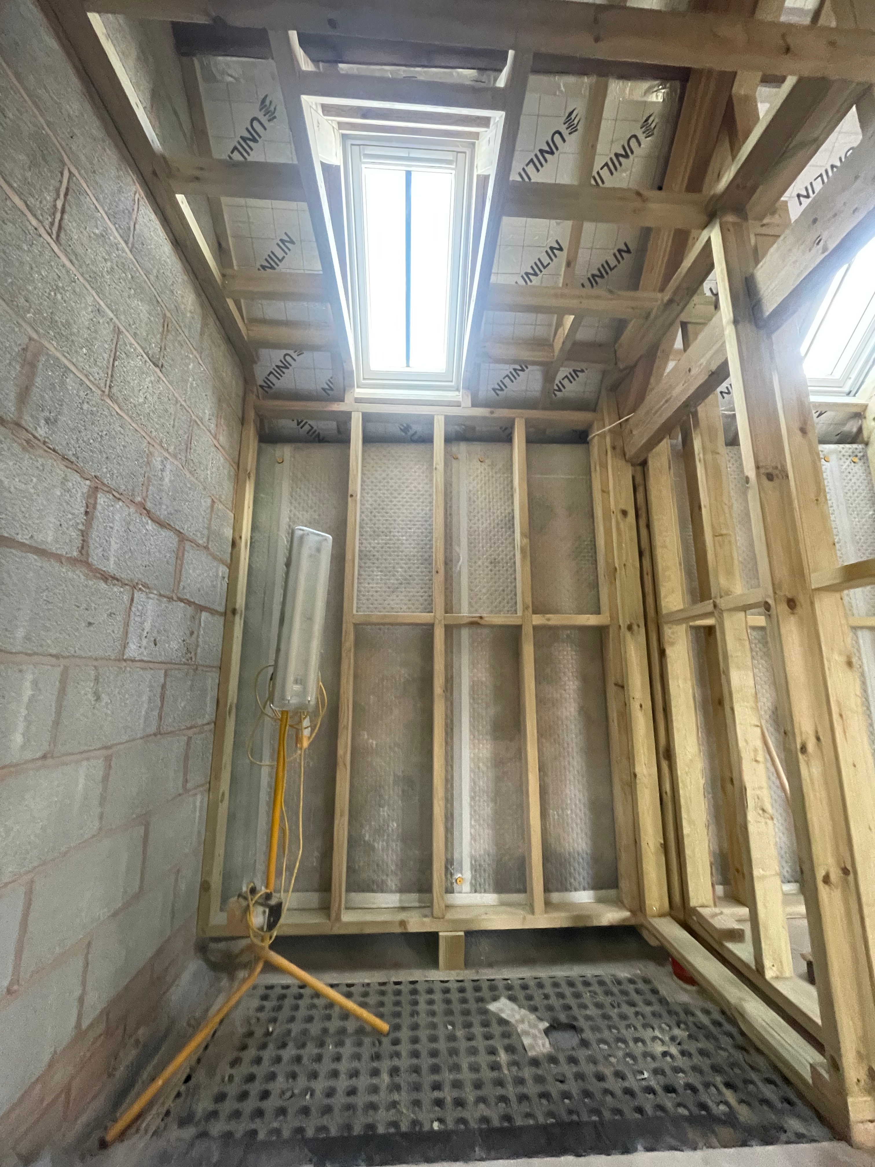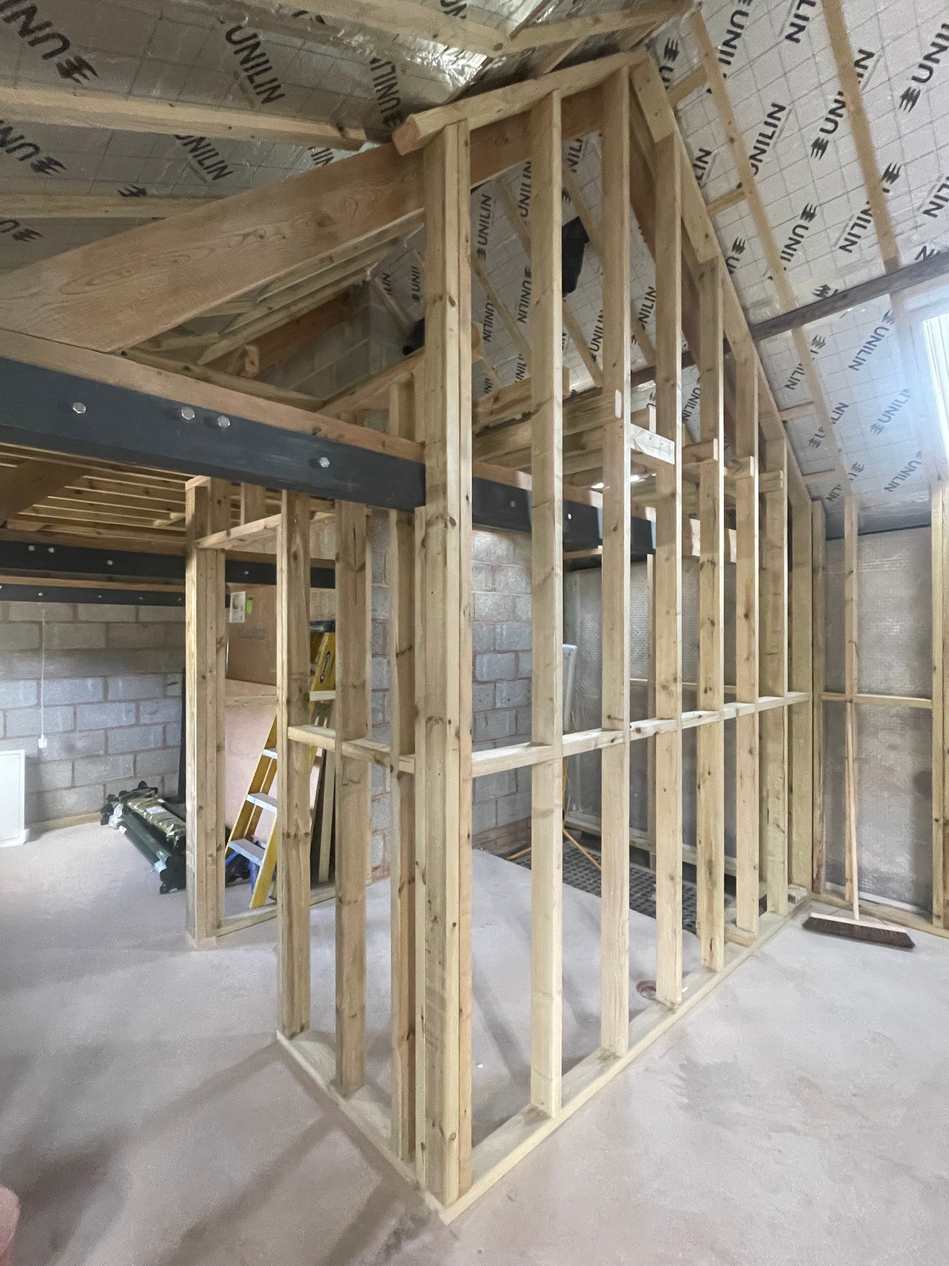 Our carpenter has been busy working in the one-bed Cow Shed this week. He’s been focusing on installing the woodwork for the walls and ceilings in the bedroom and the ensuite shower room and has made fantastic progress. The rooms are really starting to take shape. He’s even had time to build part of the structure for the back wall. We’ve spent a bit of time thinking through the kitchen design – as we saw the stud wall go in we were concerned it was too close to the front door and guests would walk in to see a kitchen cupboard right in front of them. So after a bit of measuring and redesign we’ve landed on including a peninsula (a bit like ours) and shortening the length of the kitchen. Our carpenter has adapted the walls to include a built-in broom cupboard as well. It’s great to have someone who works with us to get the best solution rather than just following instructions.