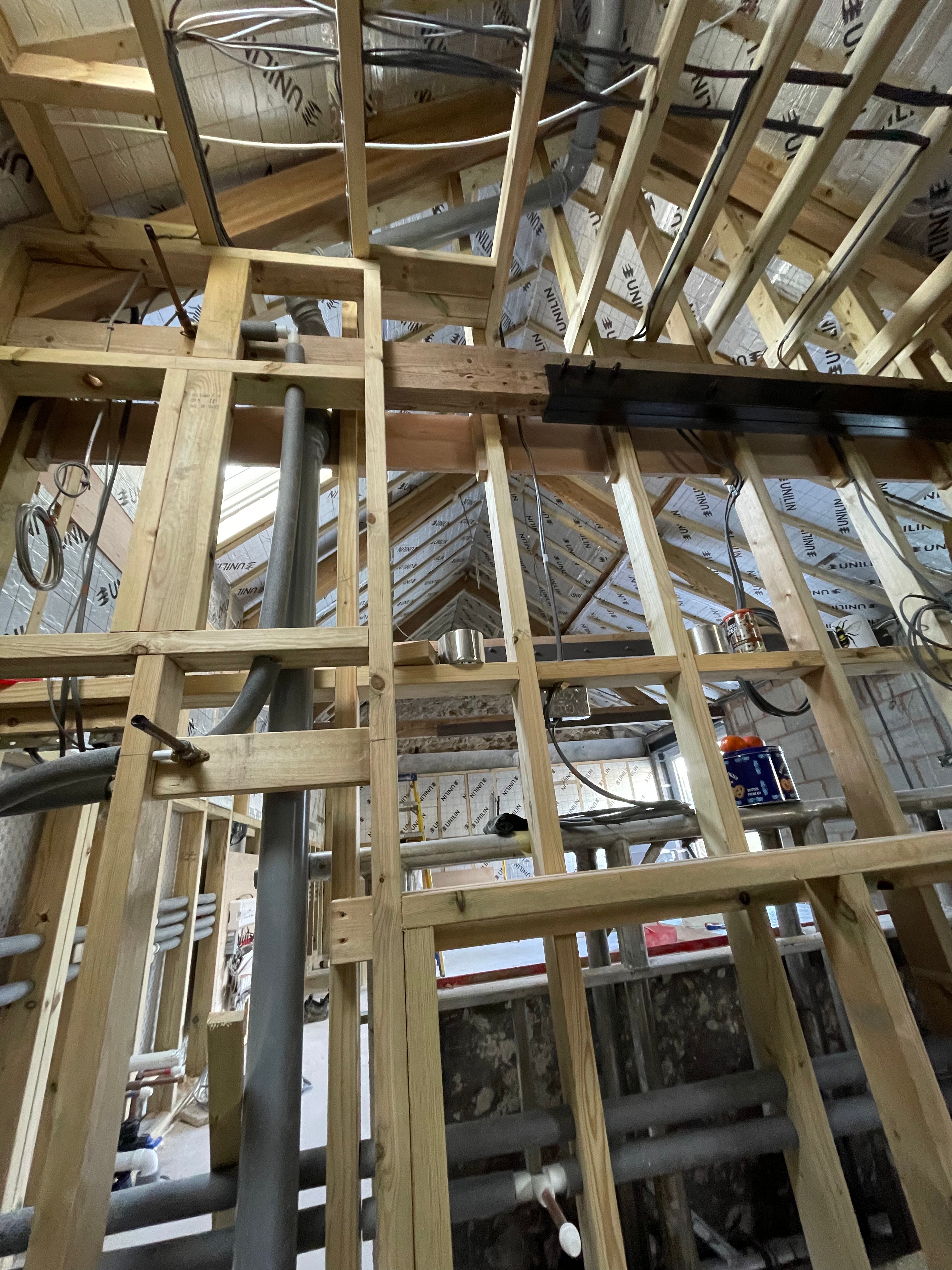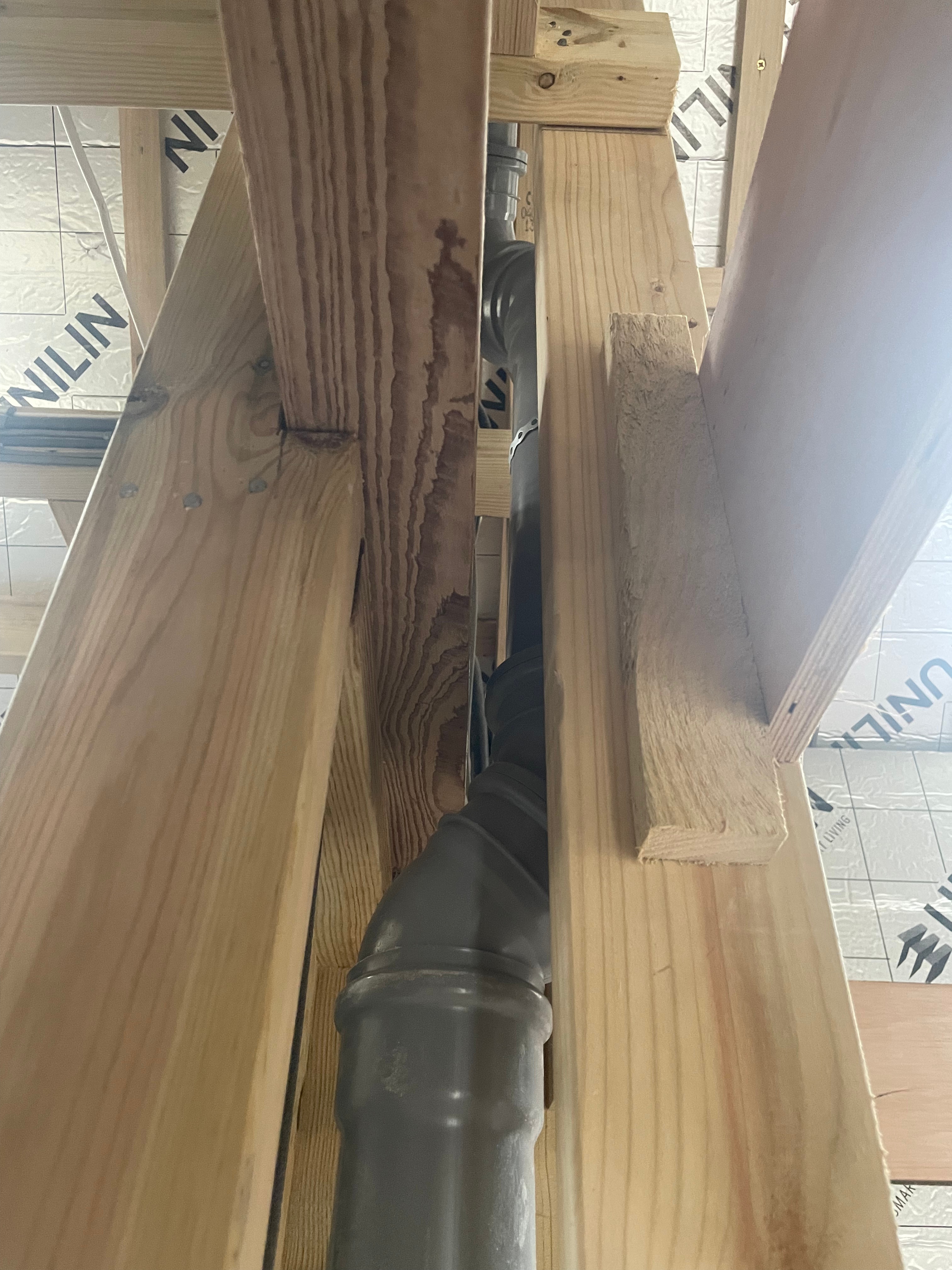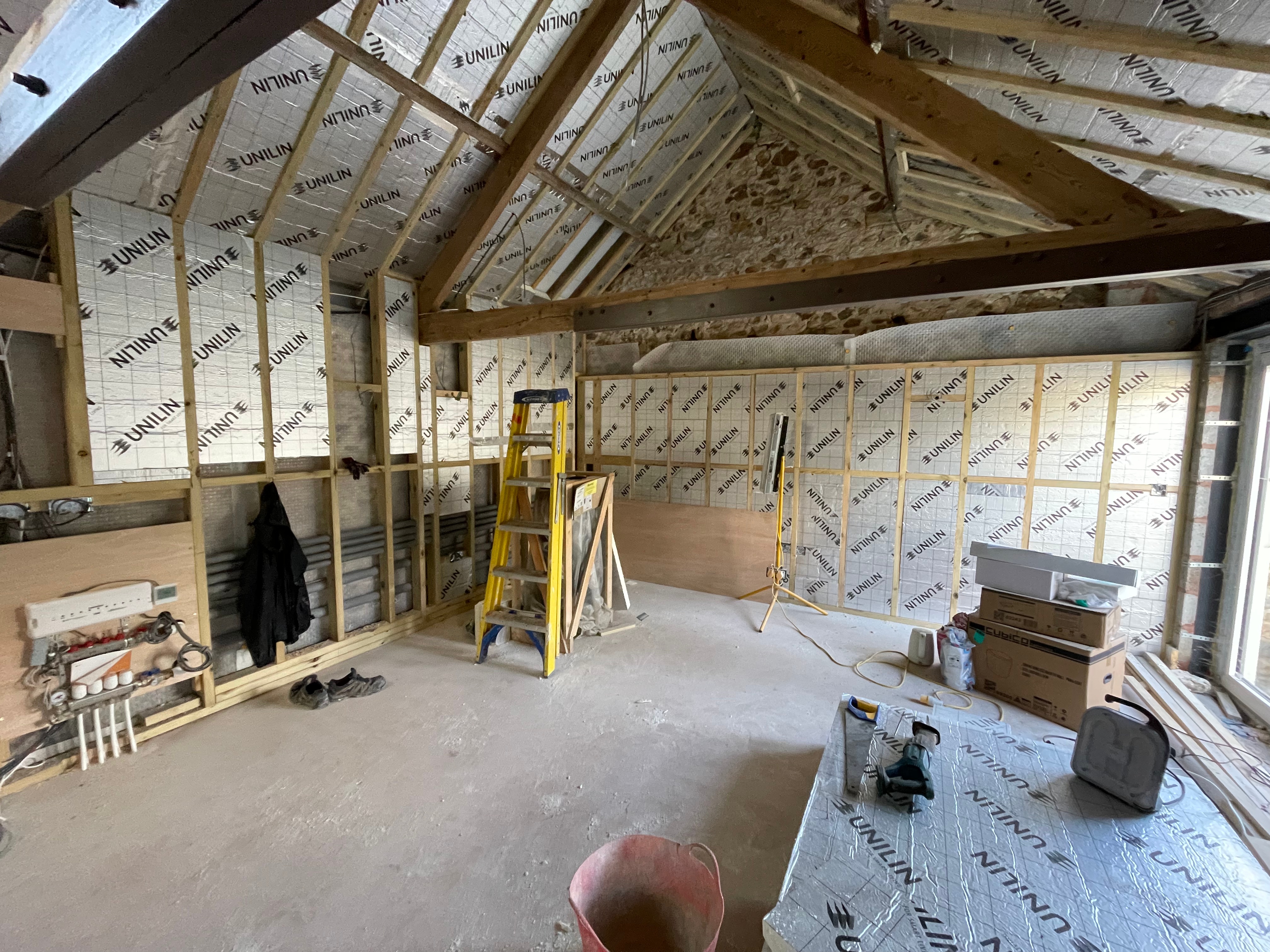 It’s been a busy week for our builders – with three trades on site. The plumbers arrived to do the plumbing first fix in the shower room and the kitchen. We now have pipes running within the stud walls, pipework up to the bottom of the toilet and sink in the bathroom, and the shower controls are in. Dean, our builder, installed the soil vent pipe for the toilet with some impressive manoeuvring required to avoid the structural beam that inconveniently happened to be right in the way! The extra work required to achieve this didn’t get in his way though as he’s now insulated most of the walls as well.