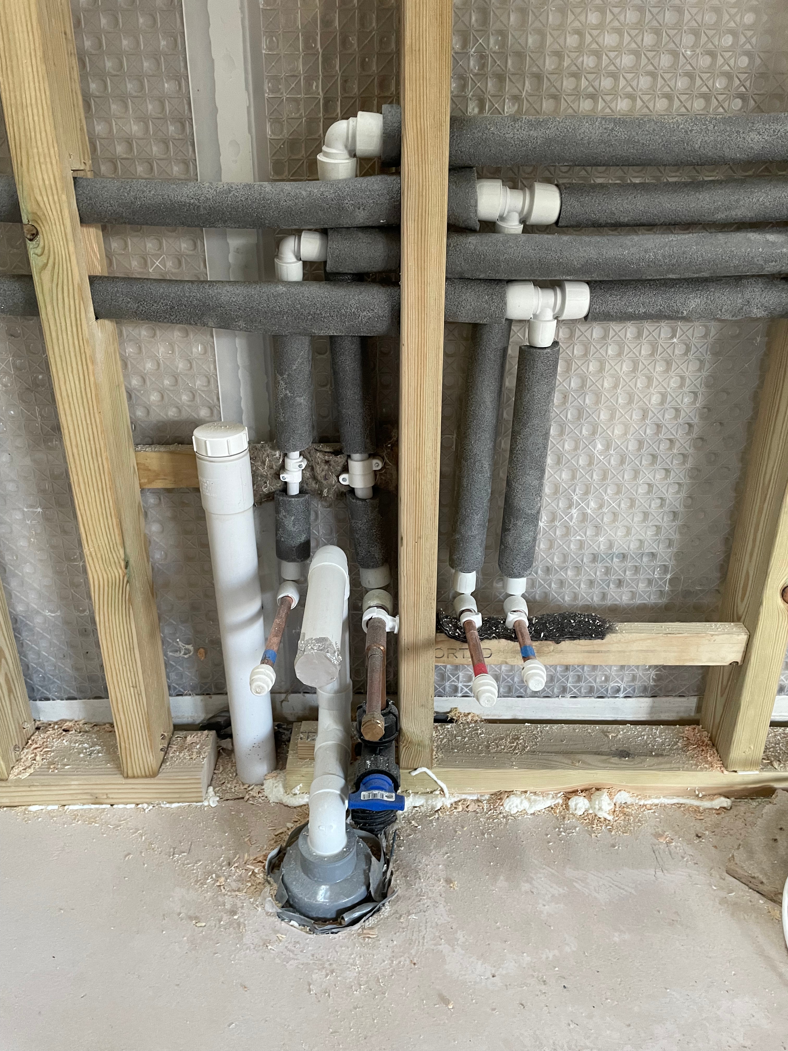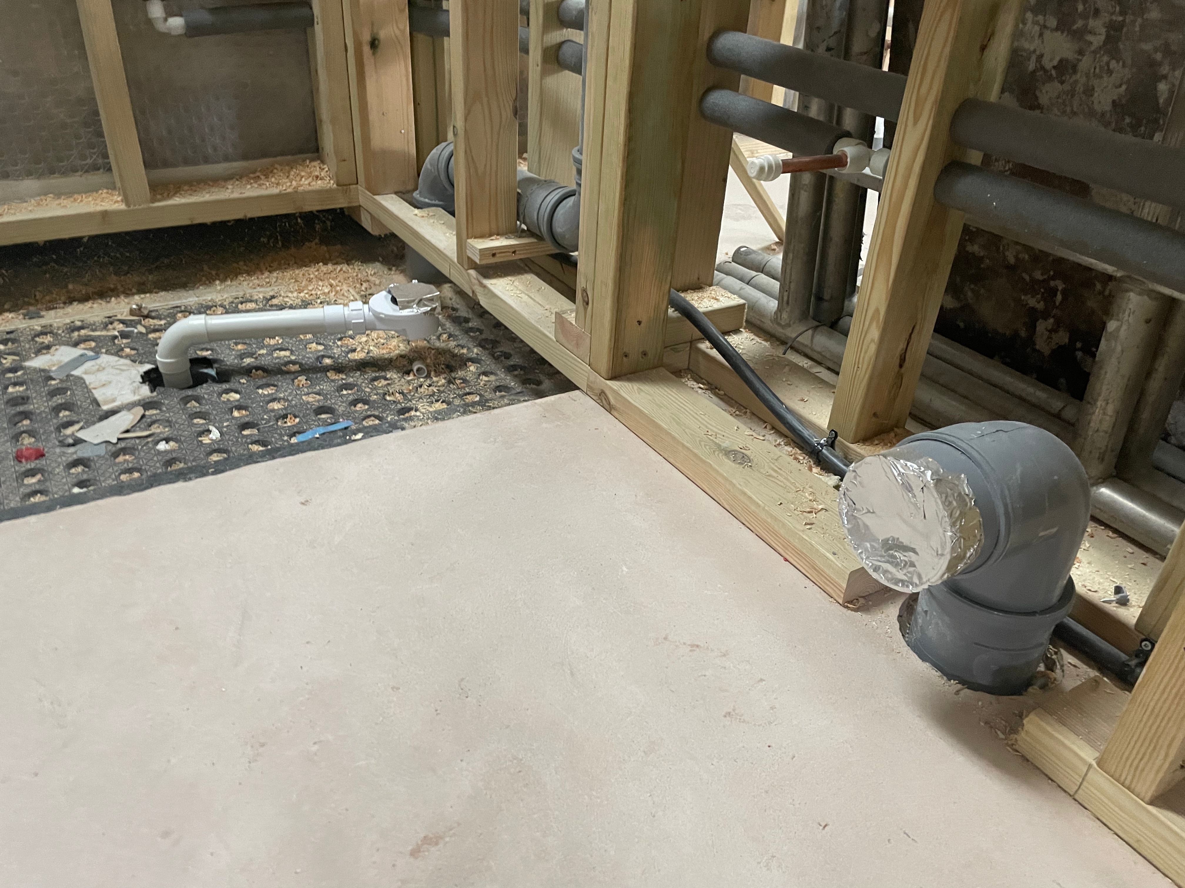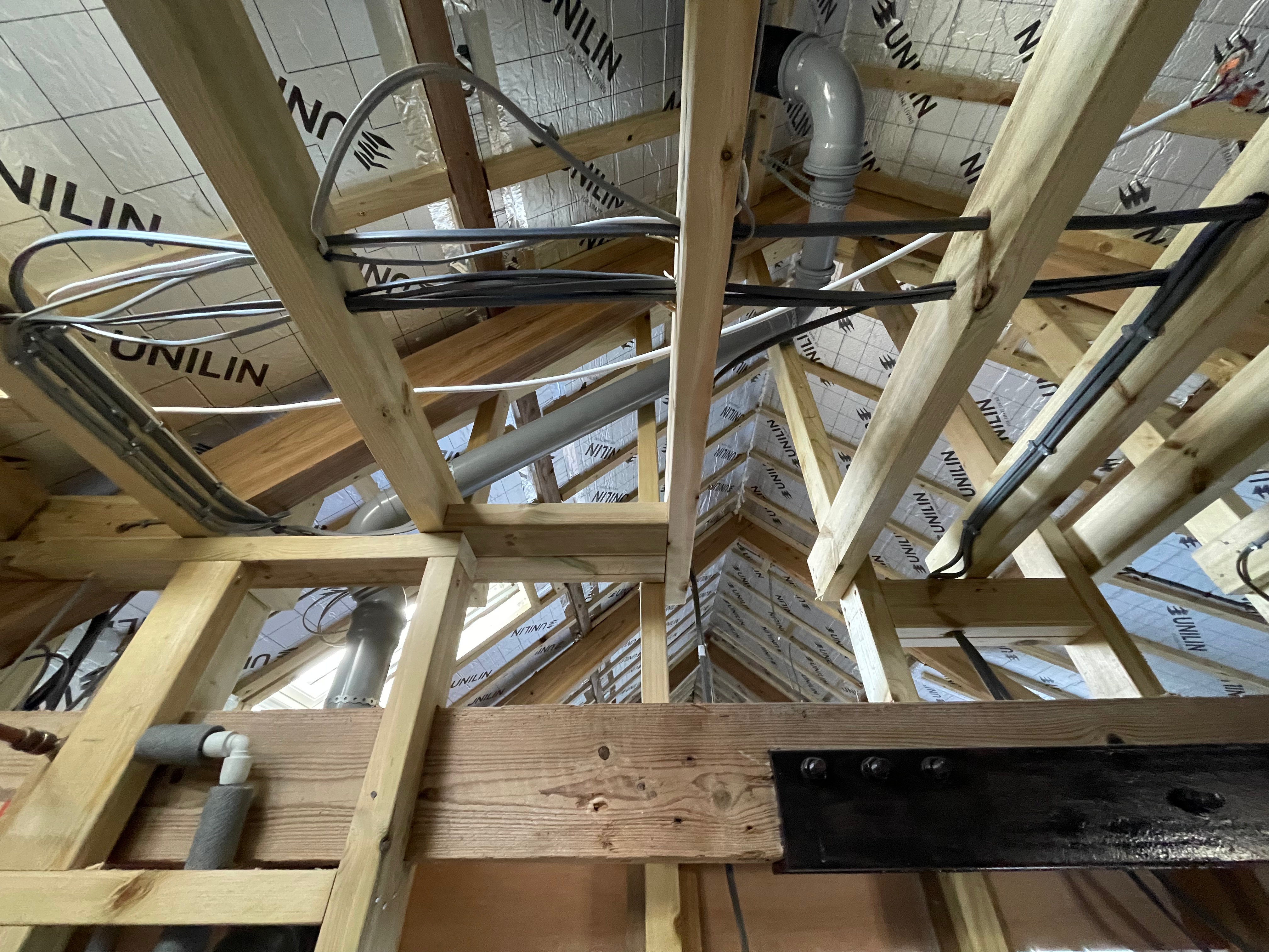 It’s been a busy week for our builders – with three trades on site. The plumbers arrived to do the plumbing first fix in the shower room and the kitchen. We now have pipes running within the stud walls, pipework up to the bottom of the toilet and sink in the bathroom, and the shower controls are in. Dean, our builder, installed the soil vent pipe for the toilet with some impressive manoeuvring required to avoid the structural beam that inconveniently happened to be right in the way! The extra work required to achieve this didn’t get in his way though as he’s now insulated most of the walls as well.