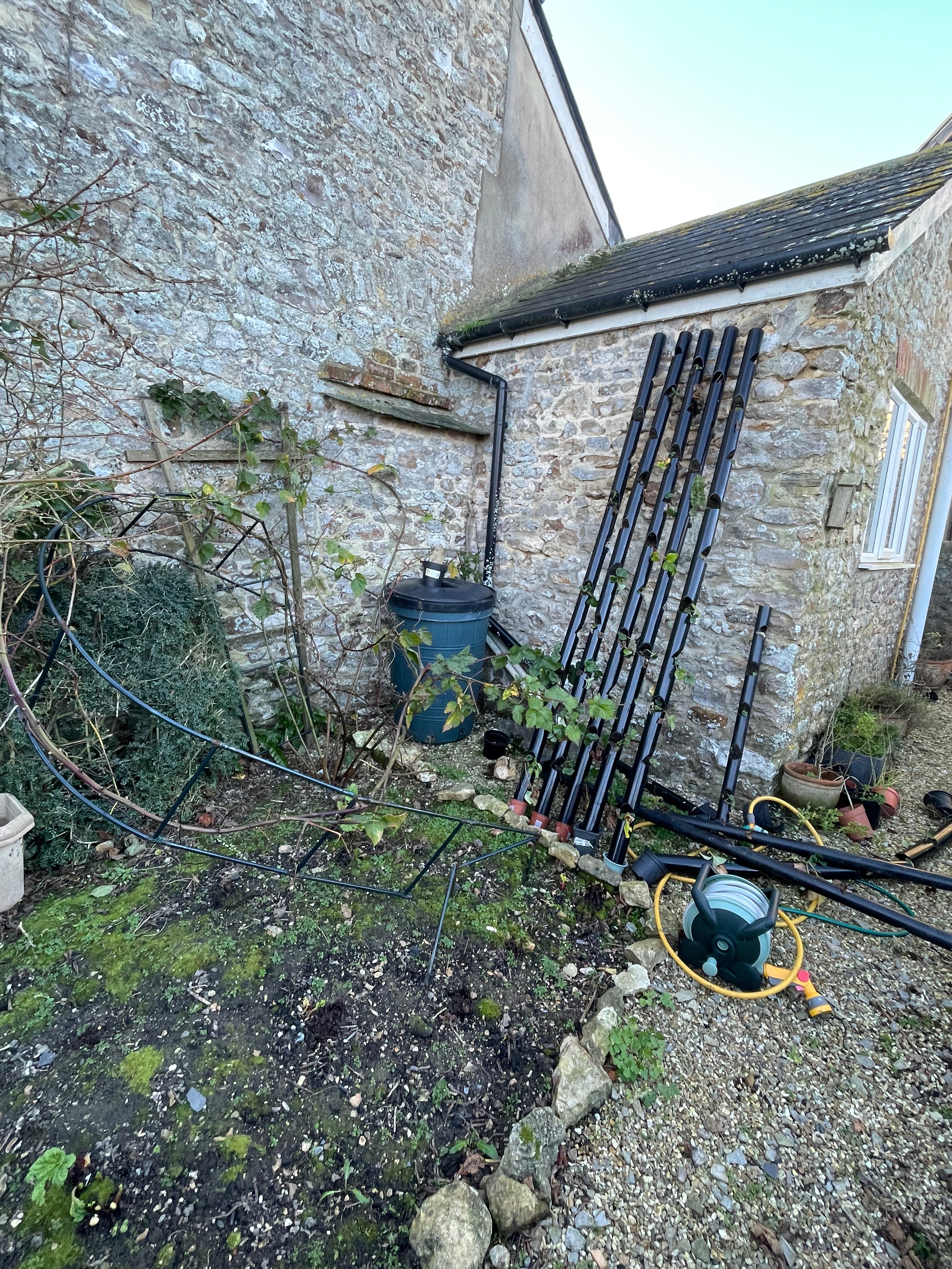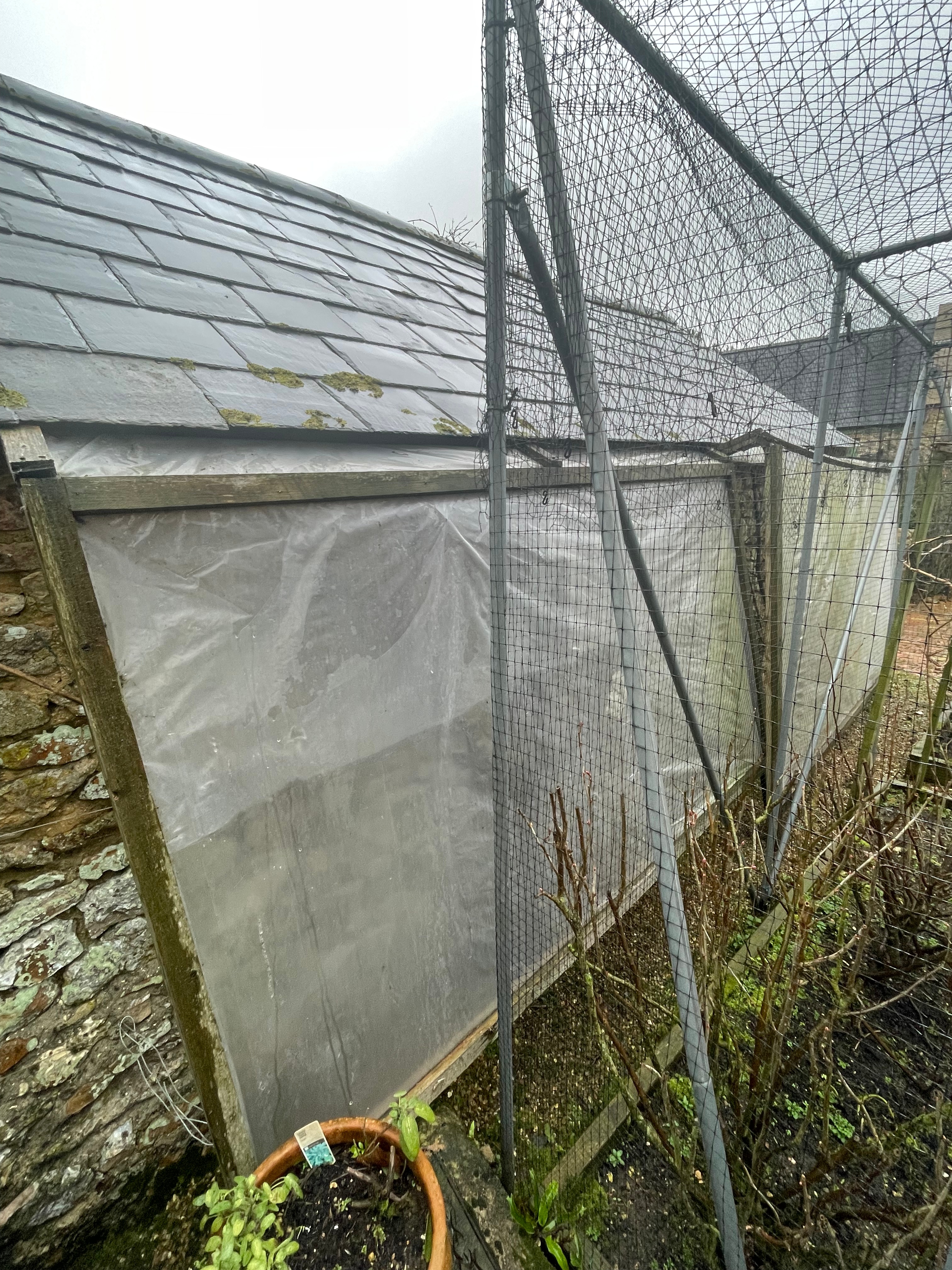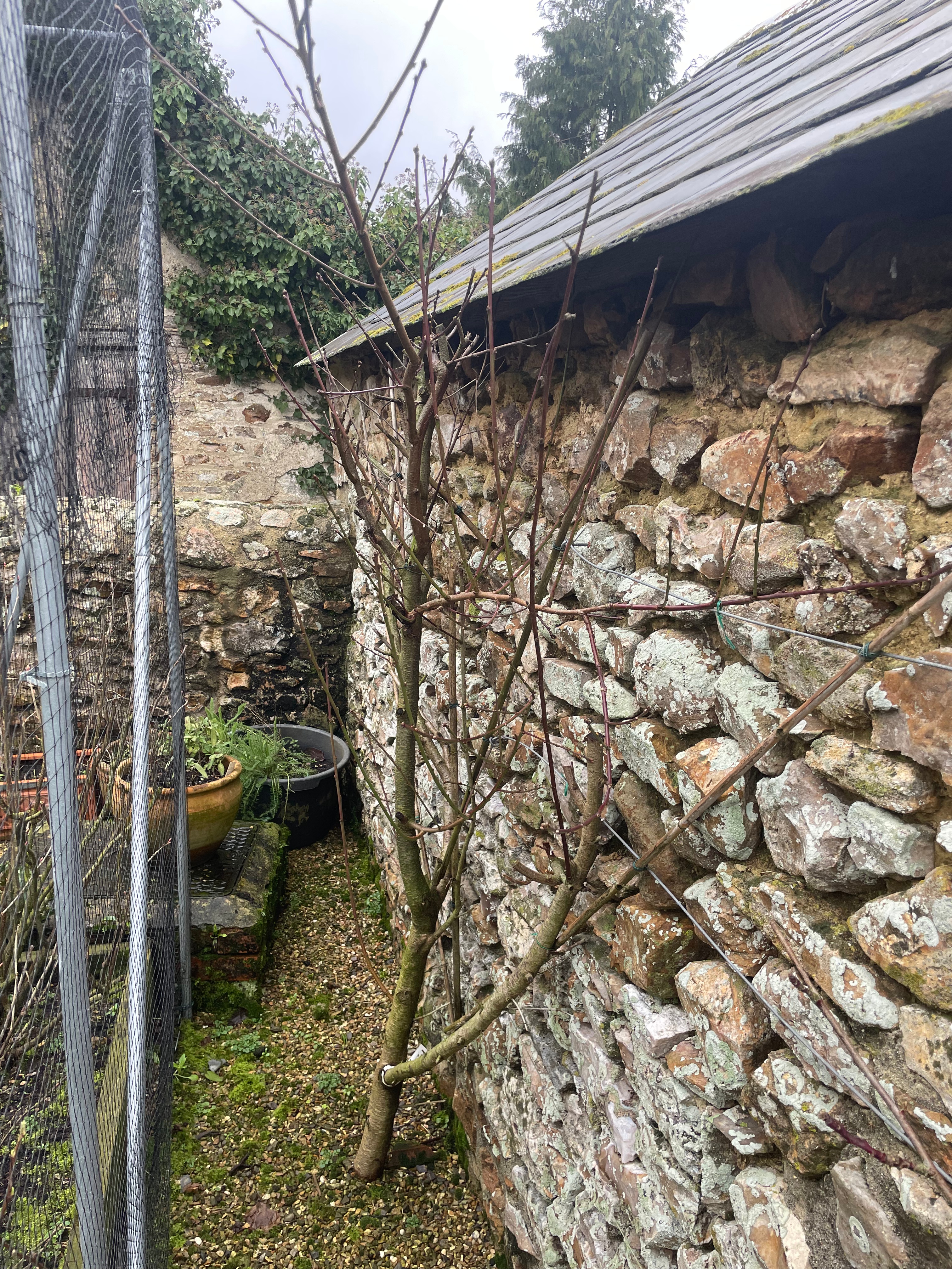 And – hopefully better late than never – we cut back our nectarine and peach trees and covered them with their plastic-covered frames. You’re supposed to cover them in the UK to protect them from rain which can spread peach leaf curl – but we just didn’t get round to it before now (typical since we’ve had rain every day for over a month now). One of the trees already has peach leaf curl so we’re hoping cider vinegar spray and fungicide may help instead… When we got the covers out of storage (between the Farmhouse garden wall and the New Barn we noticed that one of the covers is looking worse for wear. It won’t last another storm so we’re starting to think about how we can redesign the covers to be sturdier and last longer. If anyone ever has very large sheets of plastic then please do save them for us!