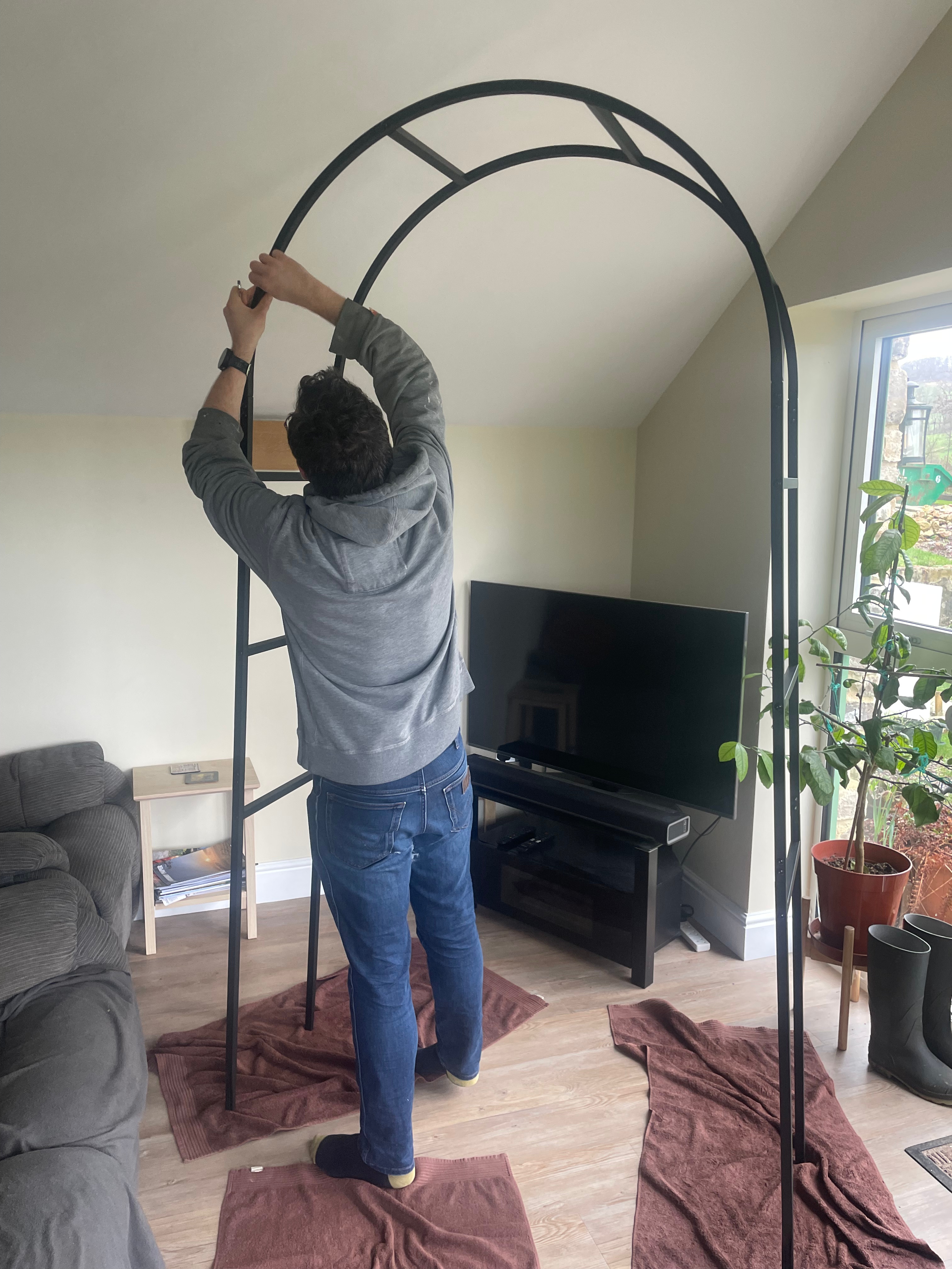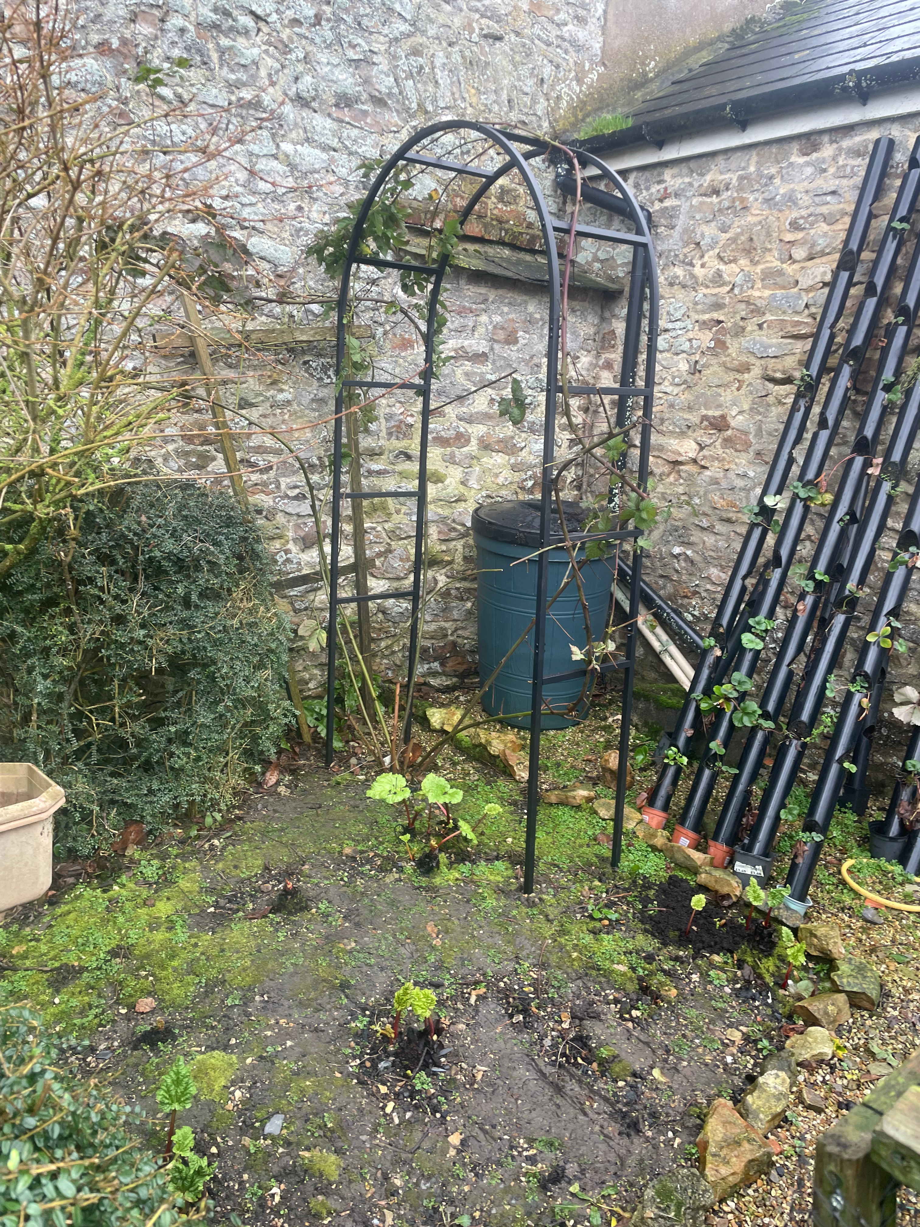We spent the weekend finishing various repair jobs we had around the garden. Our cheap and feeble blackberry arch in the kitchen garden gave up in the Christmas Eve/Day winds and has been collapsed in a pitiful heap since then. So – dodging raindrops again – the first thing on the list was to replace that with a sturdier version. We now use Tom Chambers arches which are so much better and not hideously expensive if you manage to get them in a sale. It was interesting though trying to build it in the lounge while we waited for the shower to pass – arches are so much bigger than they seem once they’re in position.