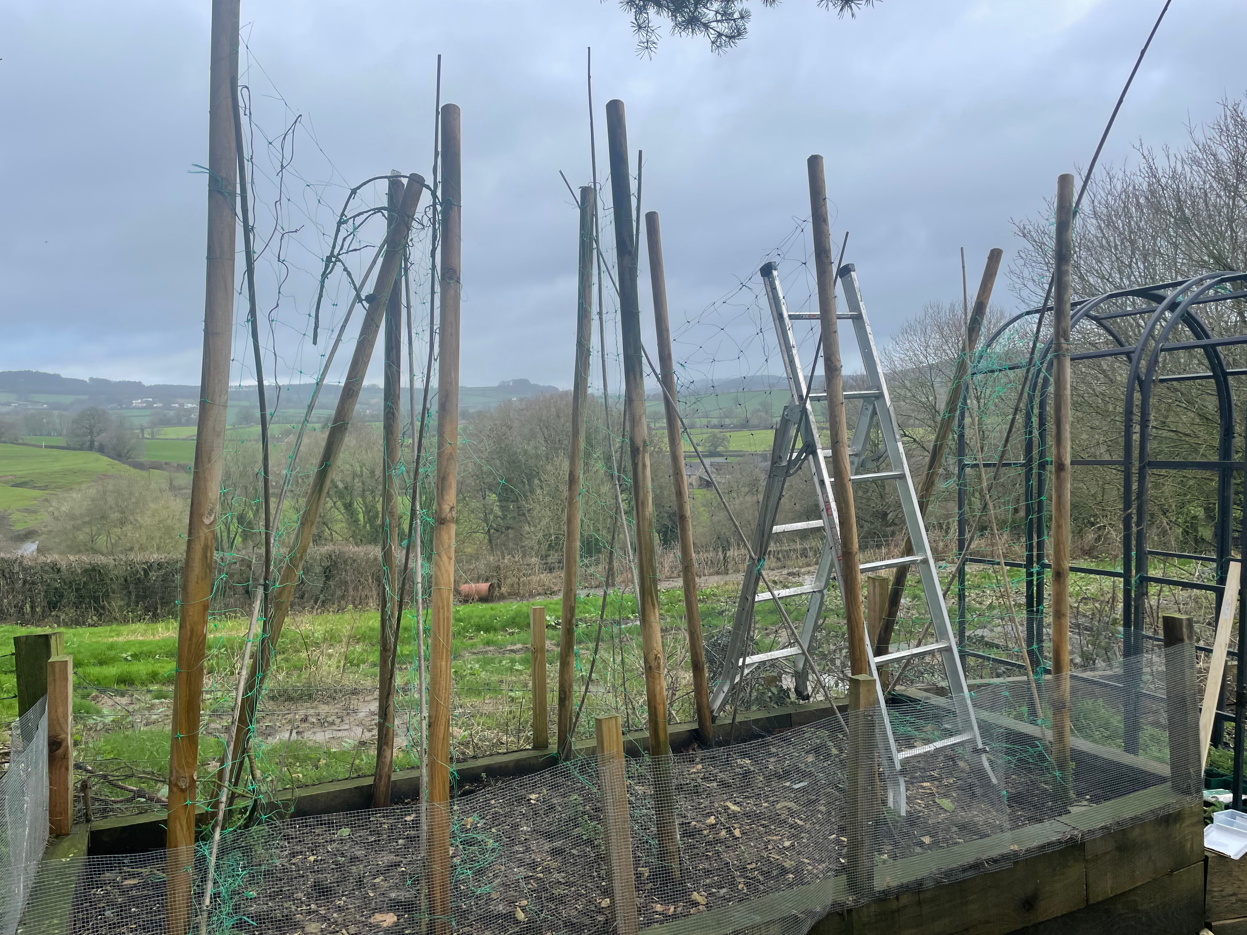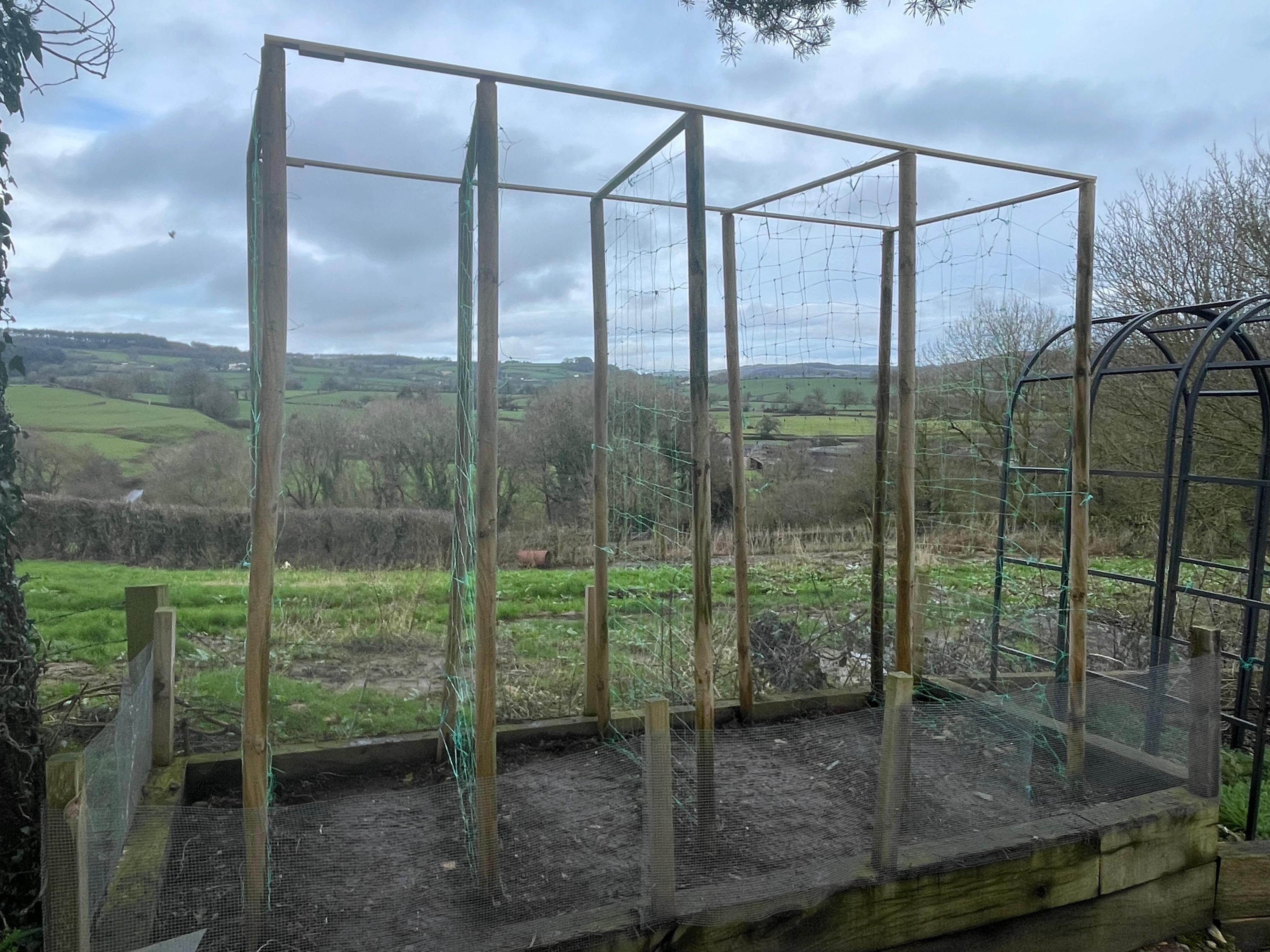 We also repaired our pea & bean frames after a design flaw left them unable to cope with winds while covered in vegetation. Instead of just having poles in the ground with netting inbetween we have now added a top frame to keep everything in position. It’s a much more solid structure – even if some of the poles are slightly wonky where we didn’t position them exactly equidistant from each other. We also tidied up the netting so it’s tighter and will help the plants grow up. It looks so much better, I’m getting excited for Spring now and for getting seeds planted.