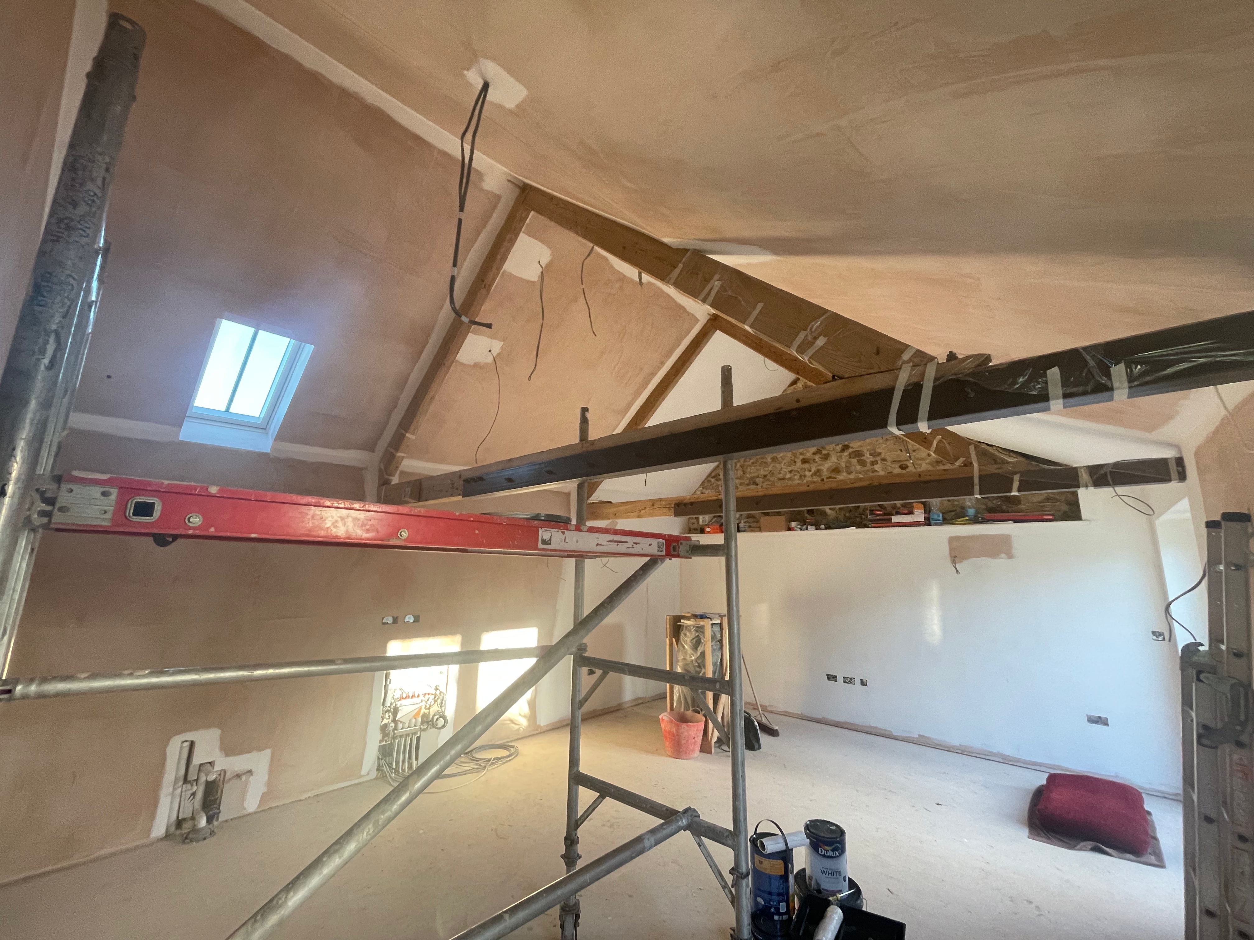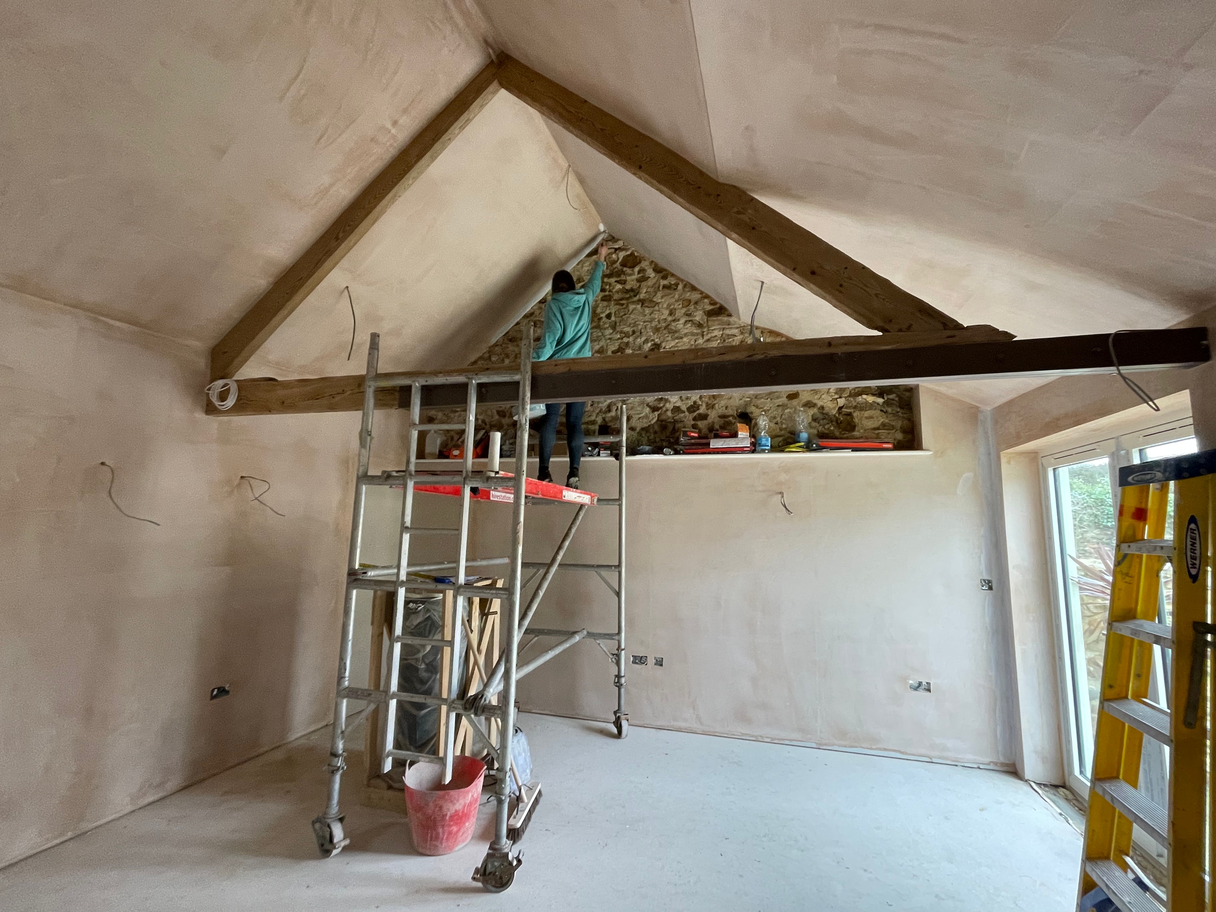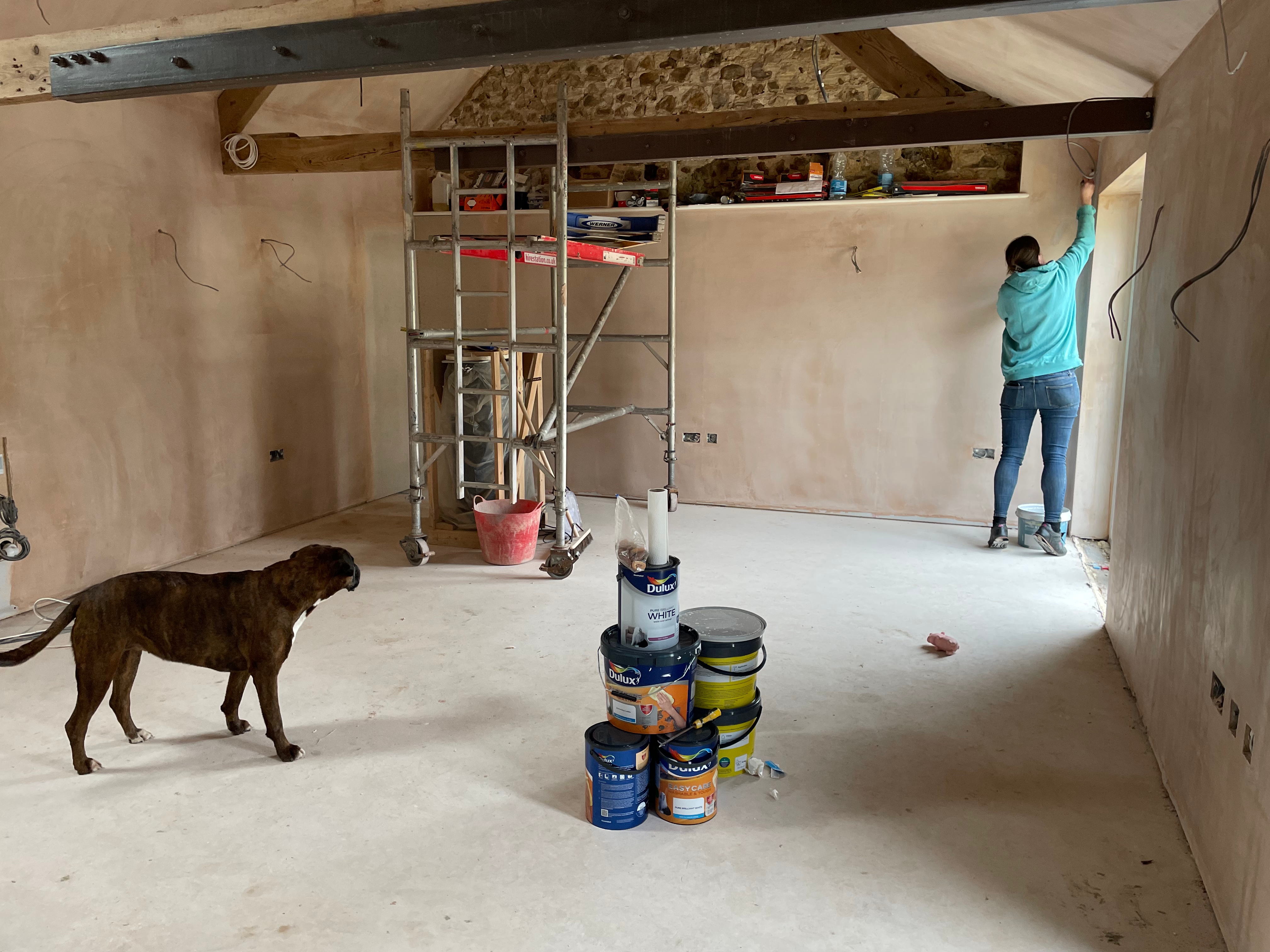If last week felt quiet in terms of progress then this week seems to have disappeared under a pile of jobs. We took the plunge and started decorating in the Cow Shed – John spent the week moving the builders’ equipment into the shower room to make more space and then wiped the walls down to get rid of the building dust. We then started priming the bare plaster ahead of properly painting. We split the painting between us – I do the edging and John rolls. I managed to get all the edging done (bar the bathroom) but a last minute midweek booking for Monday meant that John spent Sunday doing a changeover in the Farmhouse so only got a third of the living space rolled. The hardest part is starting though! We have a busy few weekends coming up so will only make limited progress for a while now.