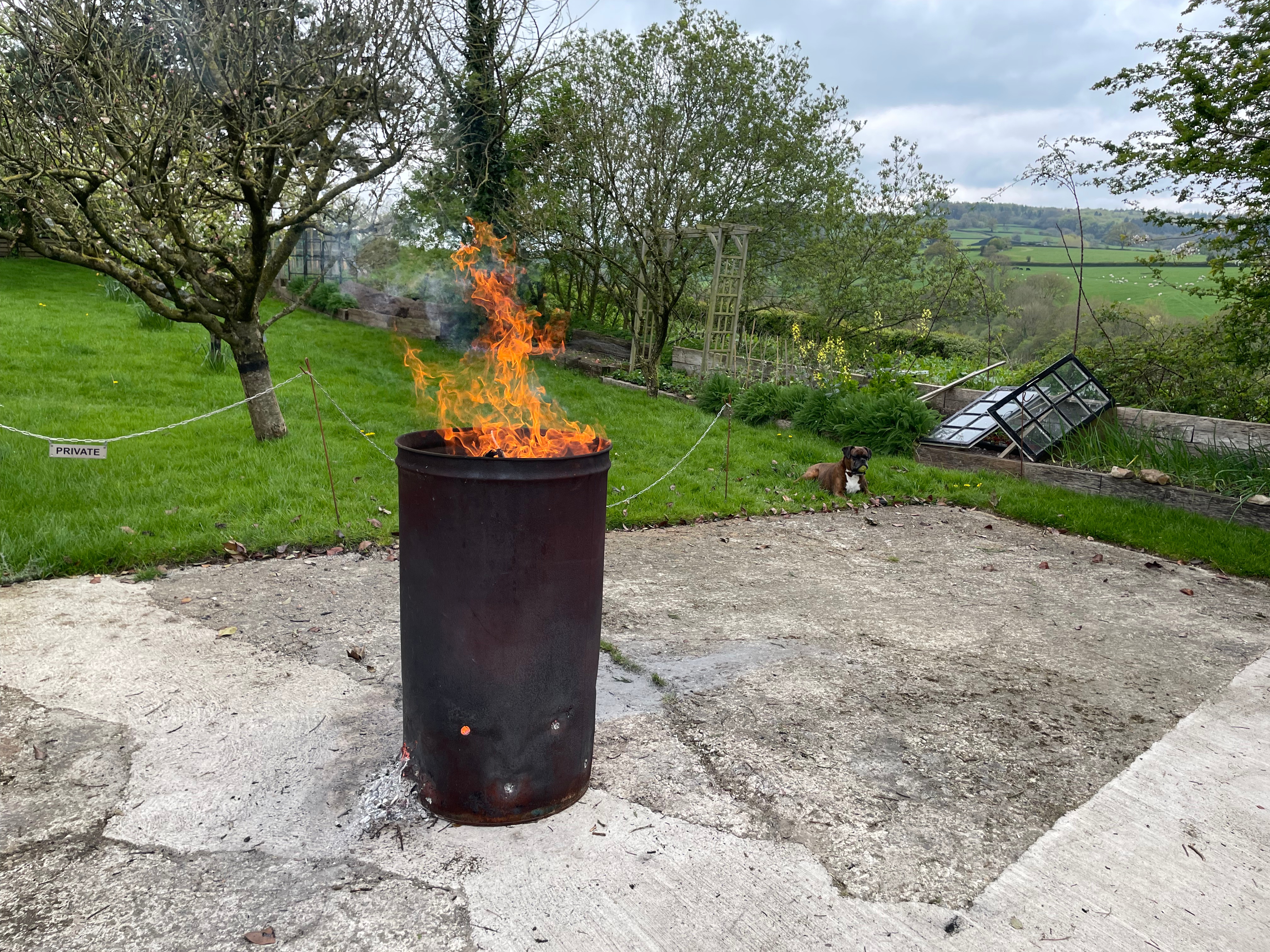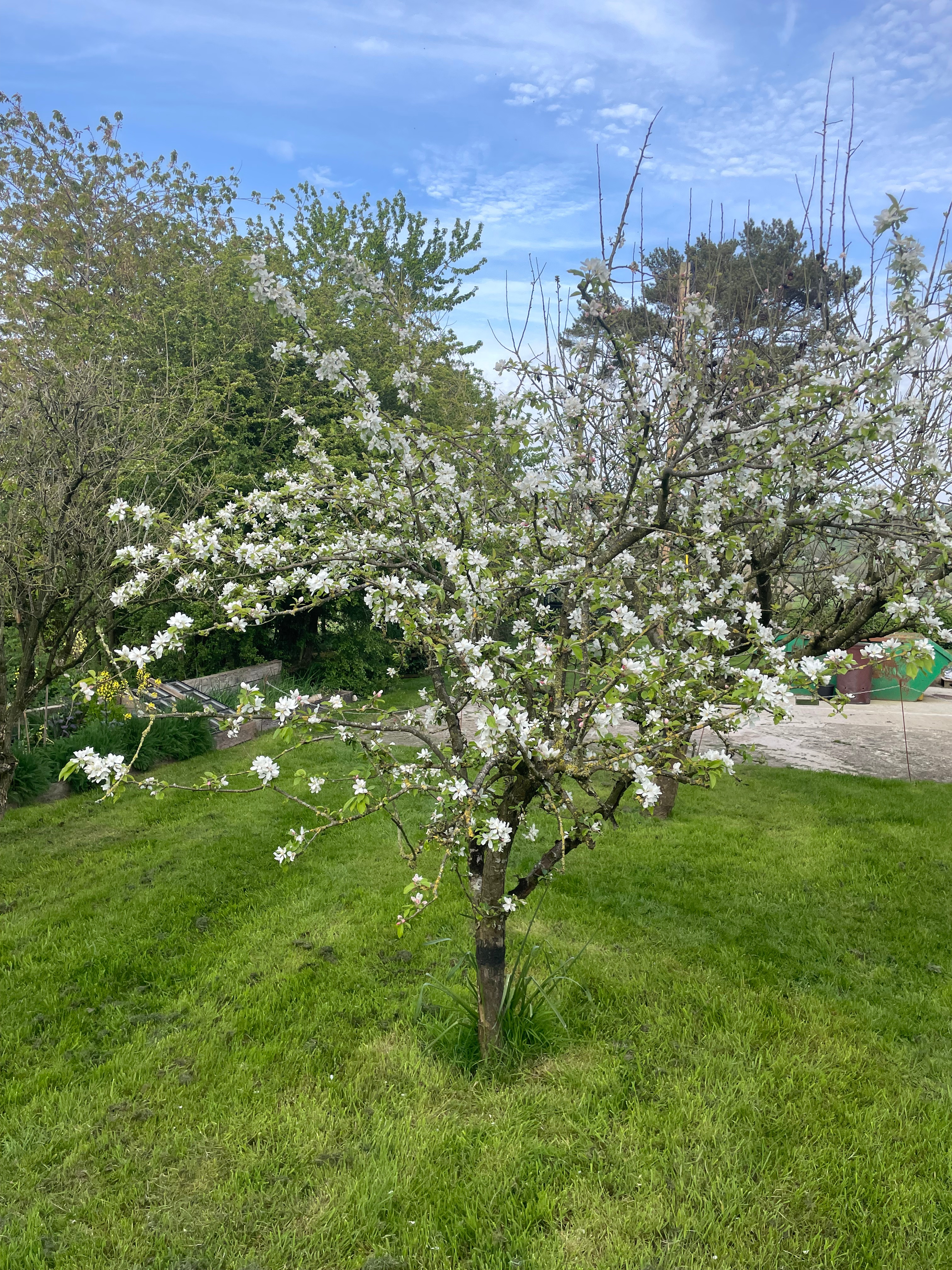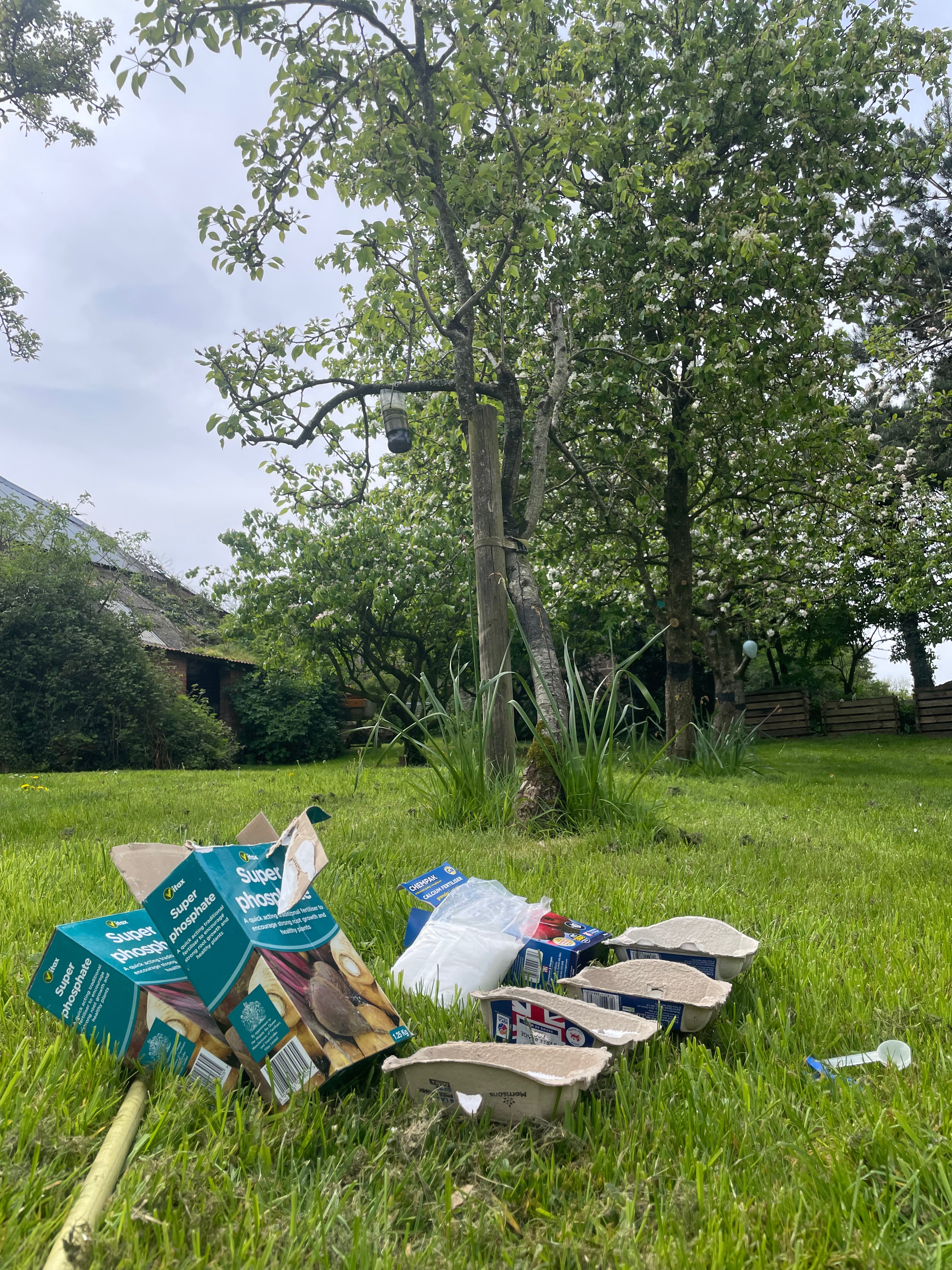 We finally got round to feeding the fruit trees with calcium and superphosphate – arguably a couple of months later than you’re supposed to. The blossom on the plum and pear trees seems to have come and gone with tiny fruits now forming; while the apple trees still have some blossom on – hopefully there’s still time for the nutrients to have some effect. And John has finished the last of the incinerator pile left from our winter pruning – although we have several trees that have died and need cutting back, so I’m sure we’ll end up creating a new pile soon.