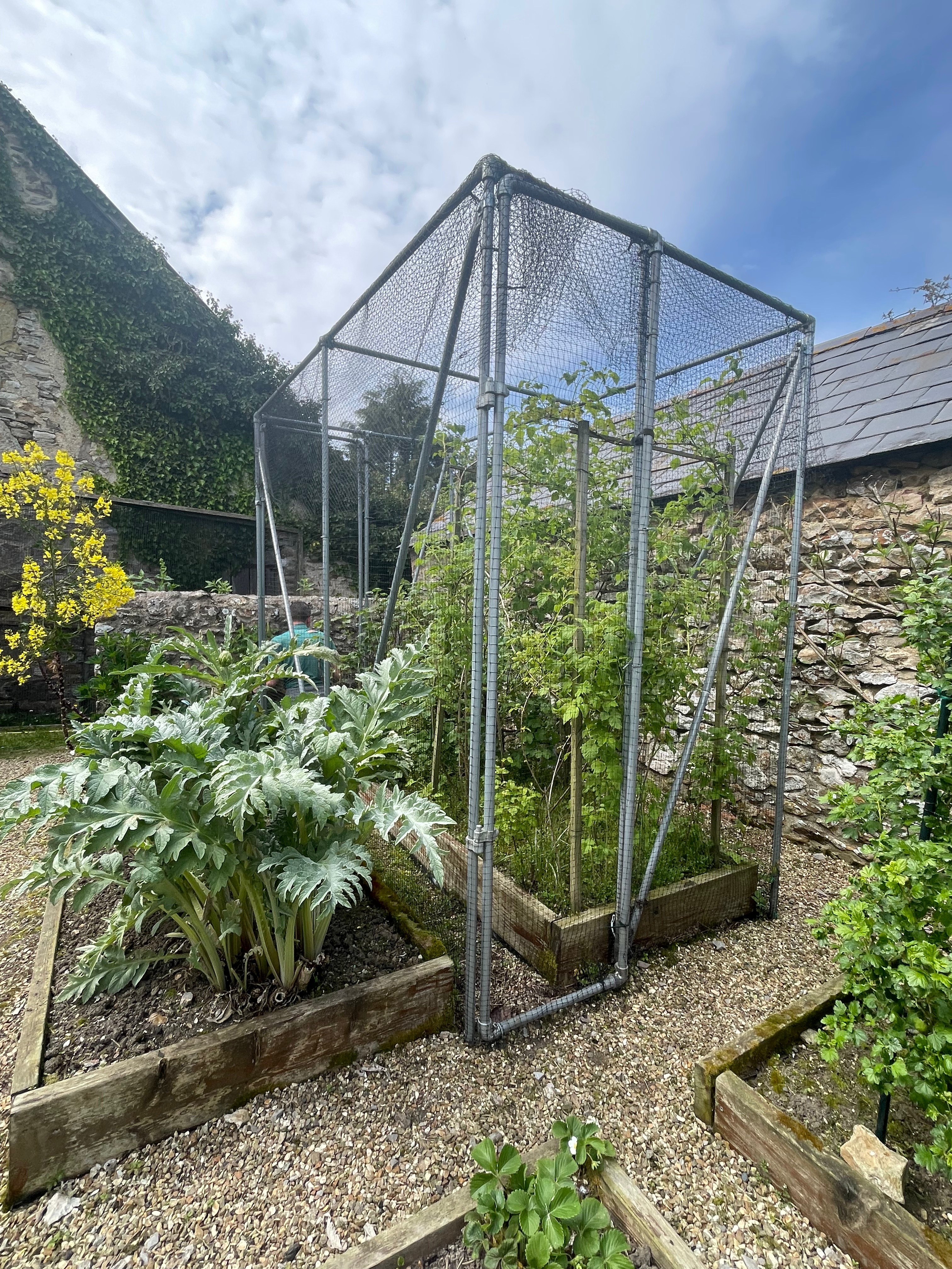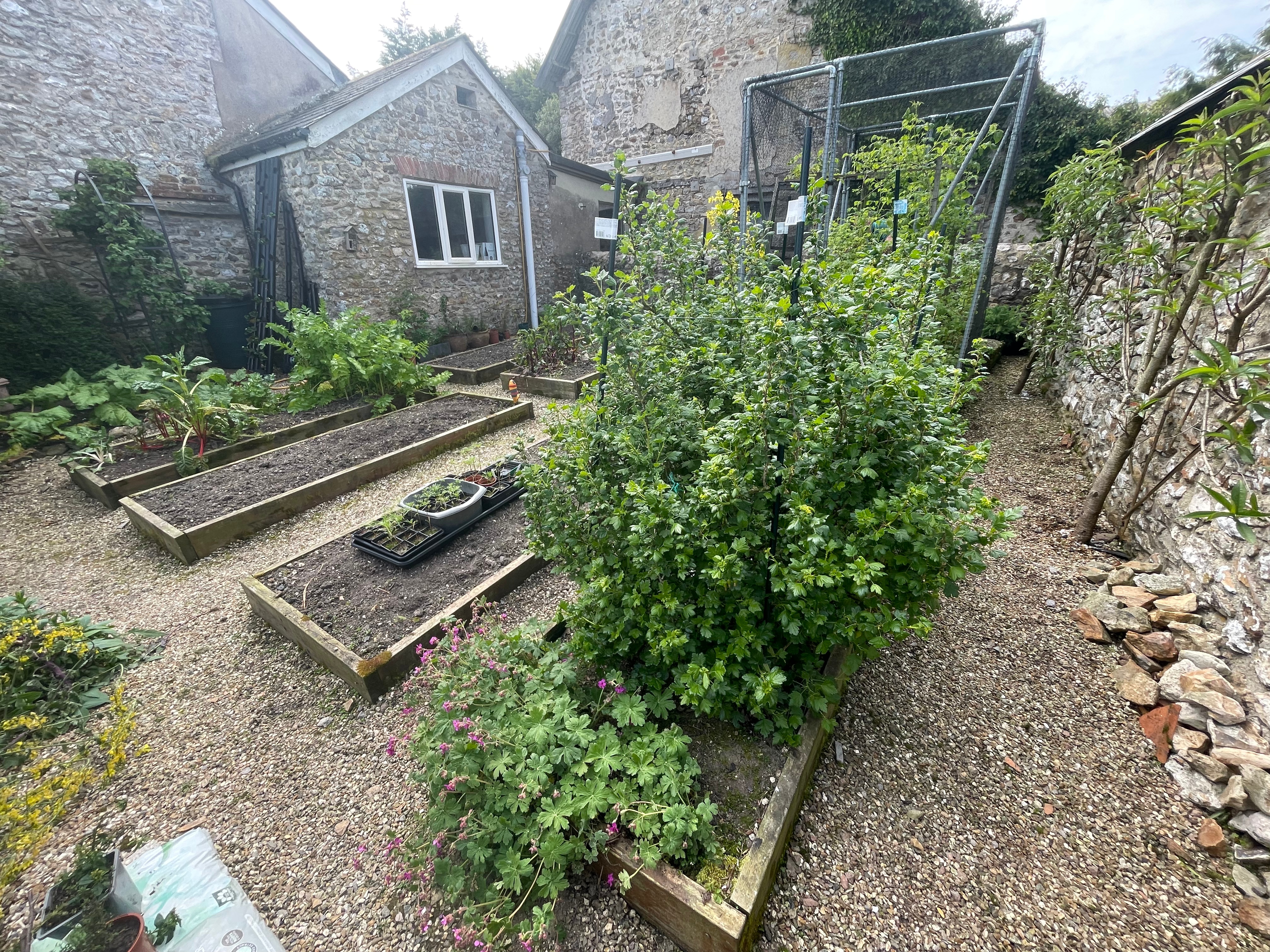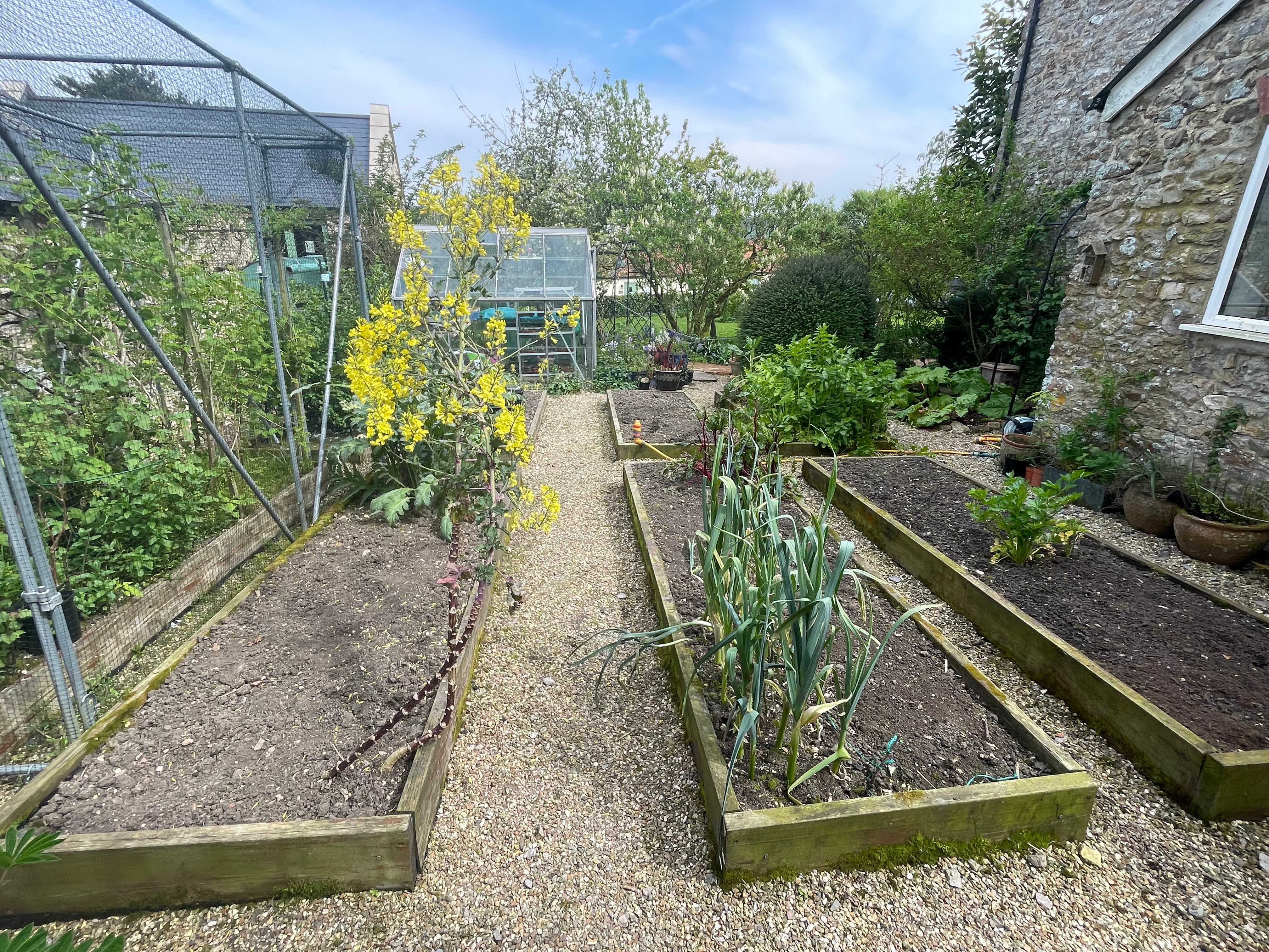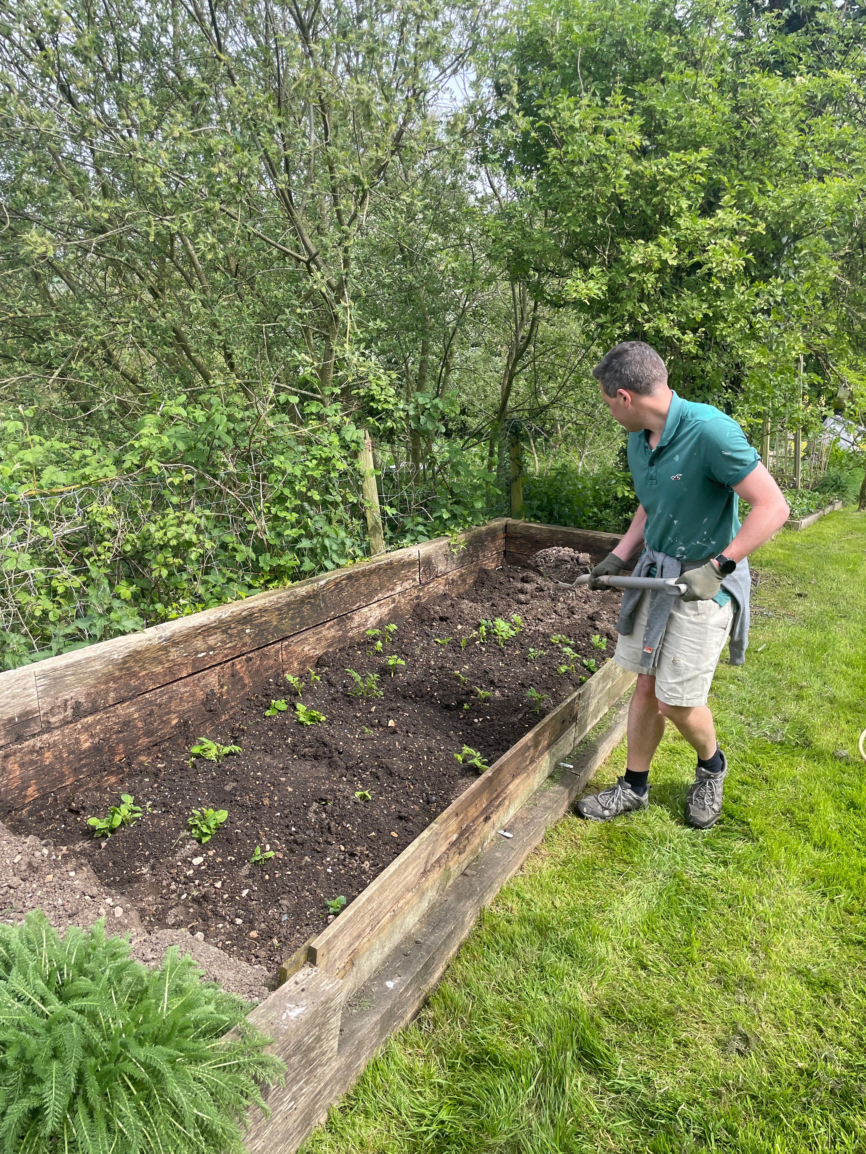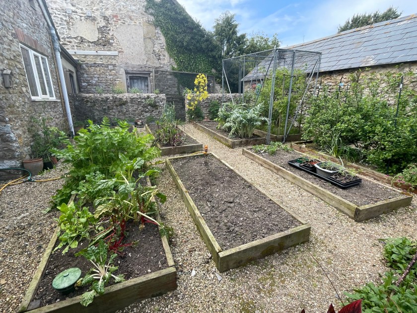 Our big achievement this week was weeding almost all of the kitchen garden. John has done an incredible job and cleared almost everything except in the fruit cage, which means we can now see (and finish) the crops left over from last year and get ready to plant the new seedlings out. It looks so much better! And he found time to top up the potato bed too – it’s always a job that creeps up on us and more so with all the sun we’ve had recently.