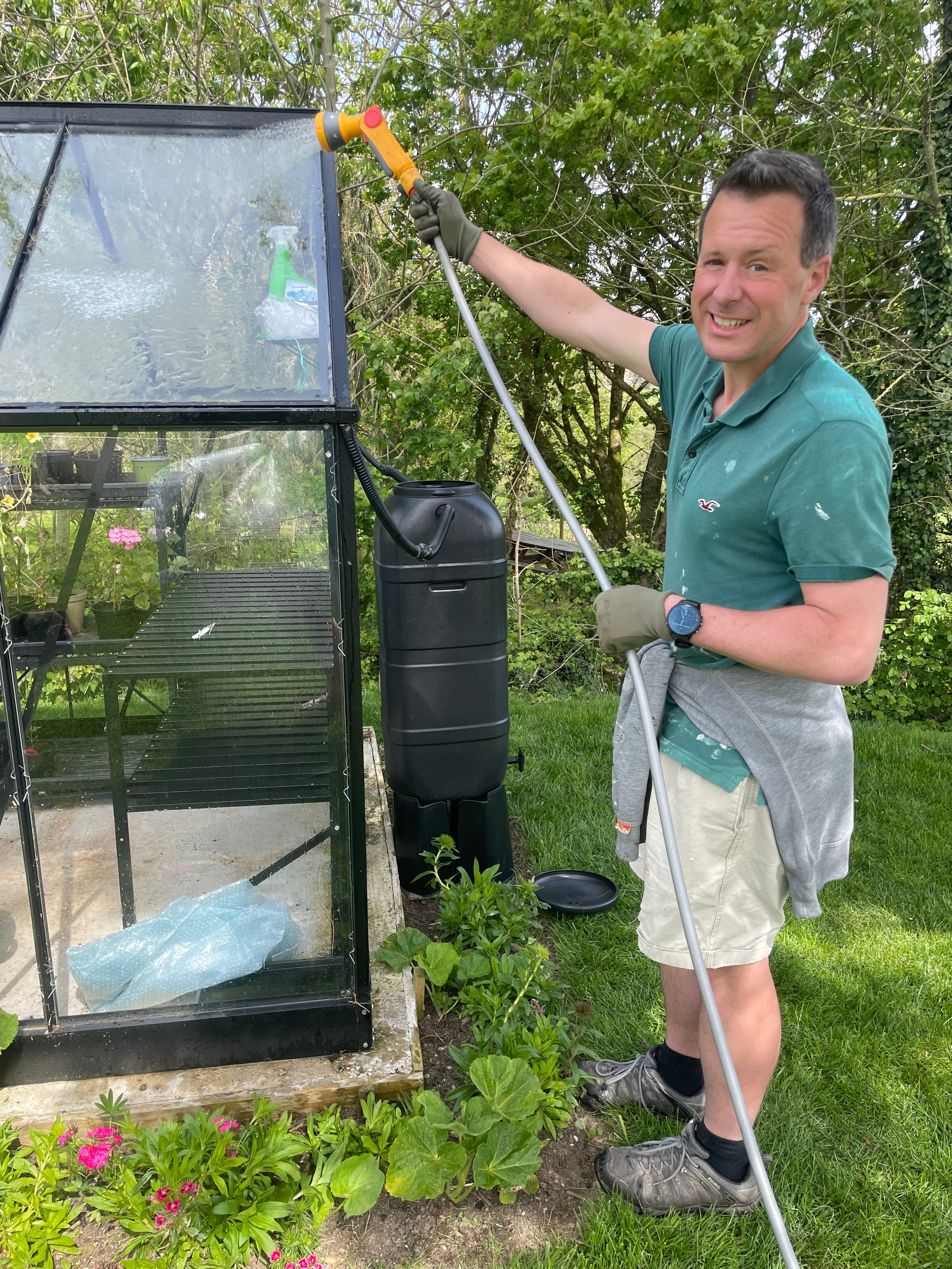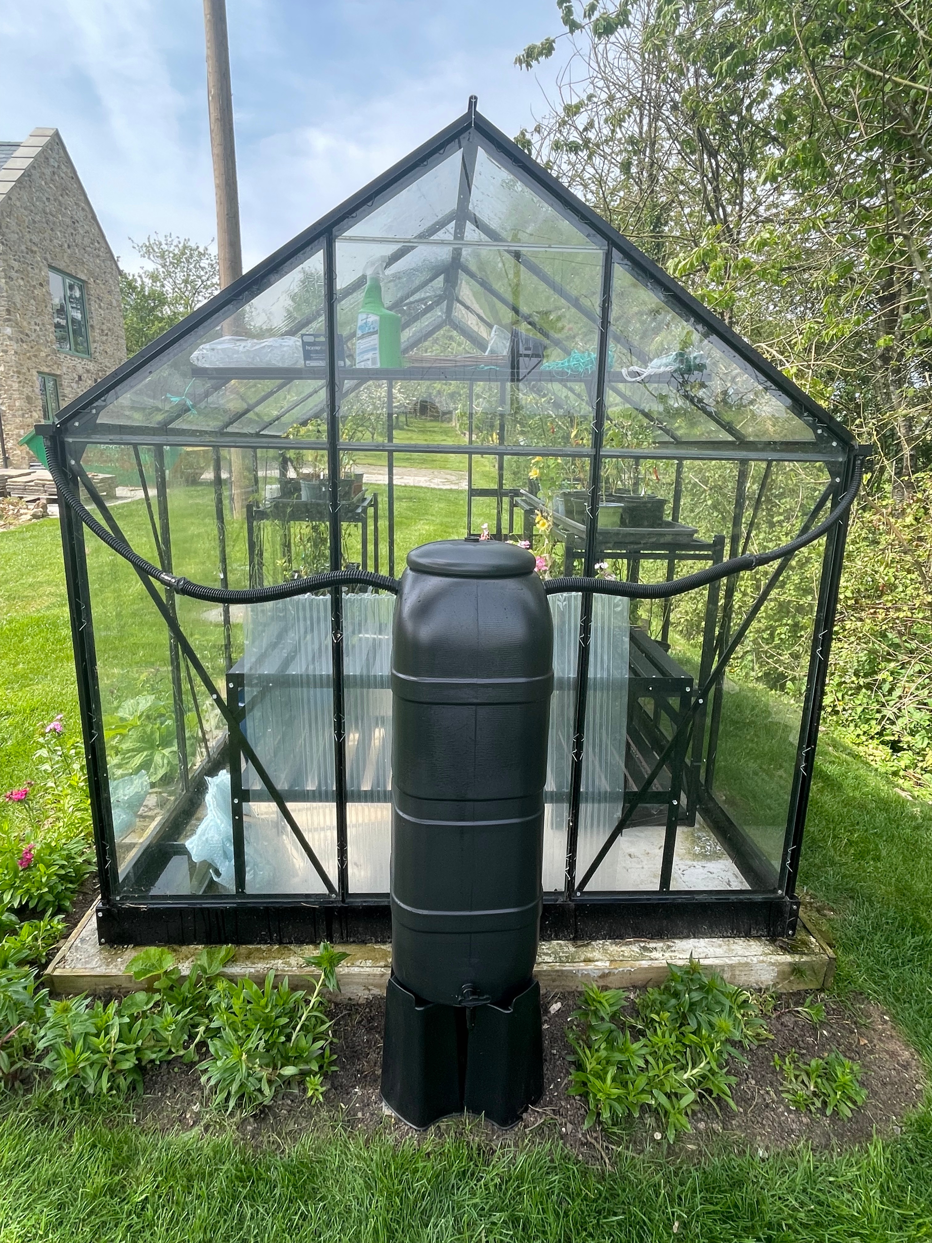 Our chilli (and now aubergine) greenhouse has a new water butt – the gutters were leaking into the greenhouse so we’ve installed a water butt to try and divert the water and make it usable. It’s a little rustic-looking and has made good use of gaffer tape where the connecting hoses change dimension but John tried it with the hose and so far so good – no leaks inside and the butt is actually filling up. Typical we do this when there’s no rain in the foreseeable forecast – at least it’s done now.