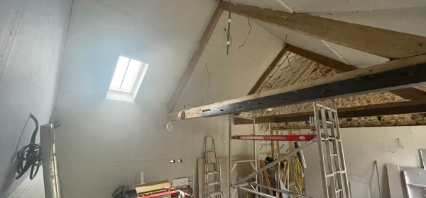 Work is progressing quickly in the Cow Shed. Our builder has been installing the plasterboard on the walls and the ceiling – so far he’s covered most of the ensuite, the entrance to