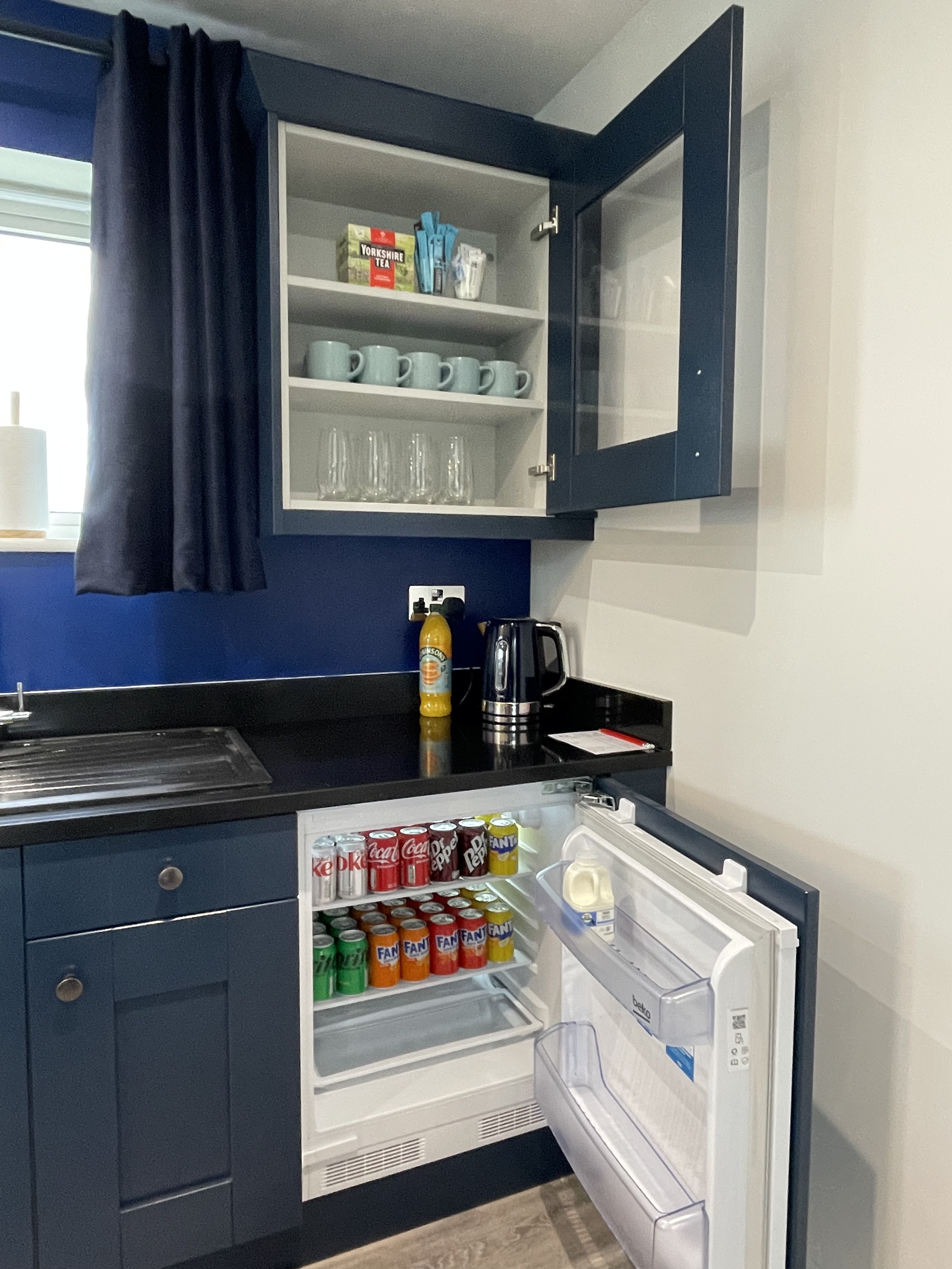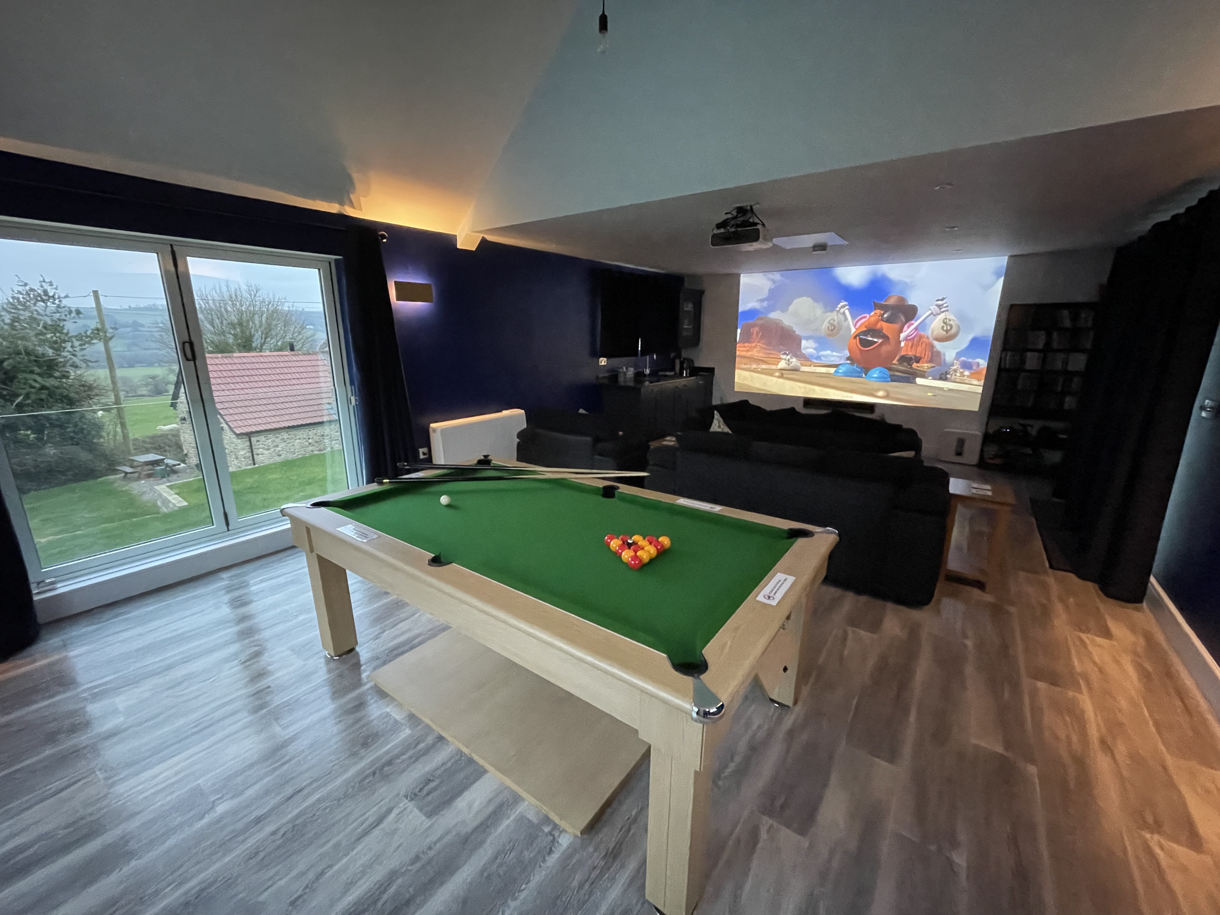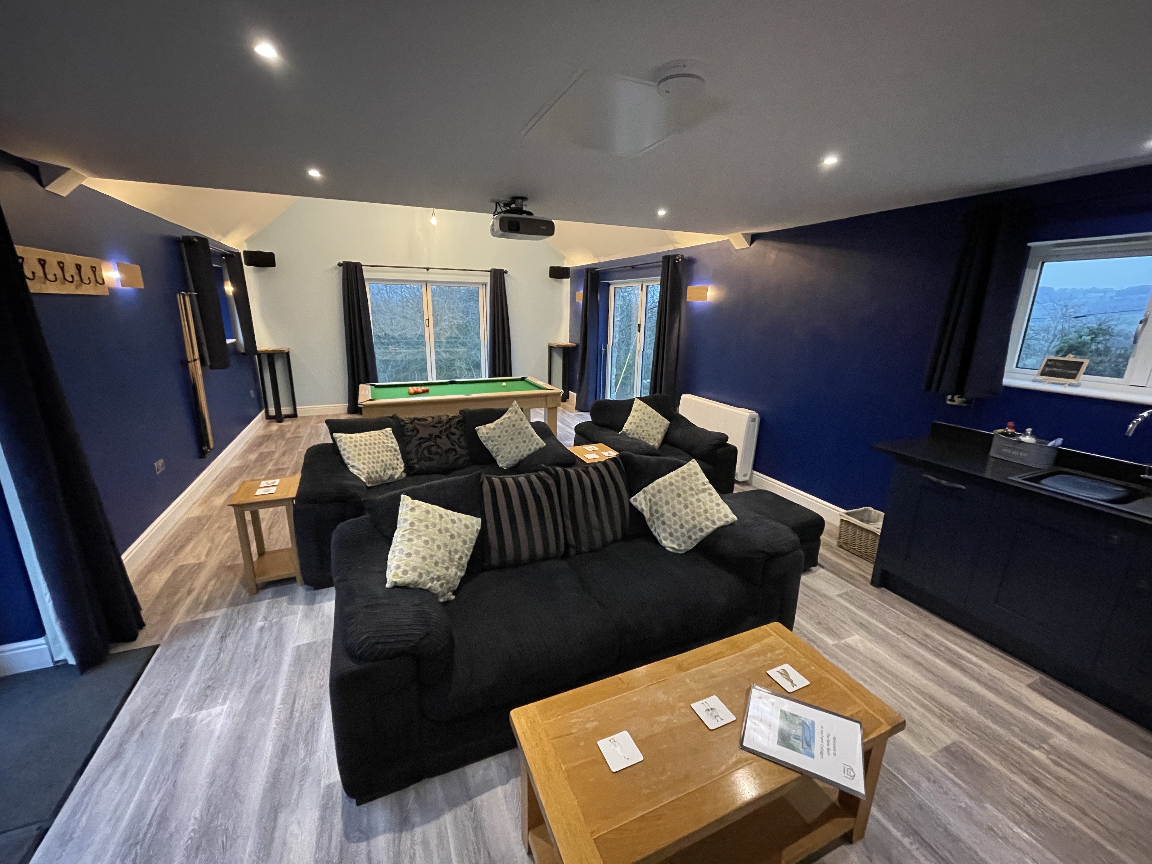 The New Barn Games Room is a communal space for all of our guests to enjoy. It contains a pool table and a home cinema, complete with the ability to link it to a streaming account or to choose from a range of DVDs. Alternatively guests can use a Playstation 3 connected to the home entertainment system. A kitchenette provides tea and coffee, and has an honesty-operated fridge stocked with soft drinks.