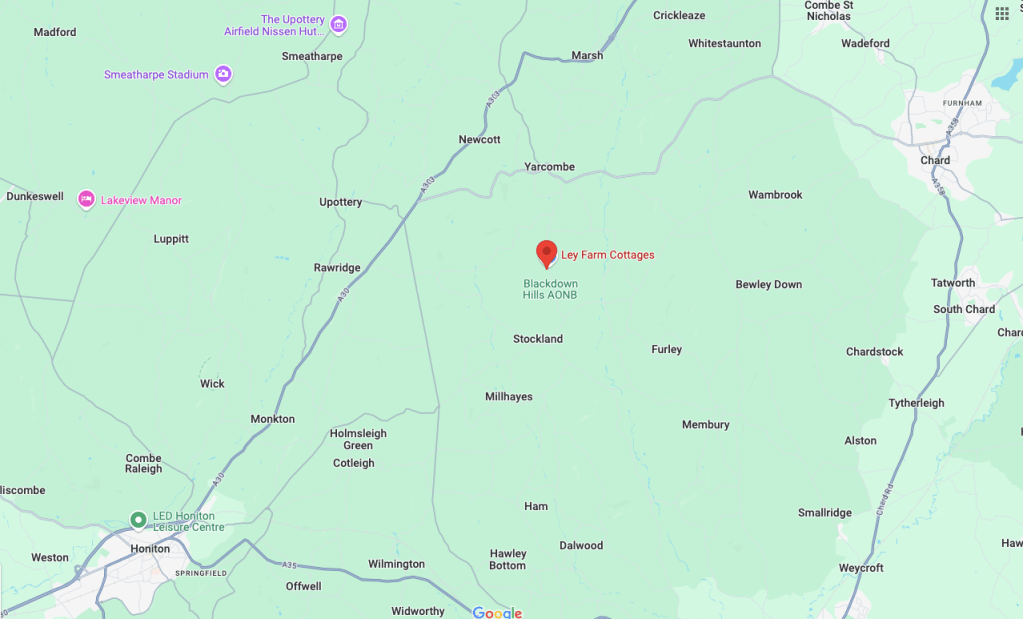 Please note – at any point if your sat nav tries to take you along Witch Lane (on the same side of the lane as Ley Farm Cottages and between us and Stockland) we recommend ignoring it!! This lane is not suitable for most motor vehicles.